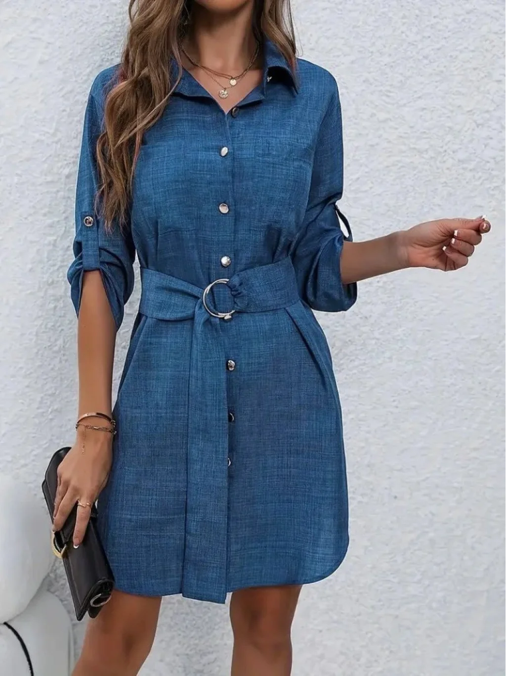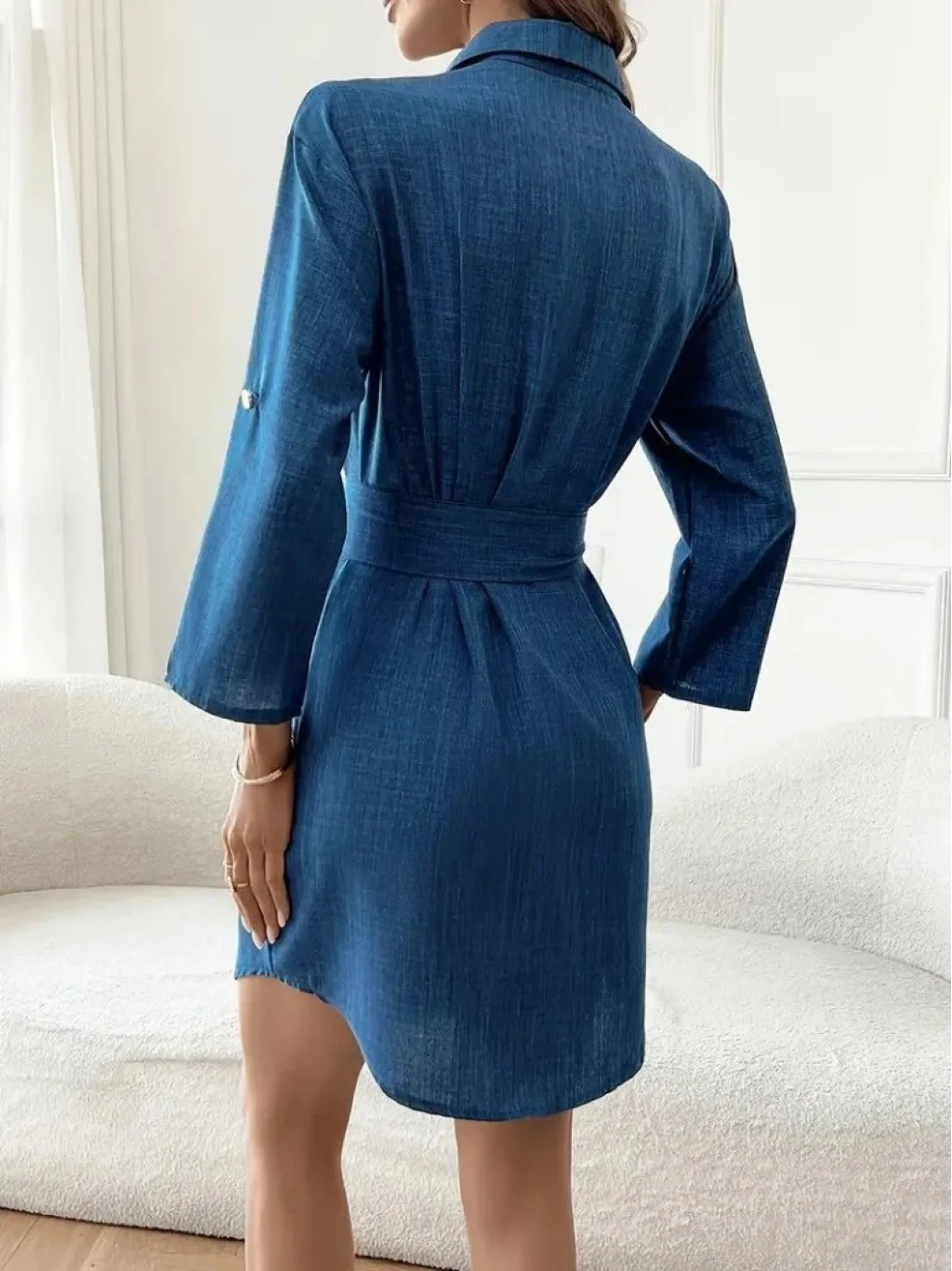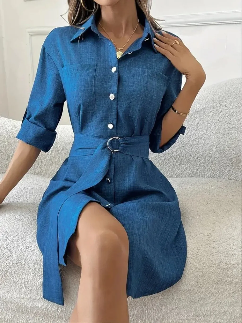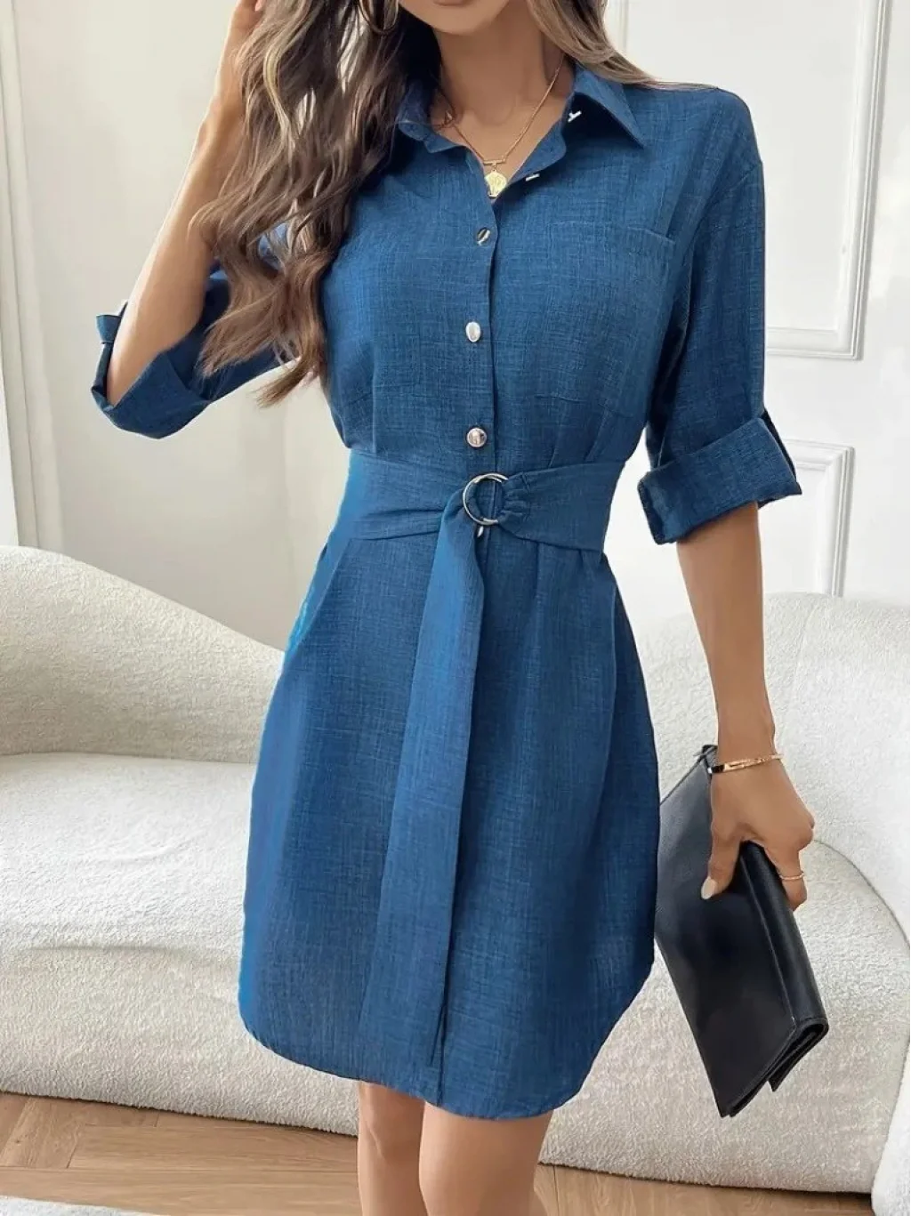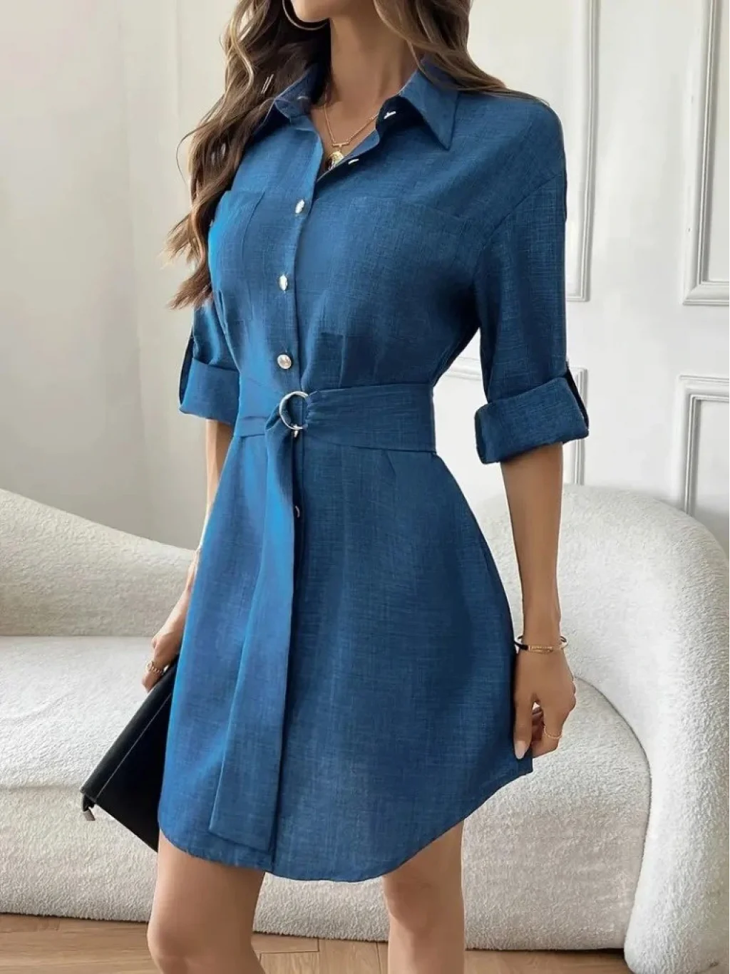 Kadın Uzun Kollu Yakalı önden Düğmeli Beli Kuşaklı Mini Ithal Keten Elbise