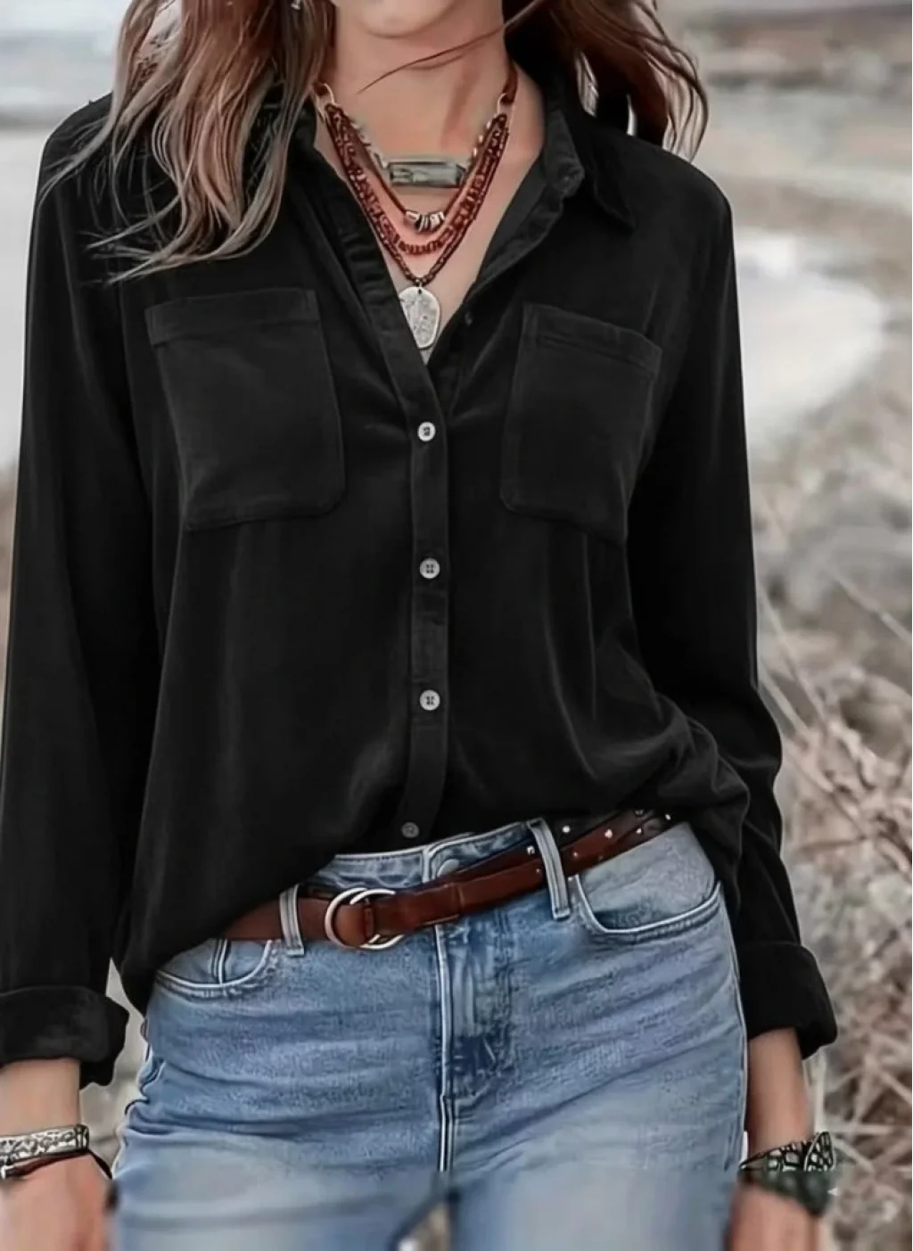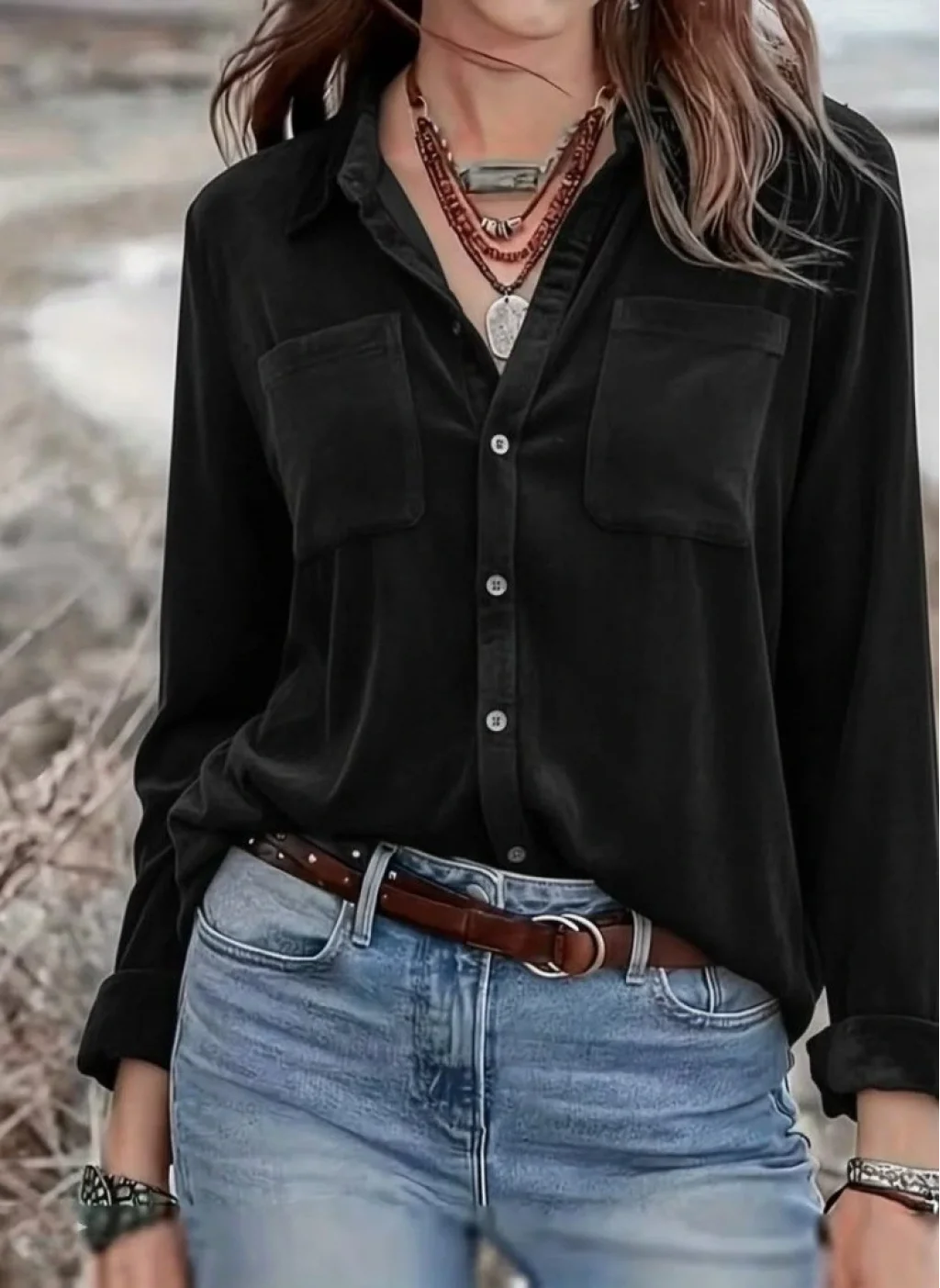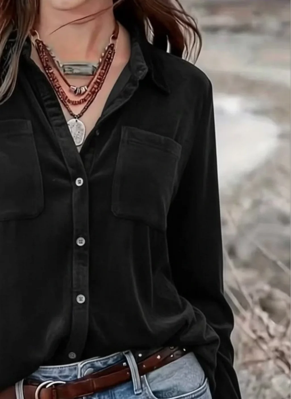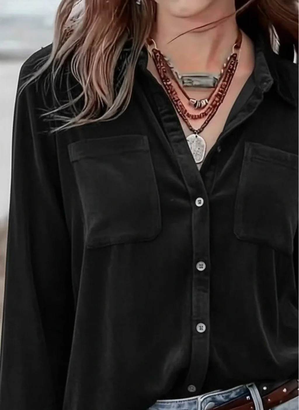 Kadın Uzun Kollu Yakalı önden Düğmeli Cep Detaylı Kadife Gömlek