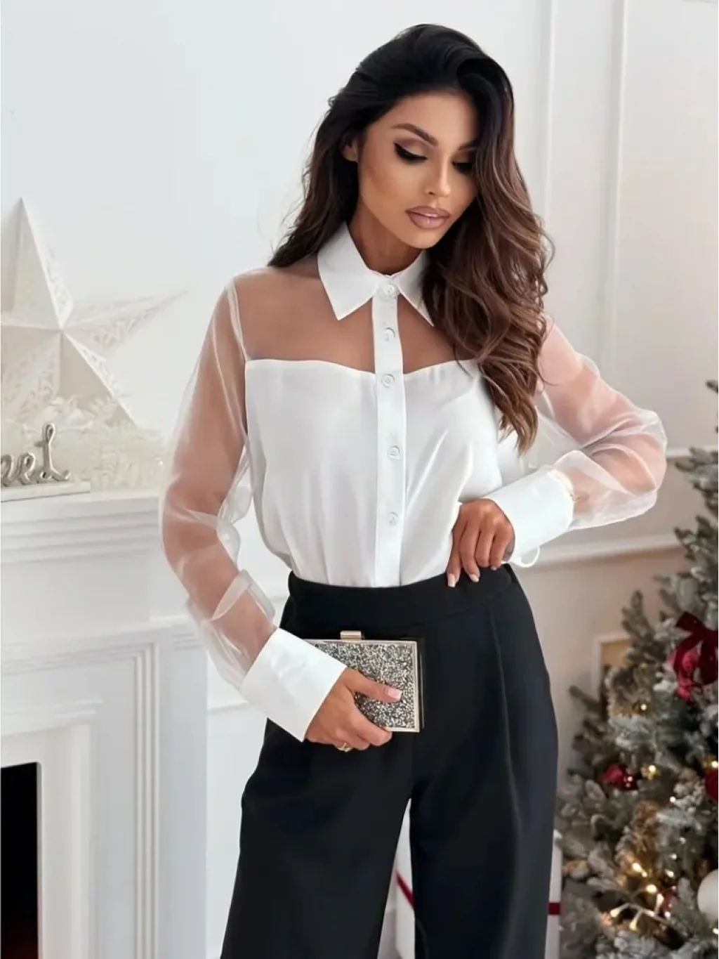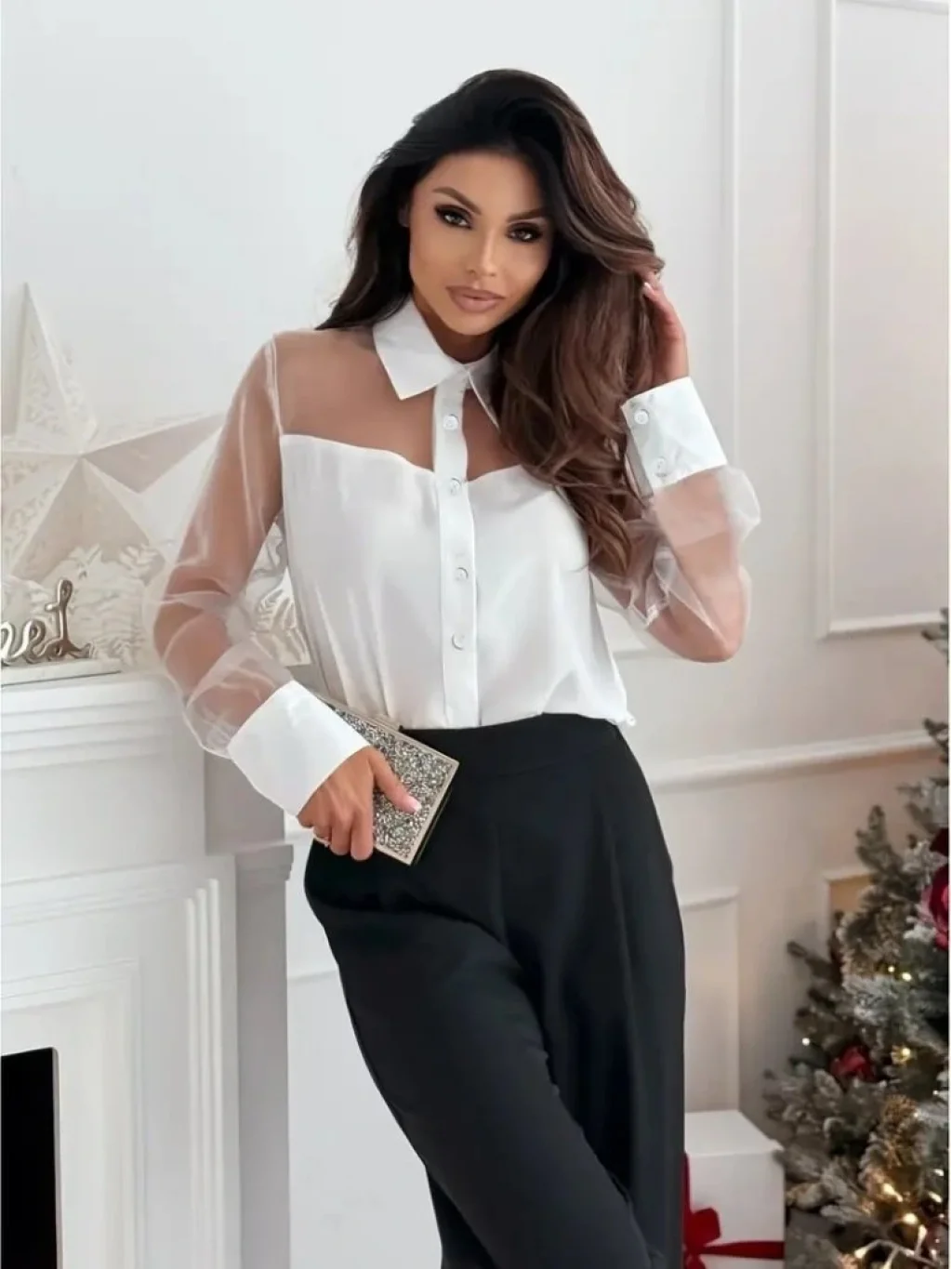 Kadın Uzun Kollu Yakalı önden Düğmeli Tül Detaylı Dokuma Viskon Bluz