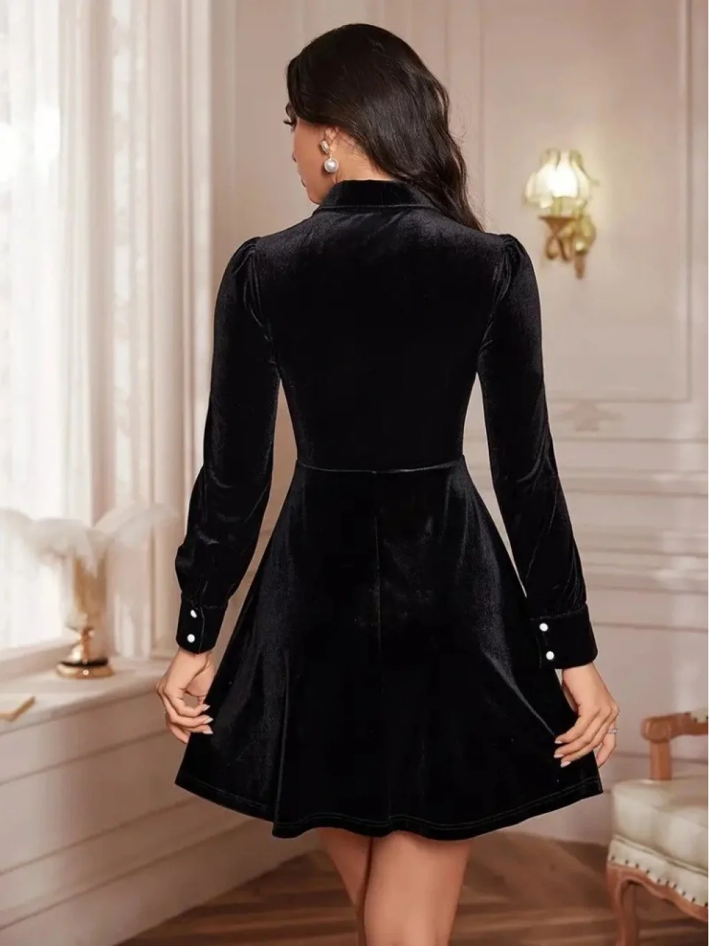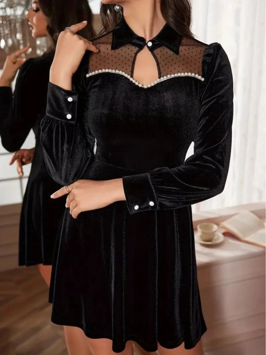 Kadın Uzun Kollu Yakalı Tül Detaylı Incili Mini Kadife Elbise