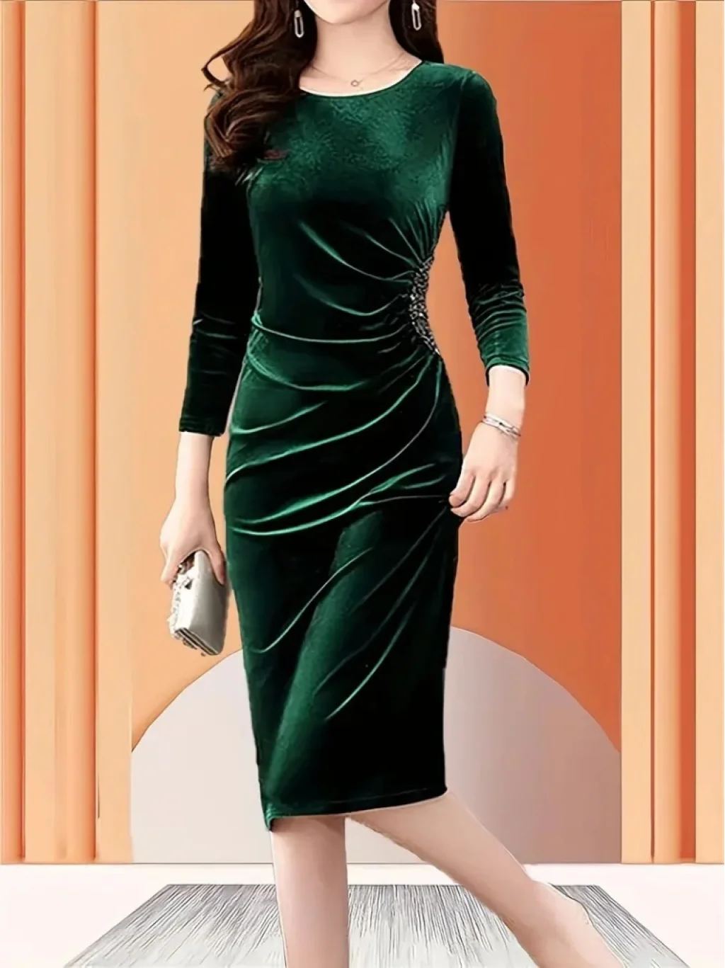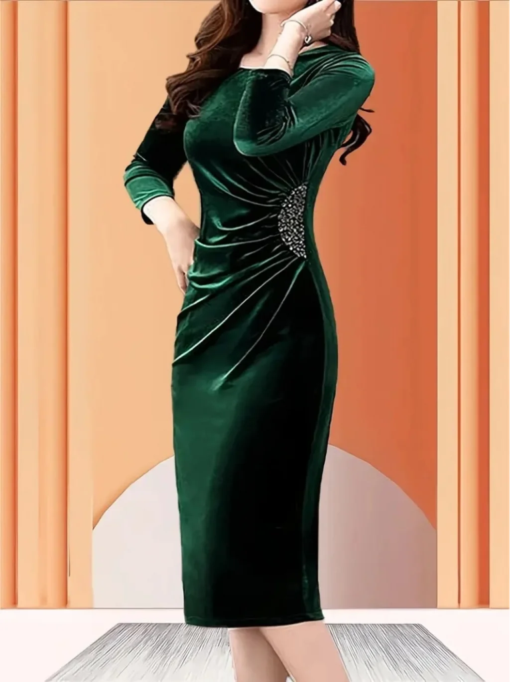 Kadın Uzun Kollu Yakası Açık Yanlardan Büzgülü Taş Detaylı Midi Kadife Elbise