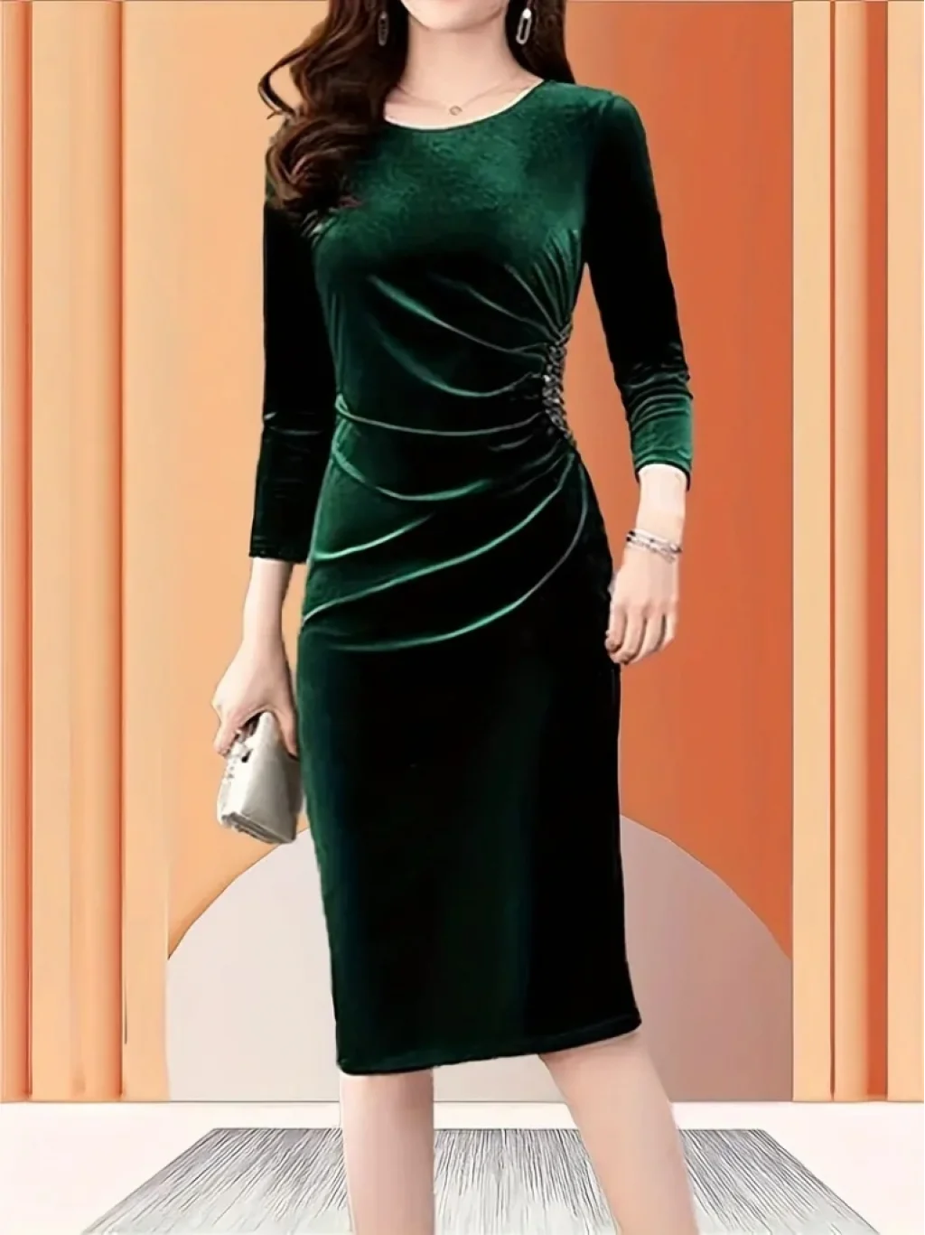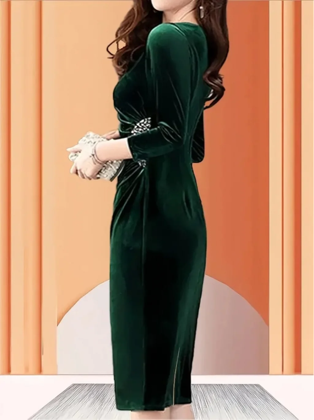 Kadın Uzun Kollu Yakası Açık Yanlardan Büzgülü Taş Detaylı Midi Kadife Elbise
