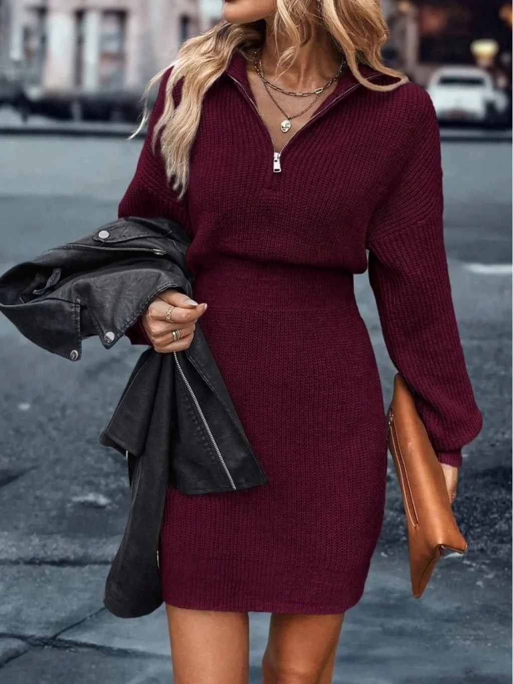 Kadın Uzun Kollu Yakası Fermuarlı Mini Triko Elbise