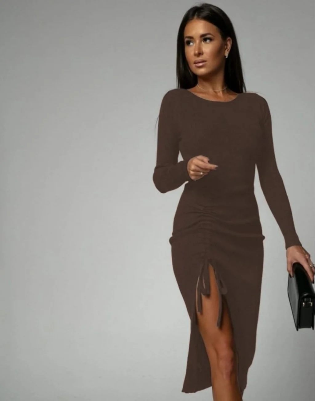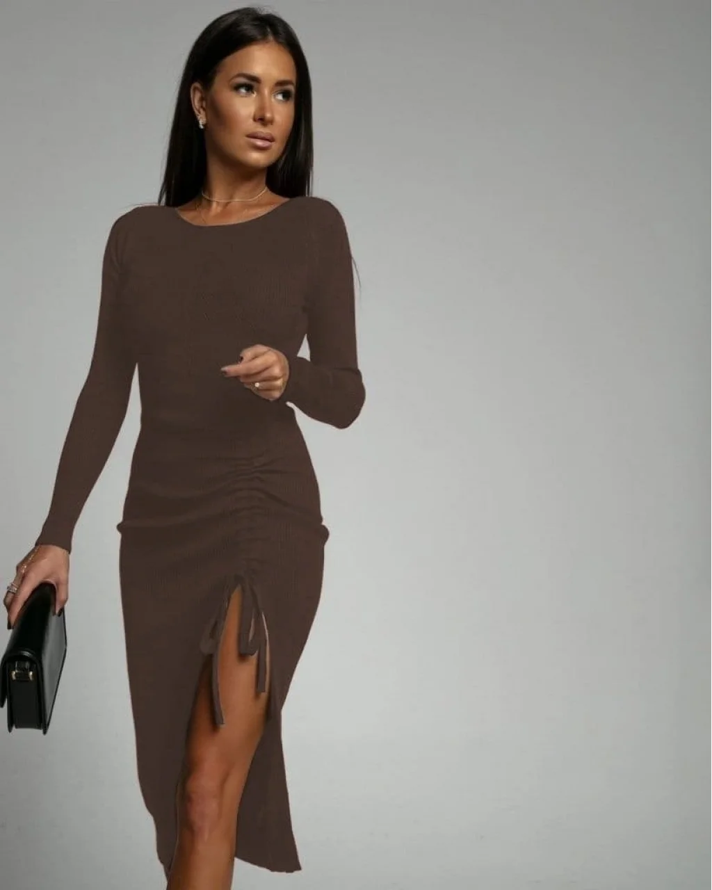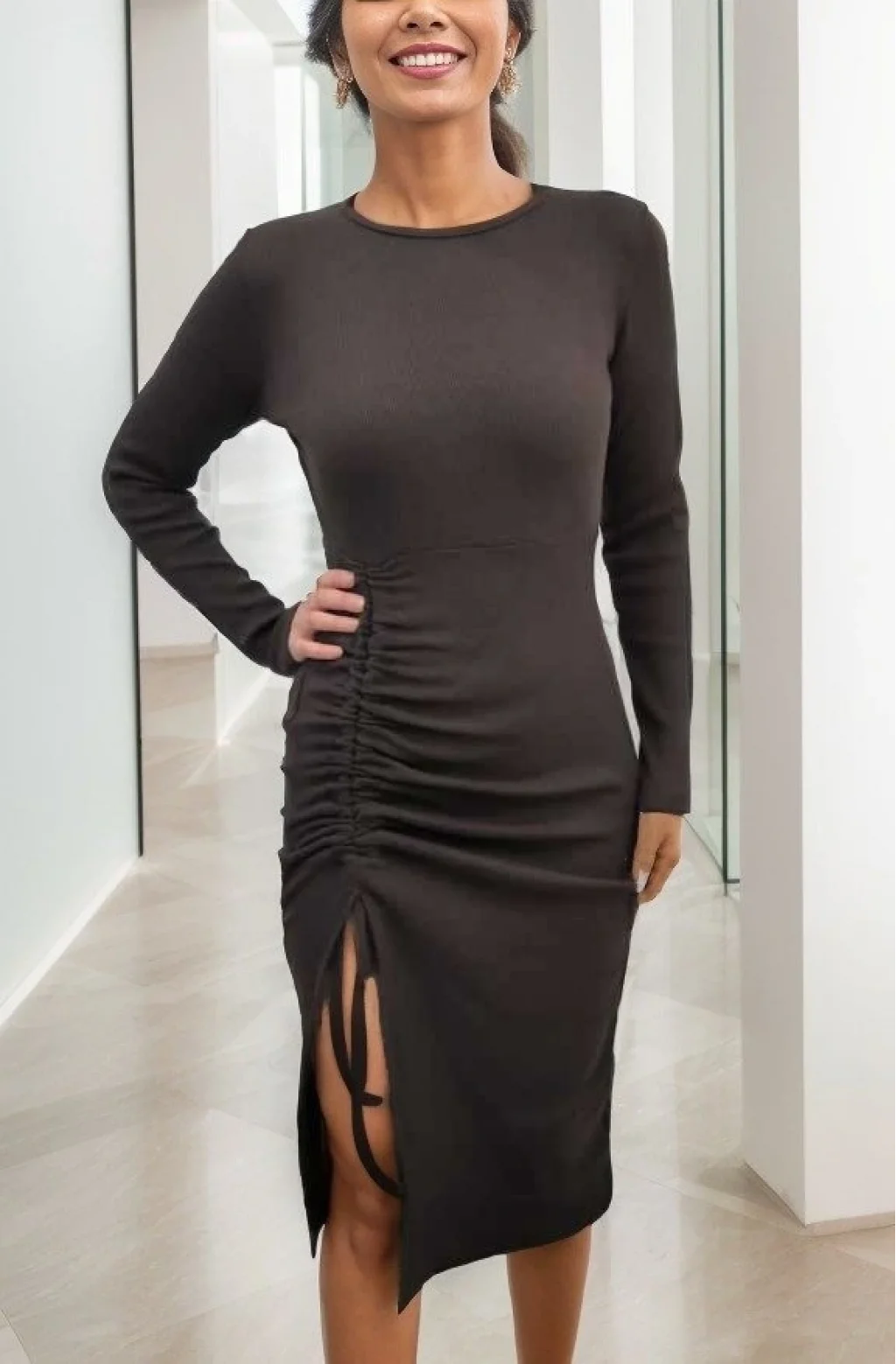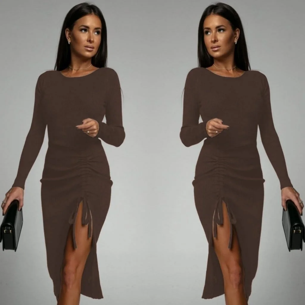 Kadın Uzun Kollu Yandan Büzgülü Yırtmaç Detay Kaşkorse Midi Boy Elbise