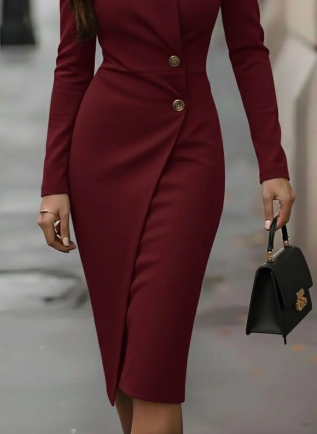 Kadın Uzun Kollu Yandan Düğmeli Kruvaze Yaka Detaylı Midi Ithal Krep Elbise