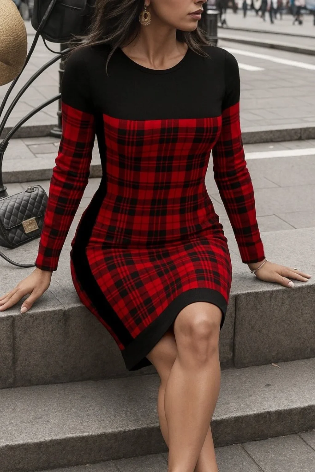 Kadın Uzun Kollu Yanları Siyah şerit Detay Kırmızı Ekoseli Dalgıç Elbise