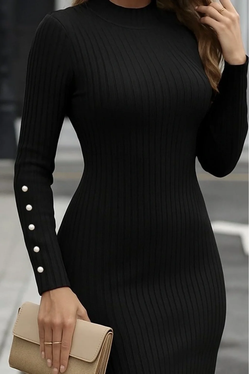Kadın Uzun Kollu Yarı Balıkçı Yaka Kollar Düğme Detaylı Kısa şardonlu Kaşkorse Elbise