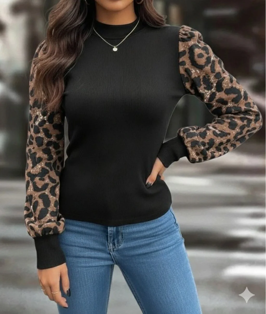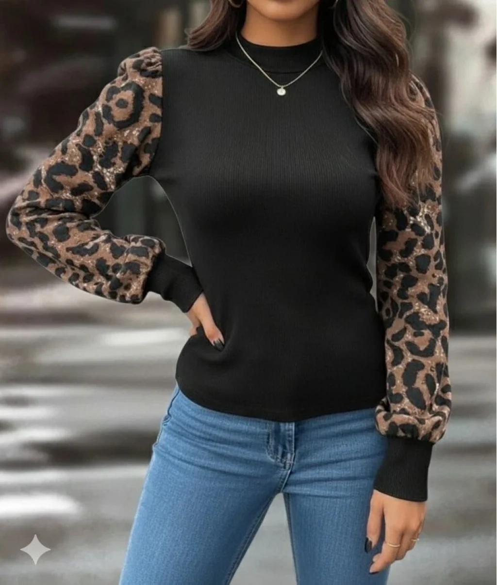 Kadın Uzun Kollu Yarı Balıkçı Yaka Leopar Detaylı Kaşkorse Bluz