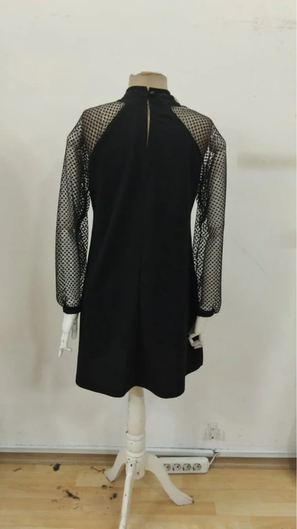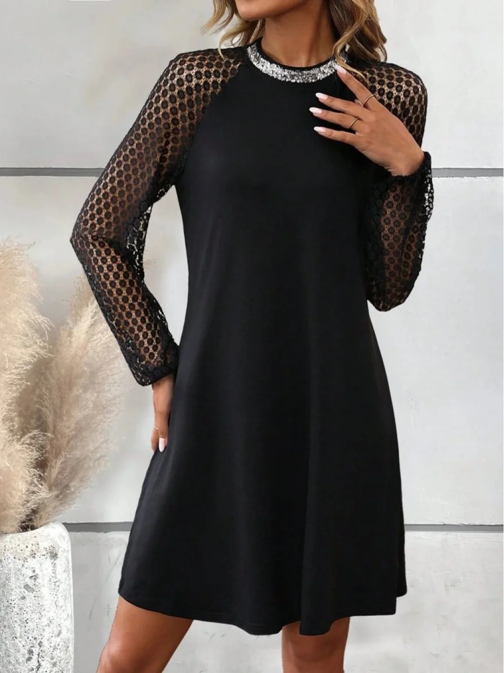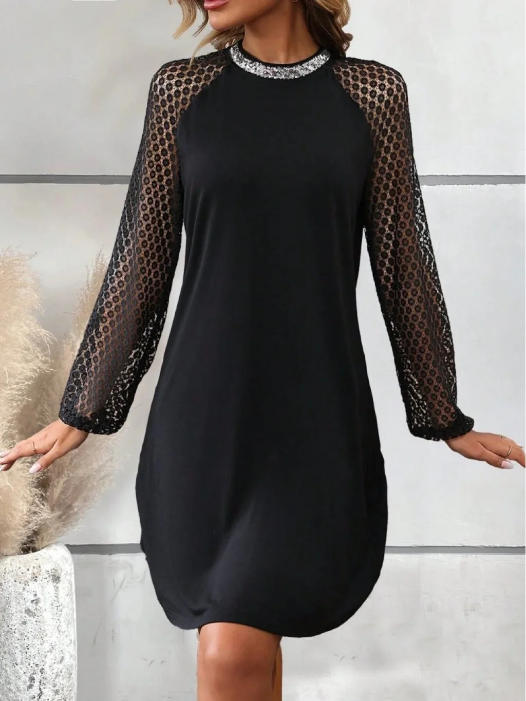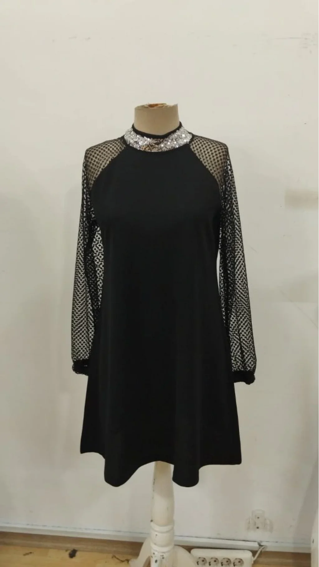 Kadın Uzun Kollu Yarı Balıkçı Yaka Pulpayetli Kolları Dantel Detaylı Mini Ithal Krep Elbise