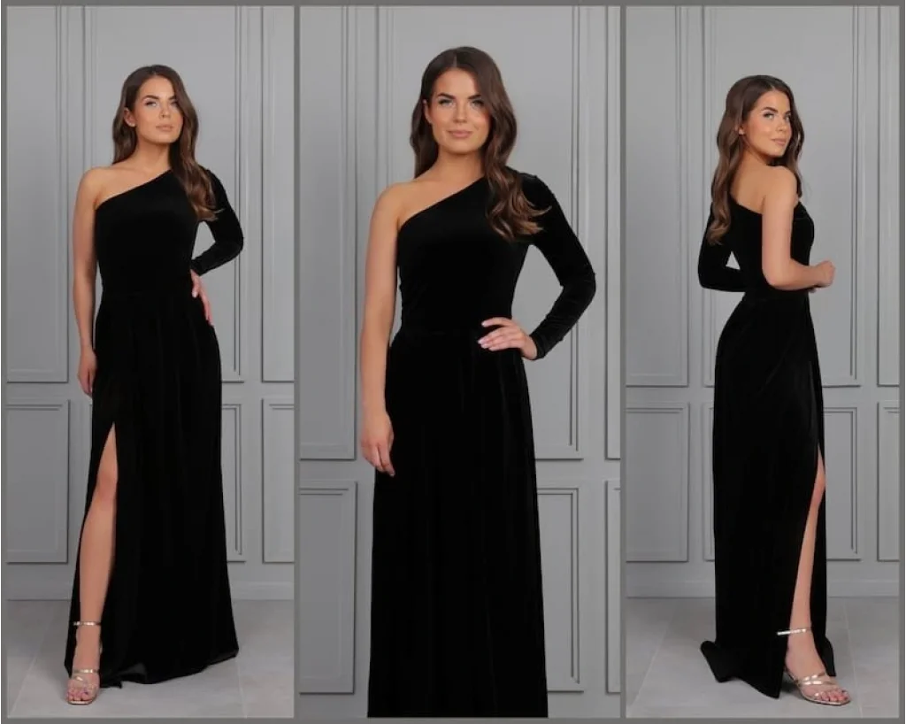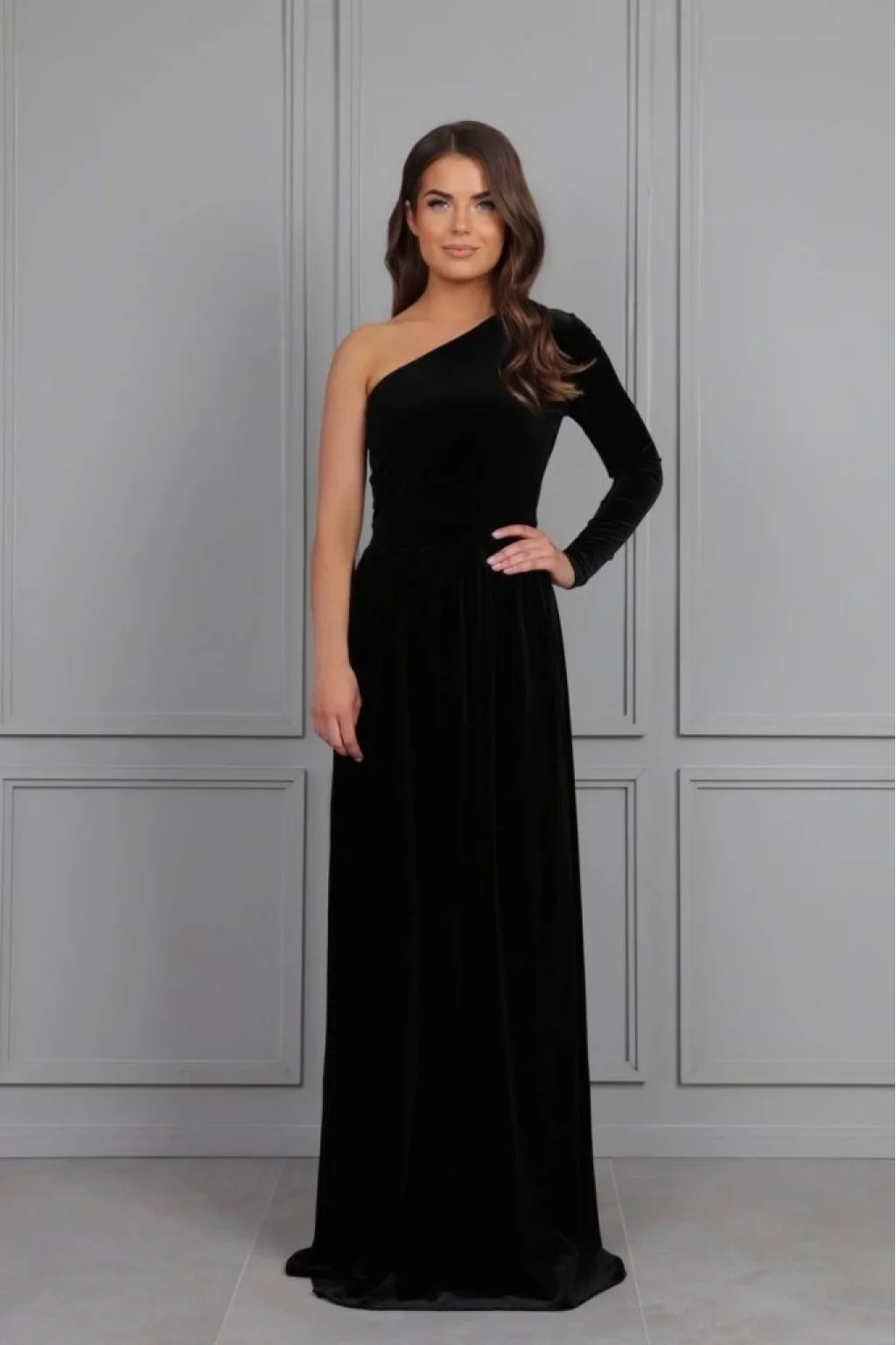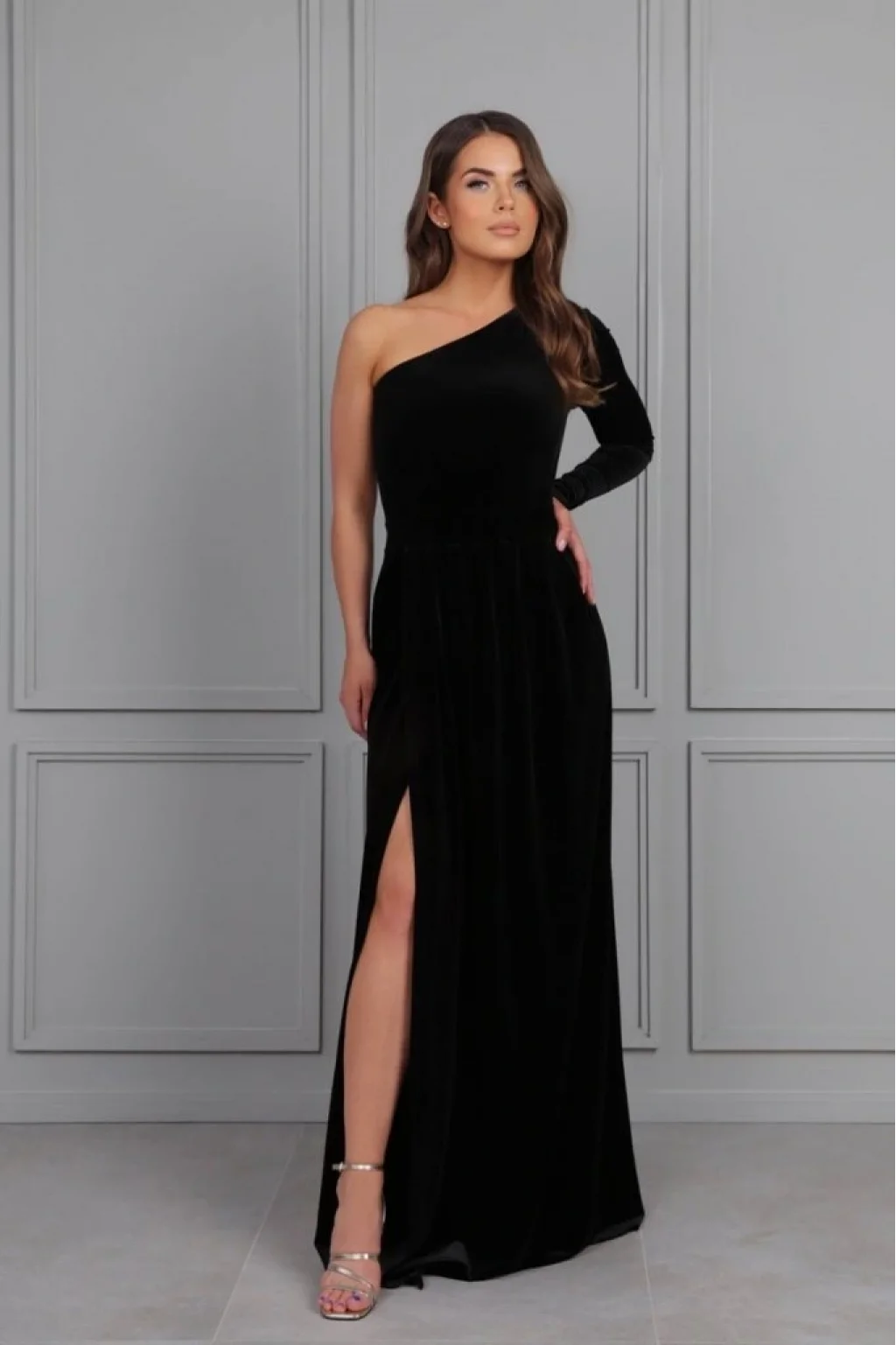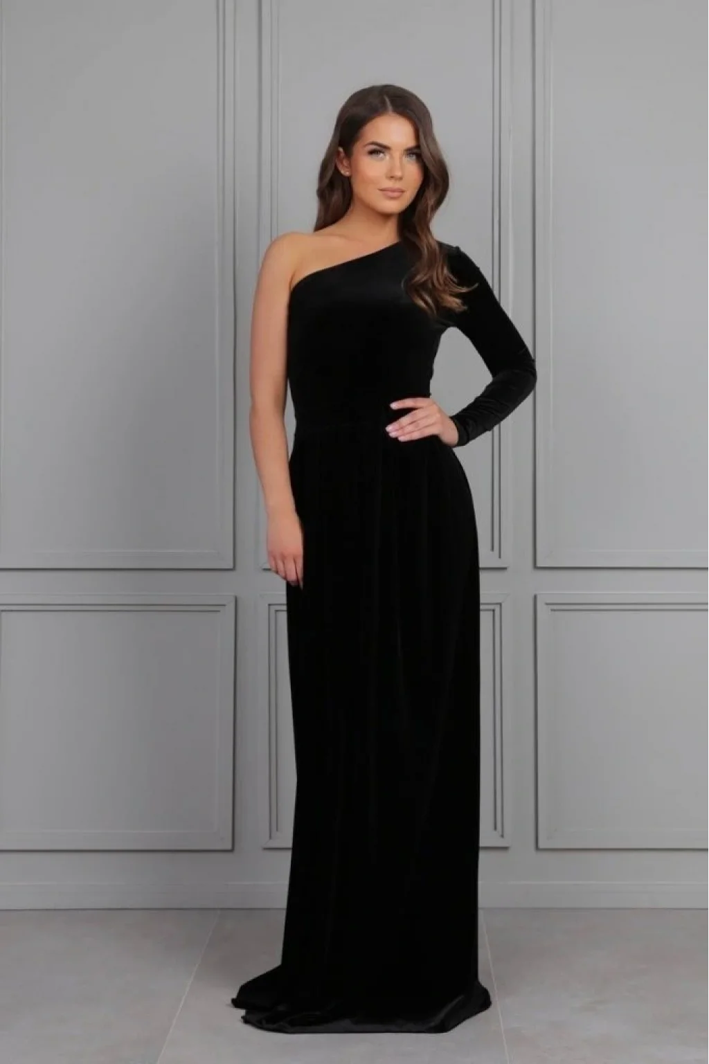 Kadın Uzun Kollu Yırtmaçlı önü Pile Detay Tek Kol Maxi Boy Kadife Elbise