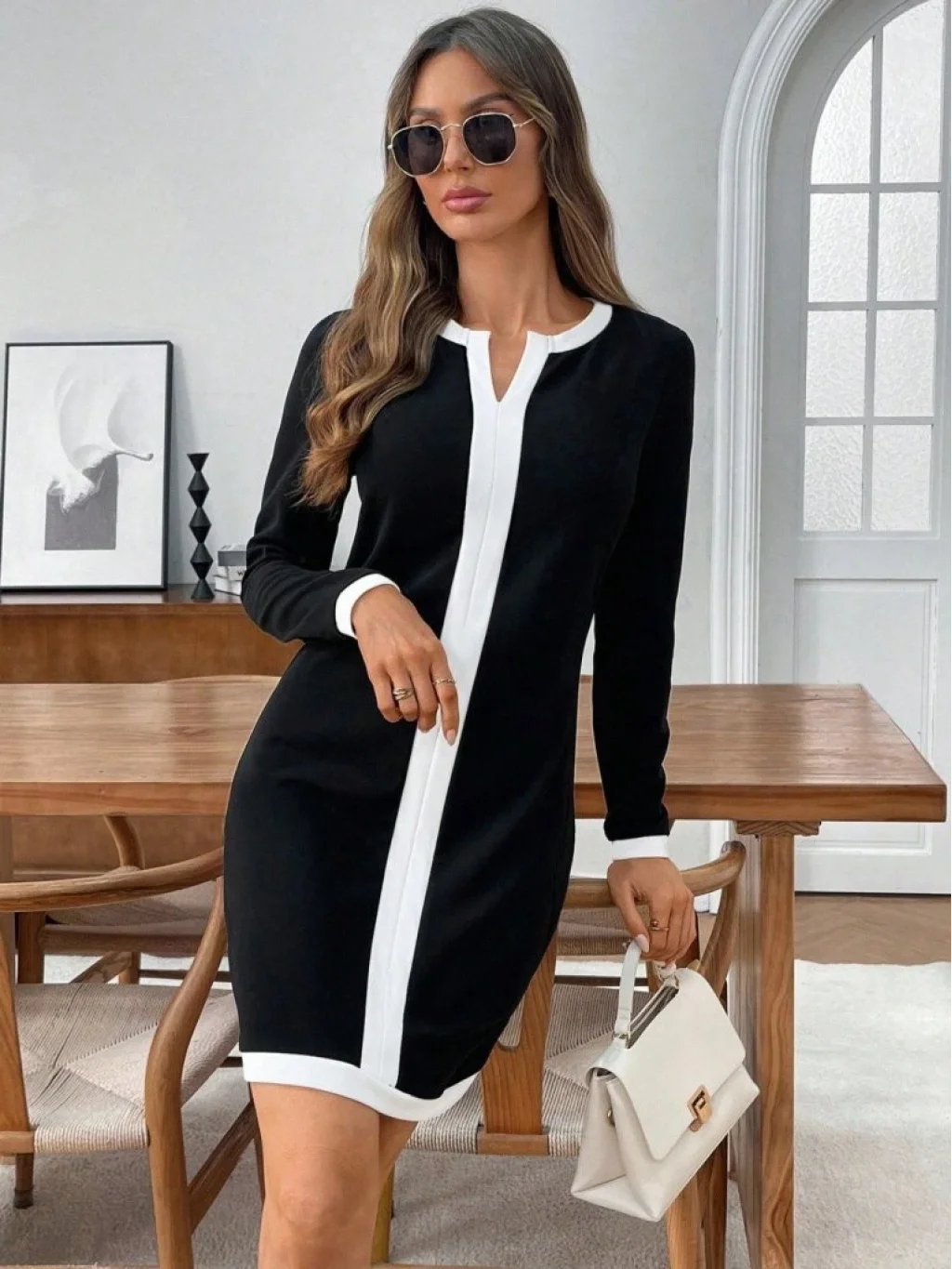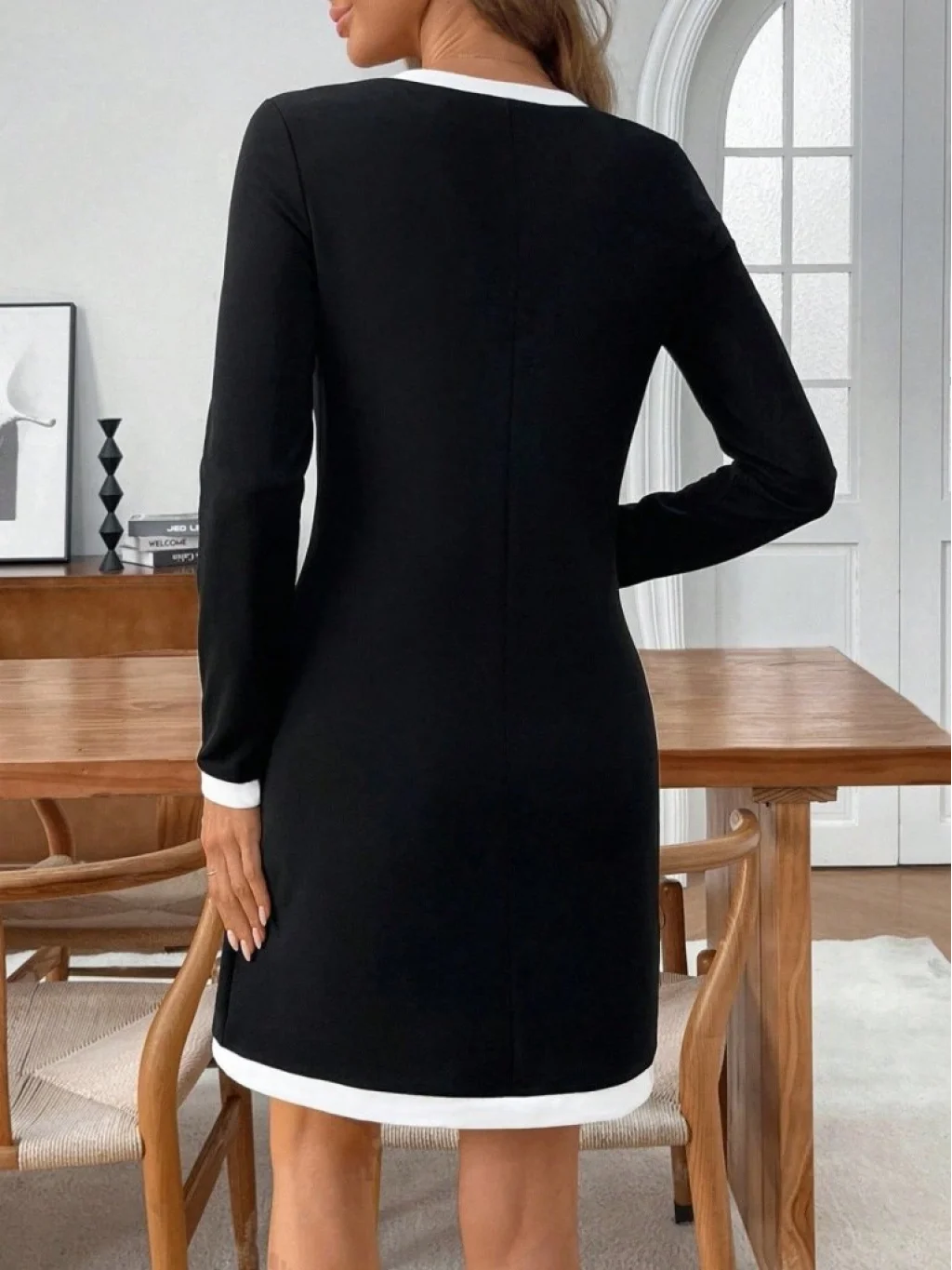 Kadın Uzun Kollu Yuvarlak V Yakalı şerit Detaylı Modal Mini Elbise