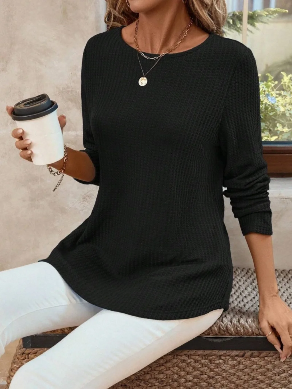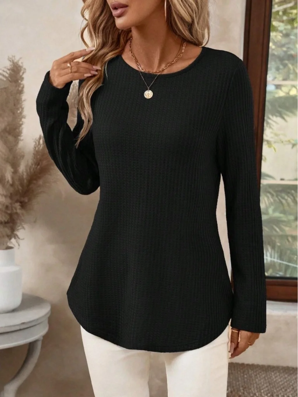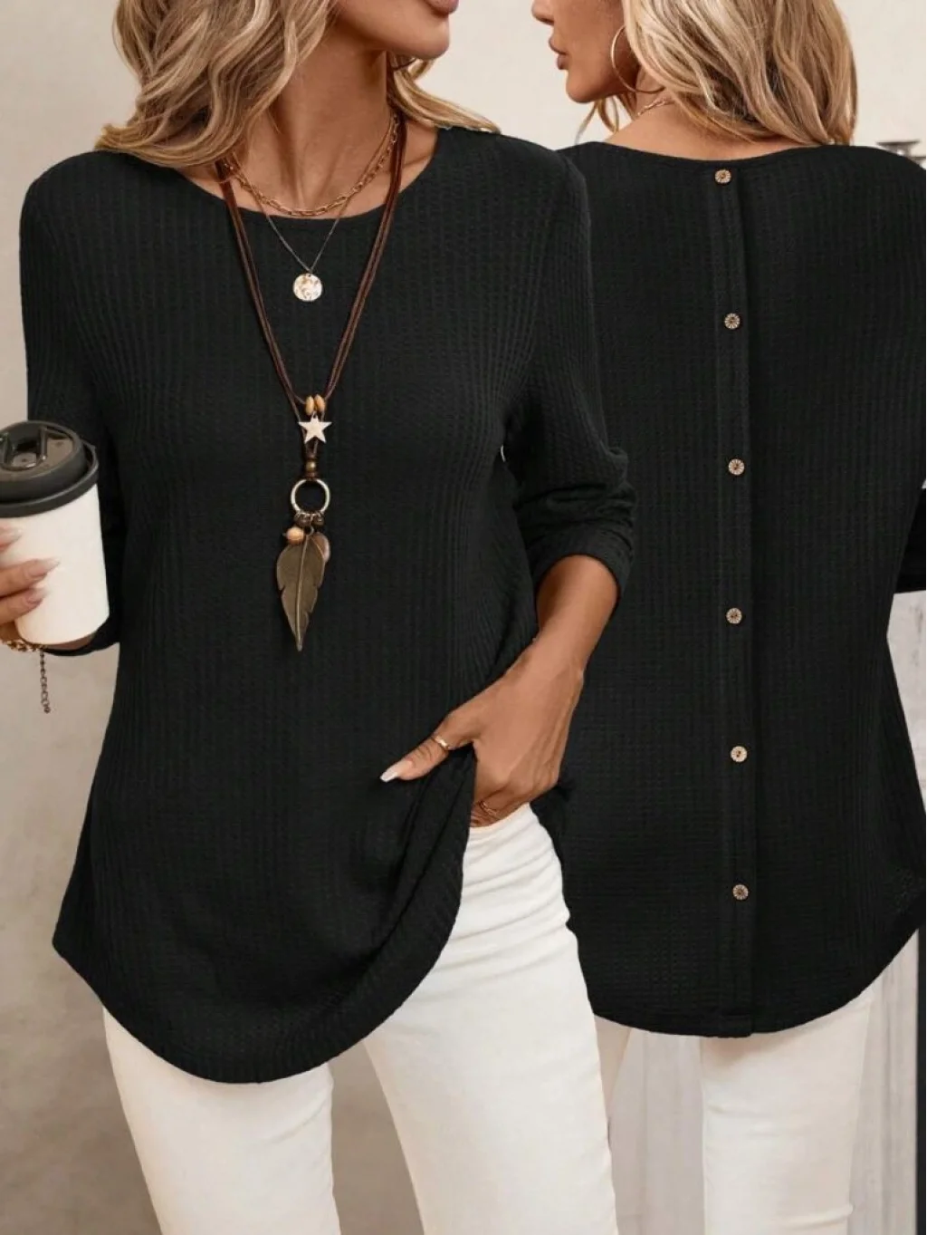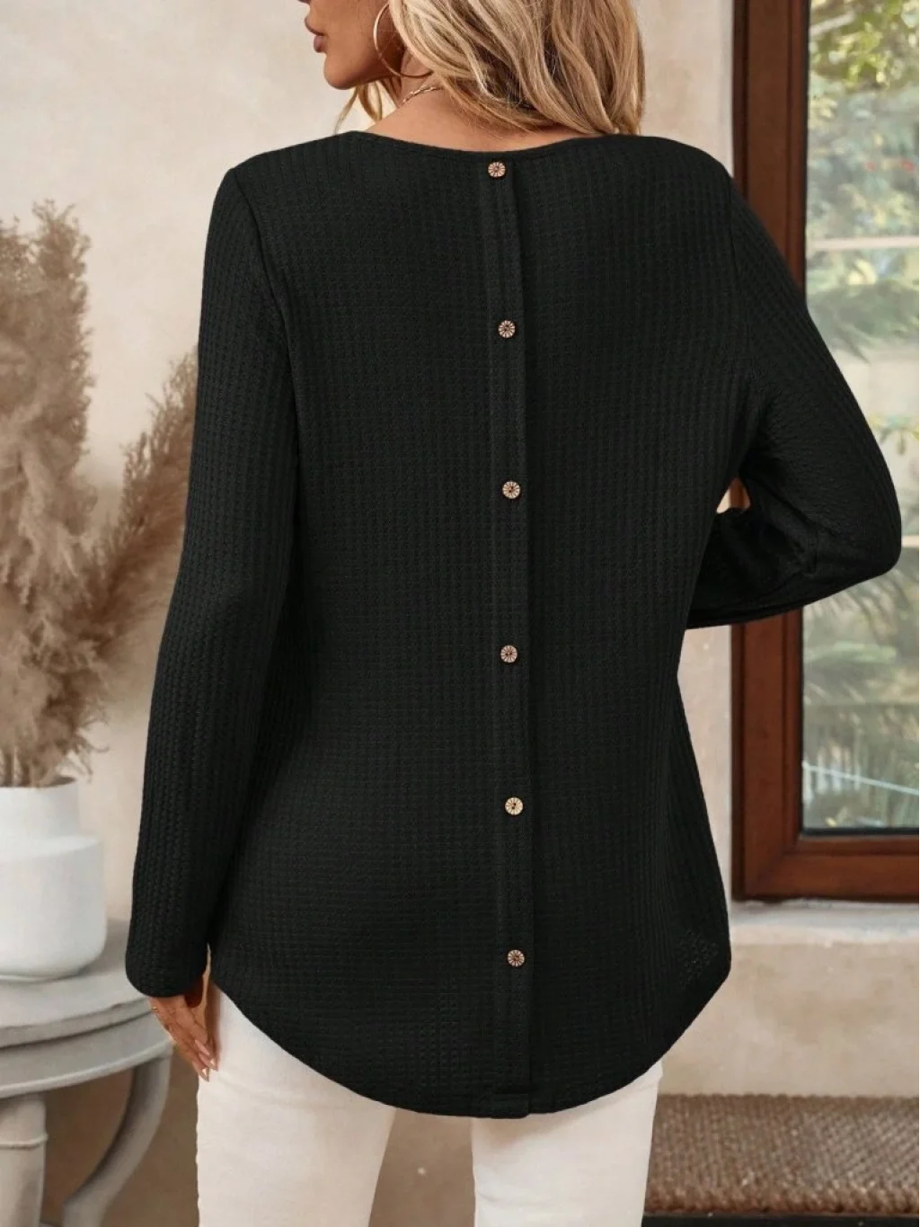 Kadın Uzun Kollu Yuvarlak Yaka Arkadan Düğmeli Waffle Bluz