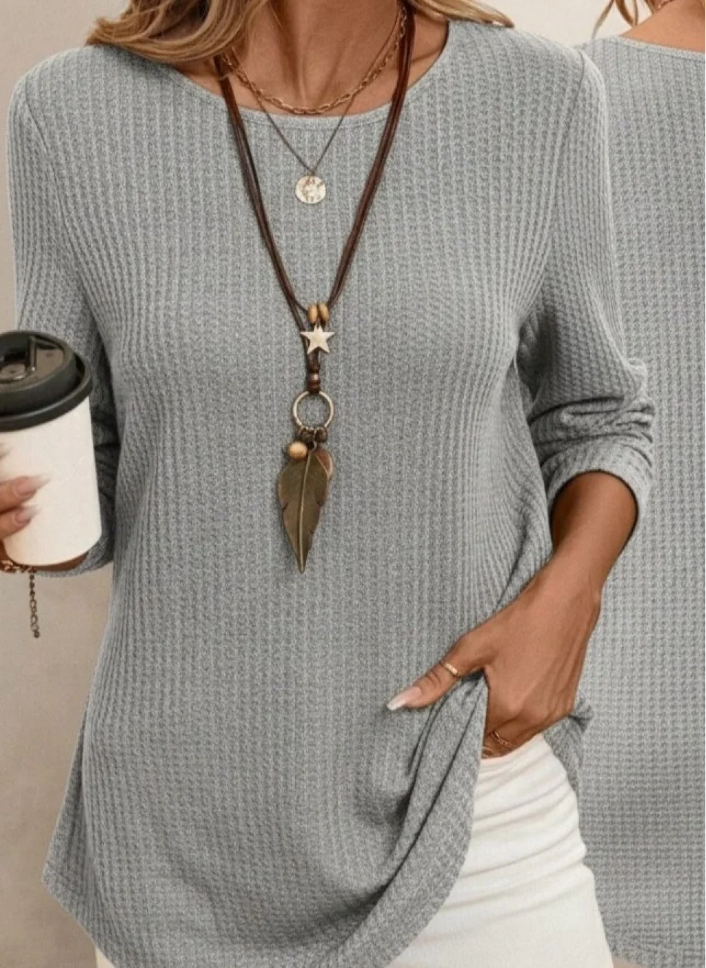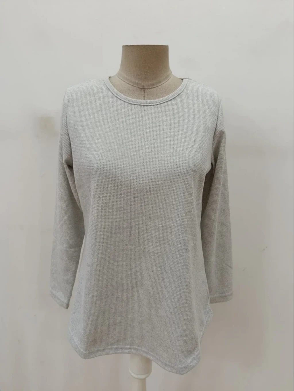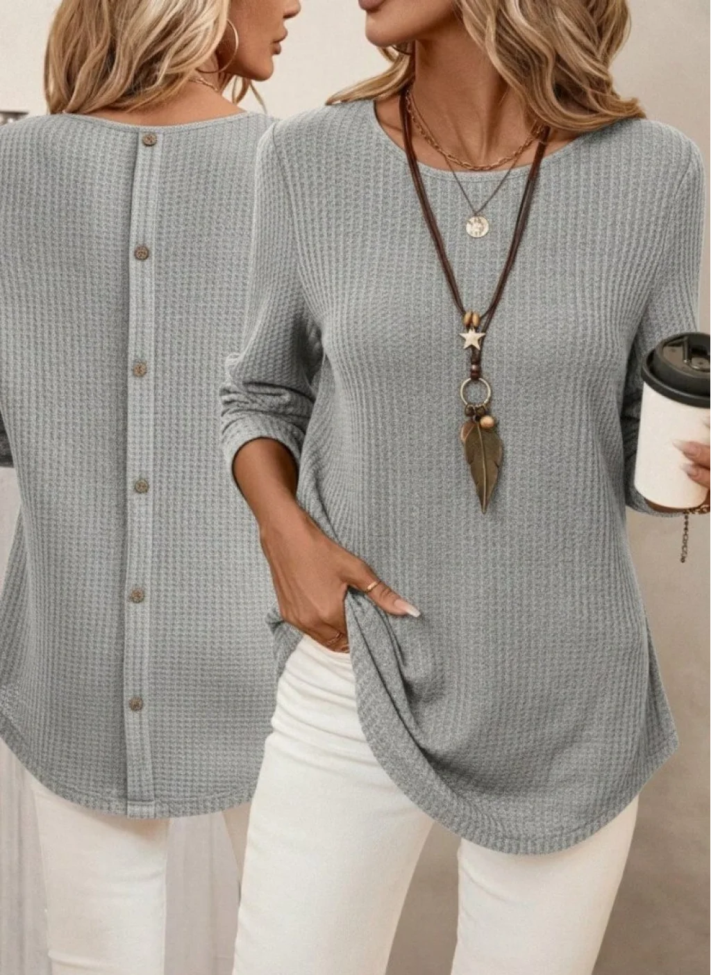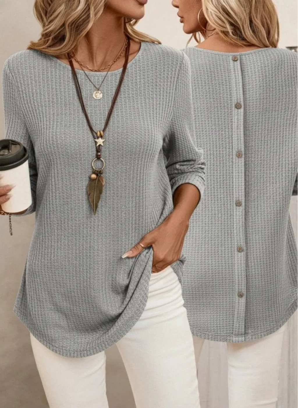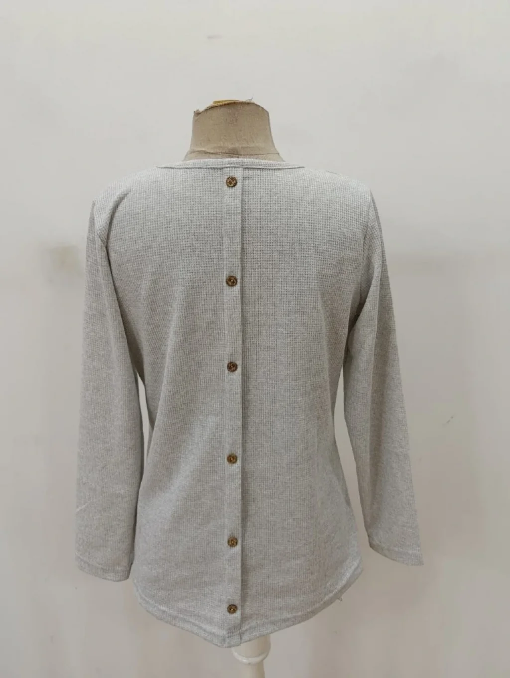 Kadın Uzun Kollu Yuvarlak Yaka Arkadan Düğmeli Waffle Bluz