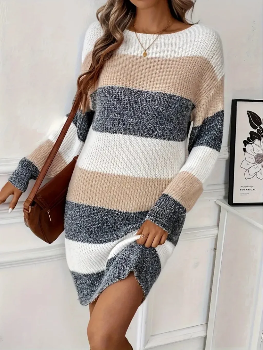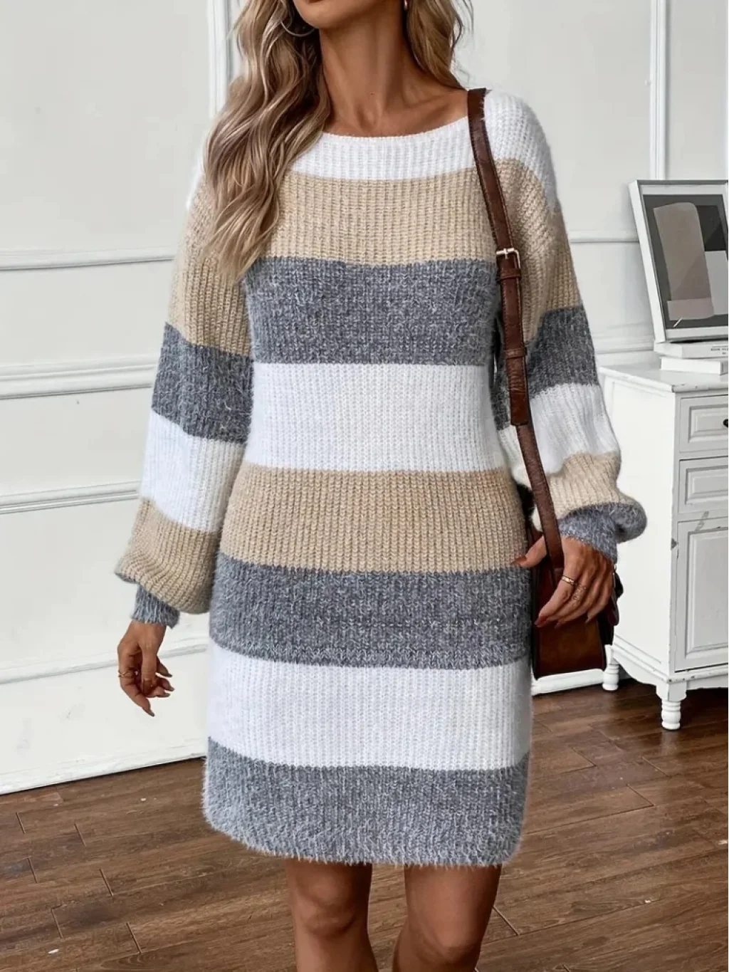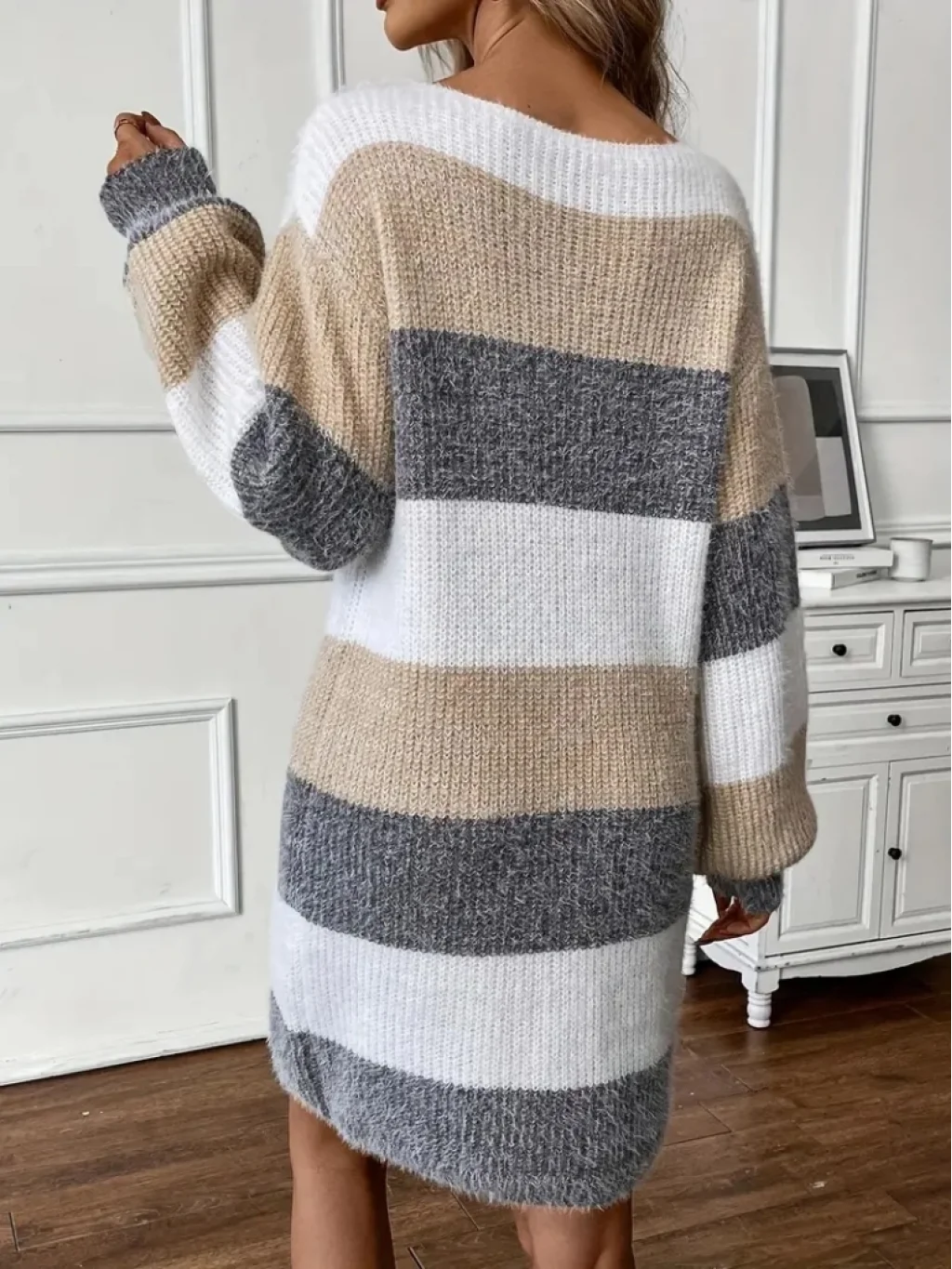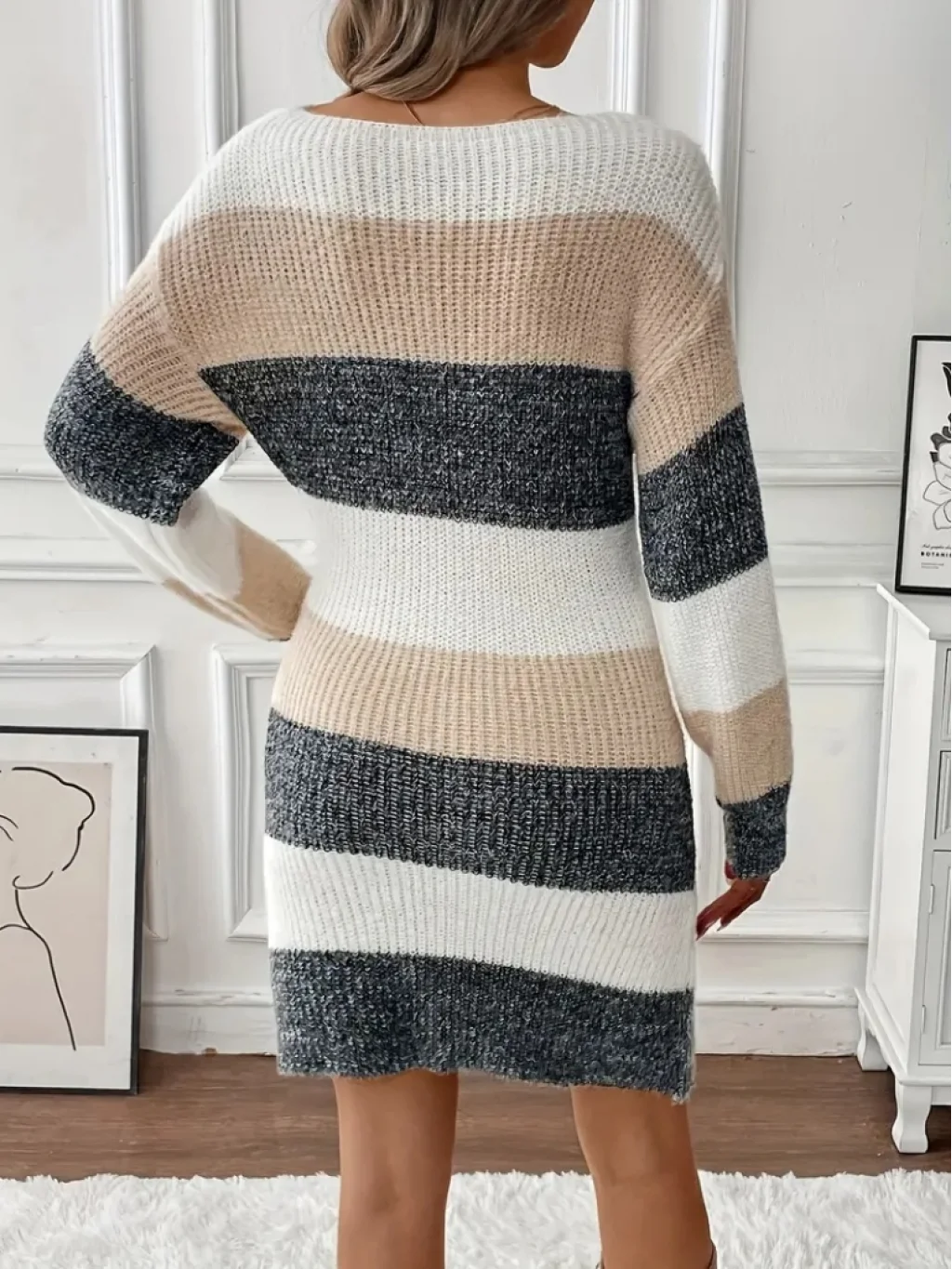 Kadın Uzun Kollu Yuvarlak Yaka çizgili çok Renkli Triko Elbise