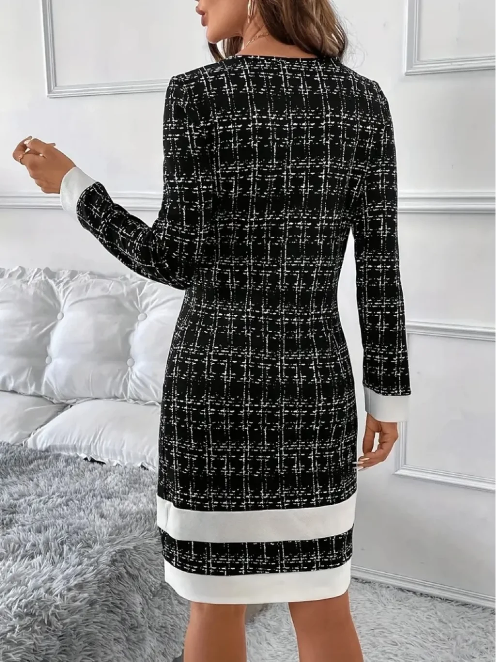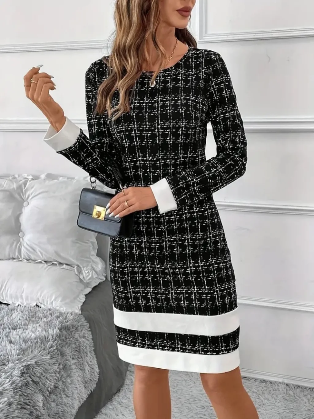 Kadın Uzun Kollu Yuvarlak Yaka Etek Ucu şerit Detaylı Kısa Dokuma Elbise