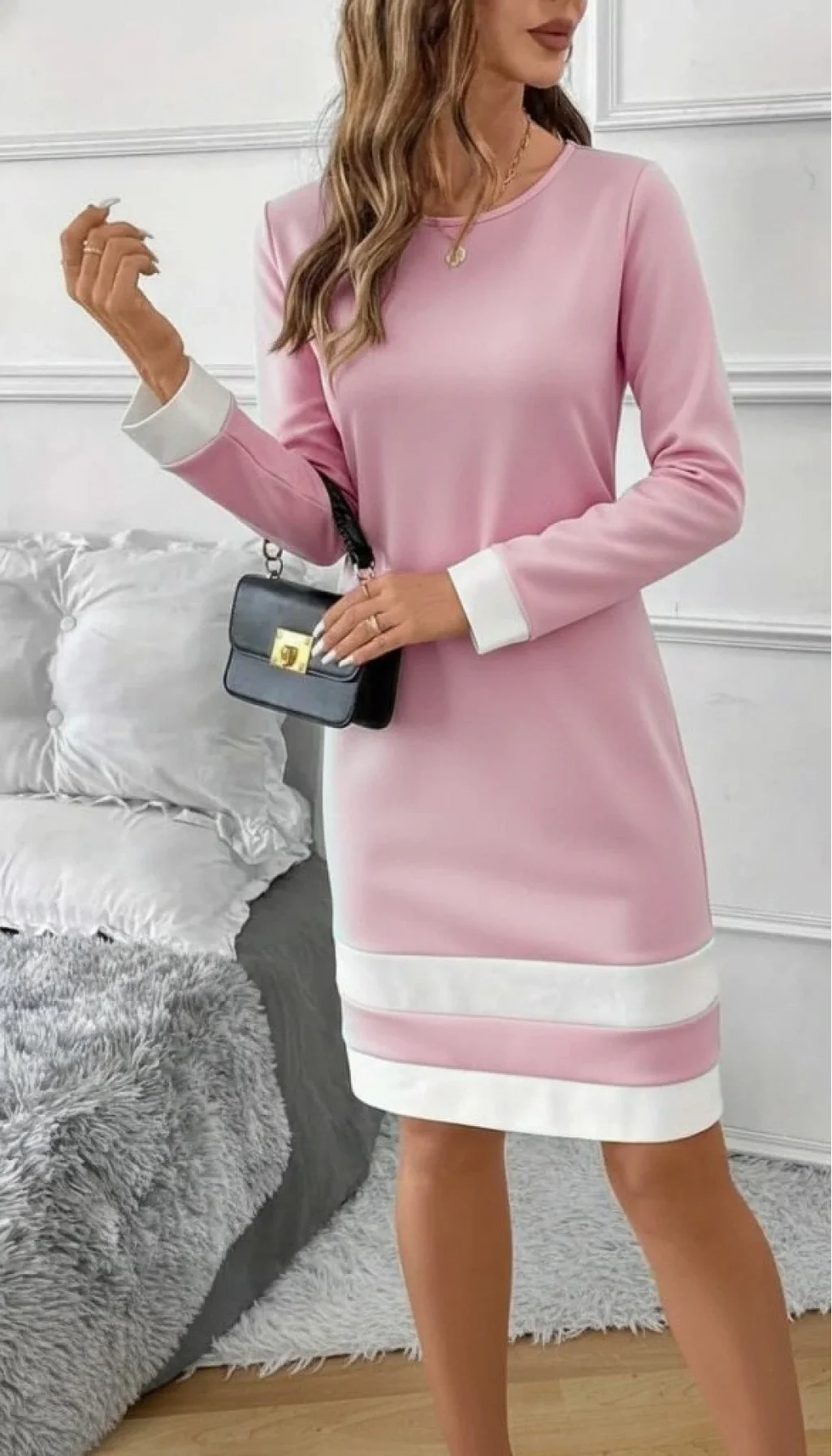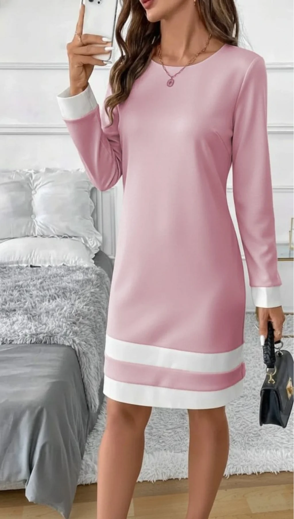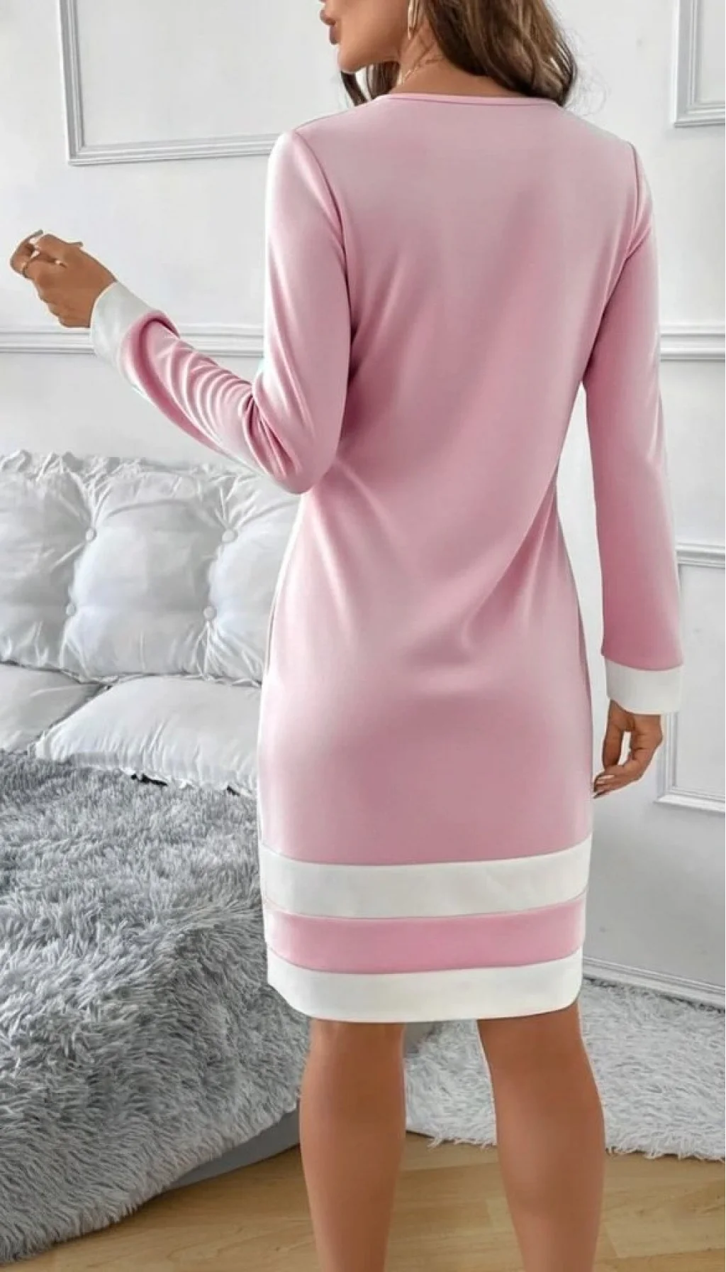 Kadın Uzun Kollu Yuvarlak Yaka Etek Ucu şerit Detaylı Mini Dalgıç Elbise