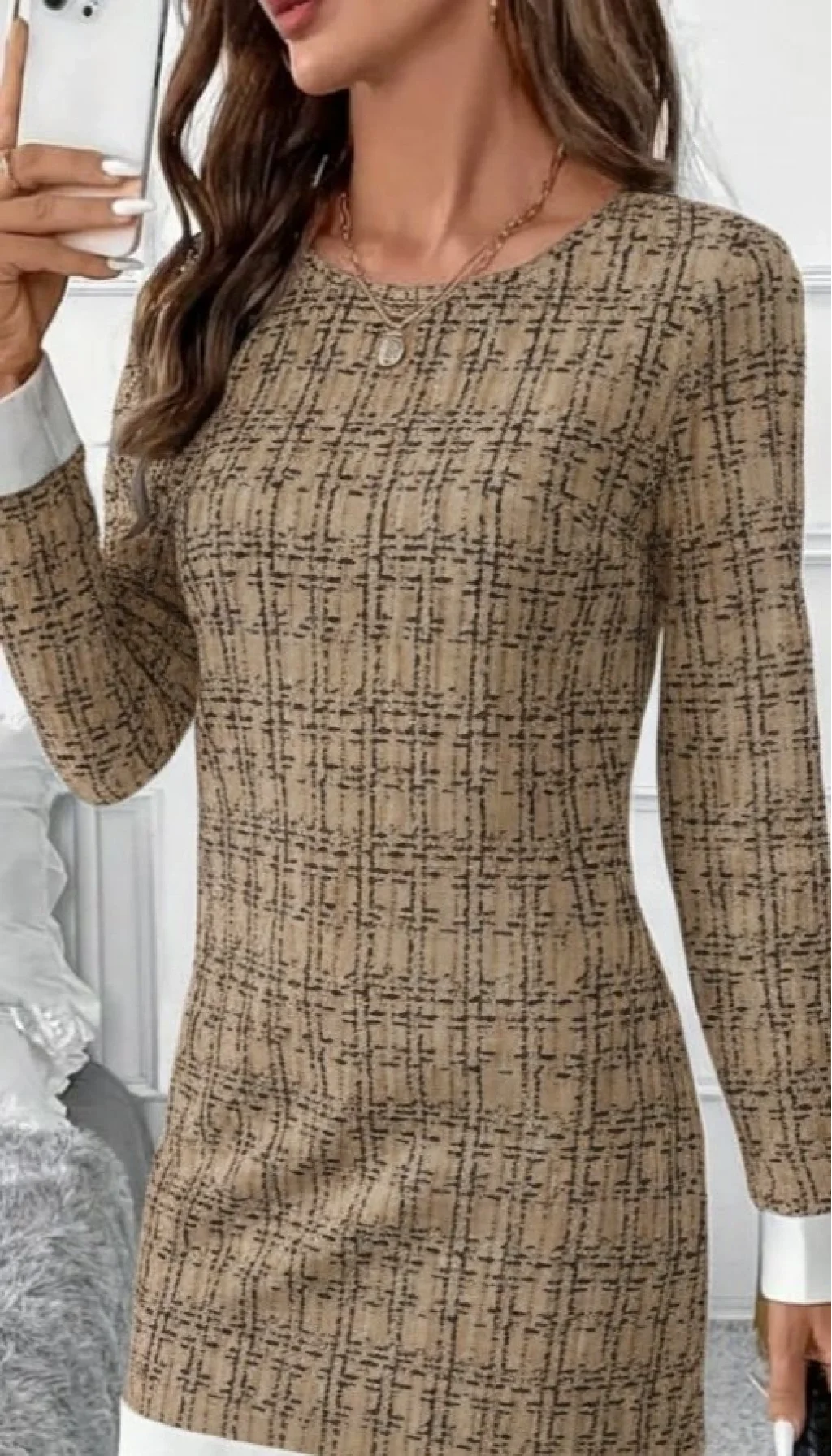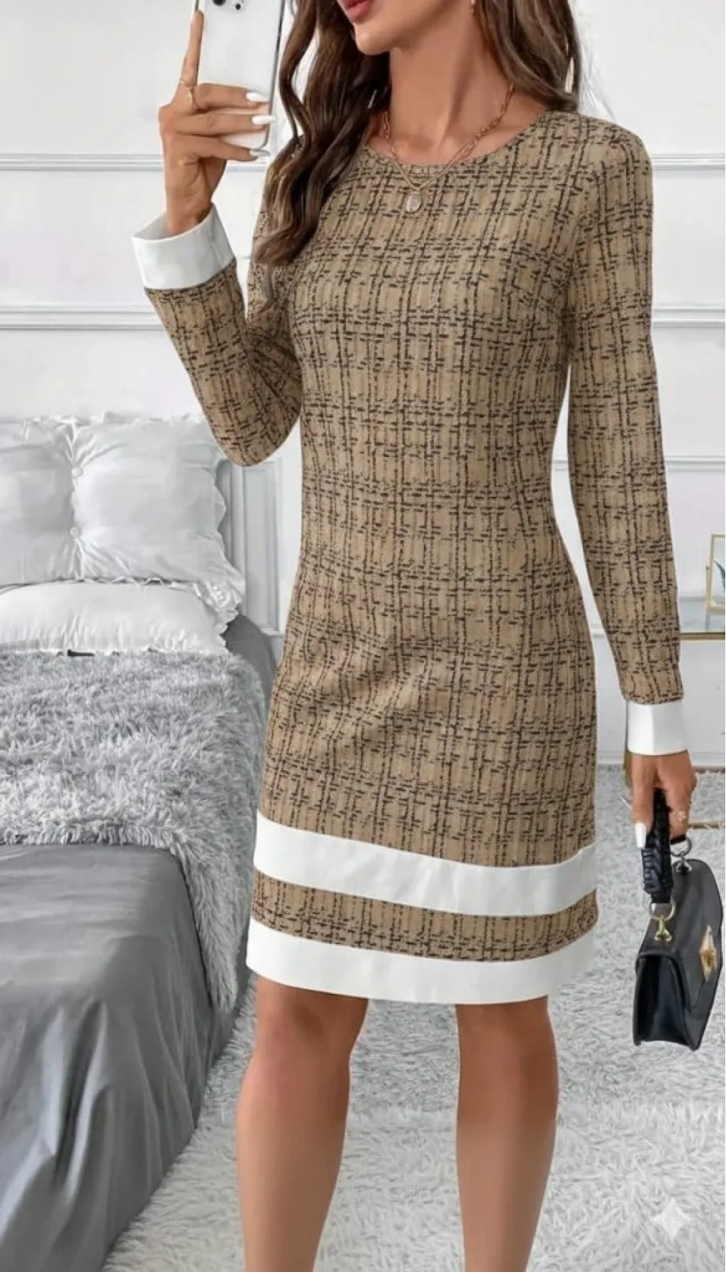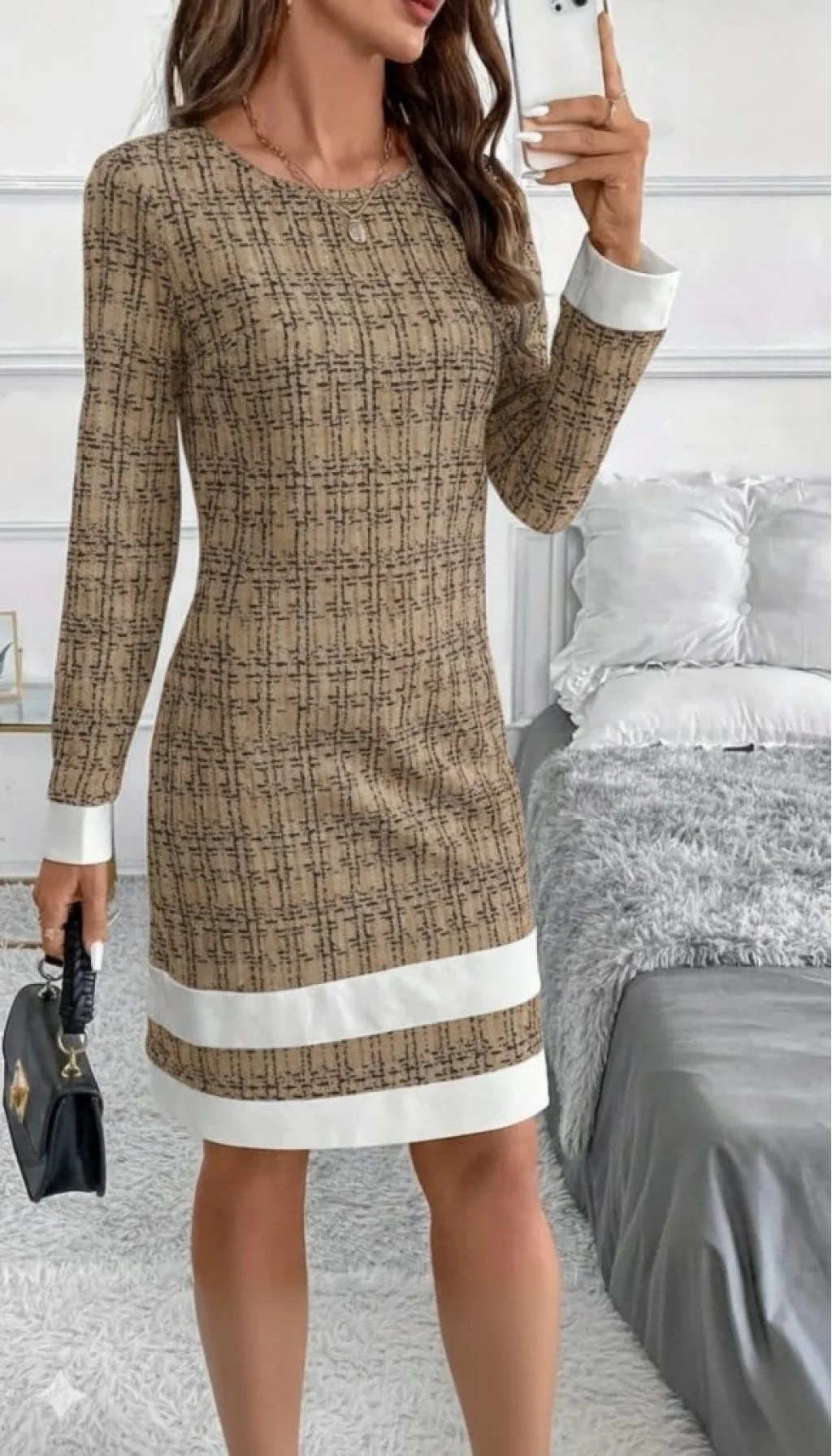 Kadın Uzun Kollu Yuvarlak Yaka Etek Ucu şerit Detaylı Mini Dokuma Elbise