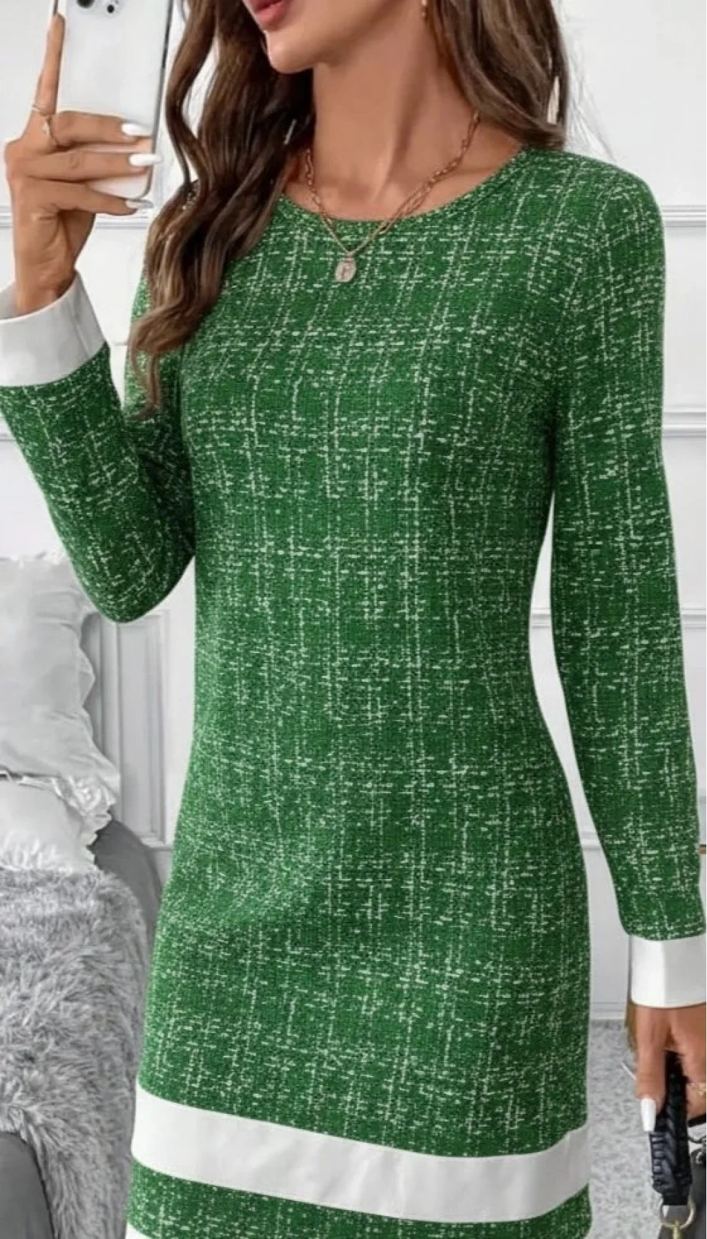 Kadın Uzun Kollu Yuvarlak Yaka Etek Ucu şerit Detaylı Mini Dokuma Elbise