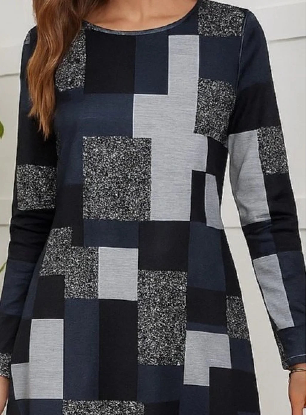 Kadın Uzun Kollu Yuvarlak Yaka Geometrik Süprem Elbise