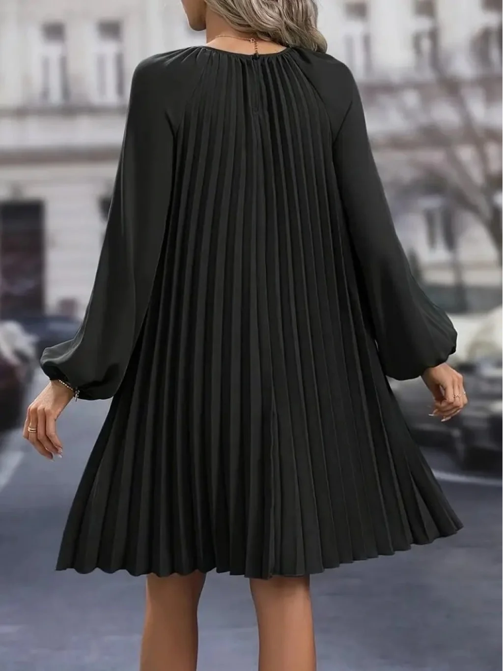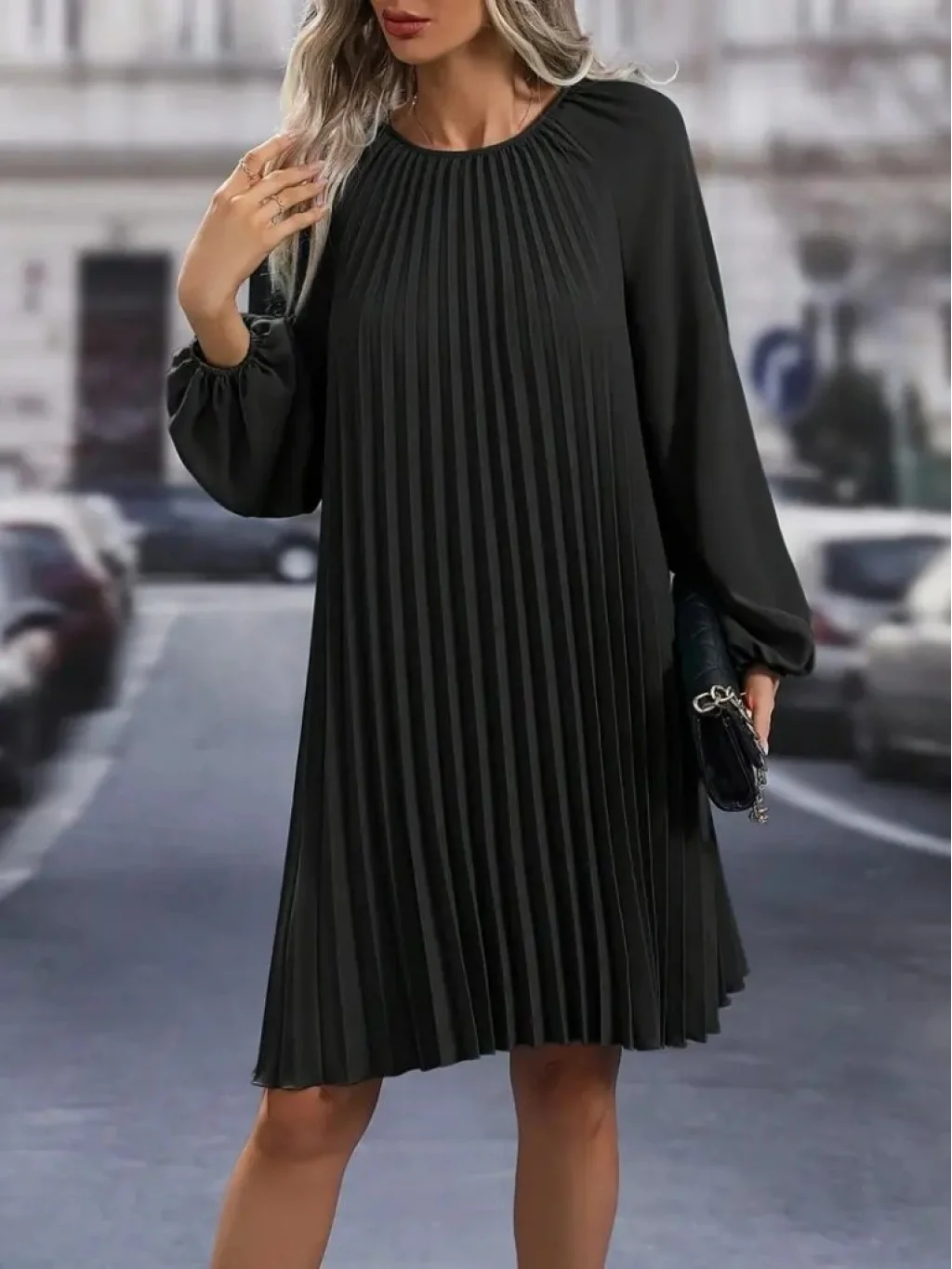 Kadın Uzun Kollu Yuvarlak Yaka Pileli Salaş Mini Ithal Krep Elbise