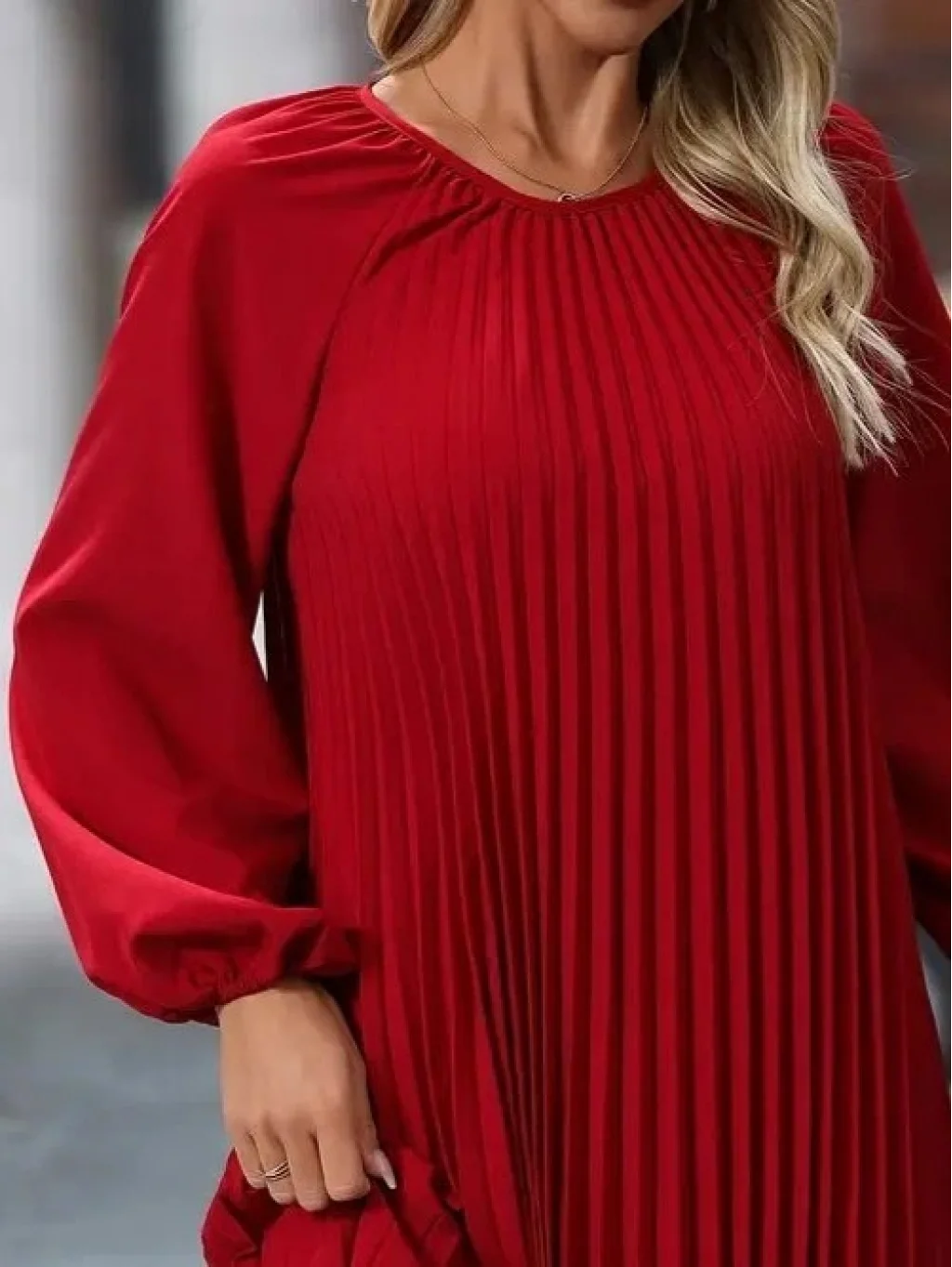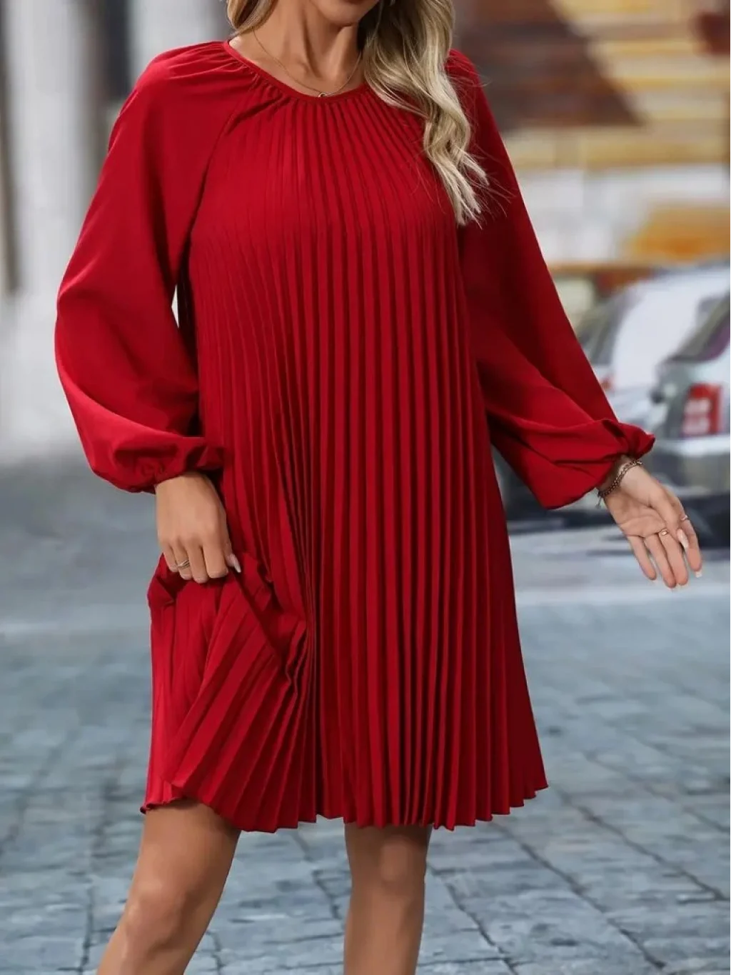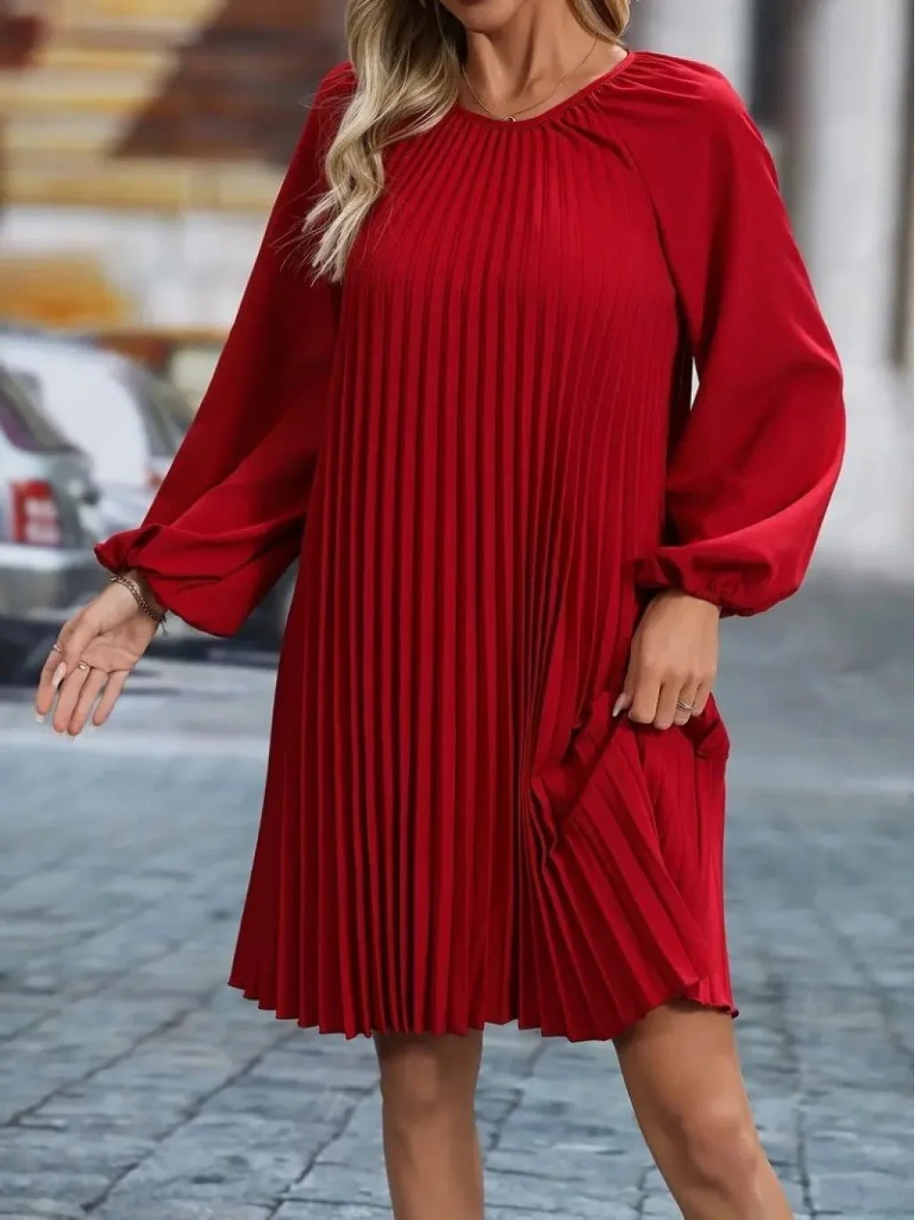 Kadın Uzun Kollu Yuvarlak Yaka Pileli Salaş Mini Ithal Krep Elbise