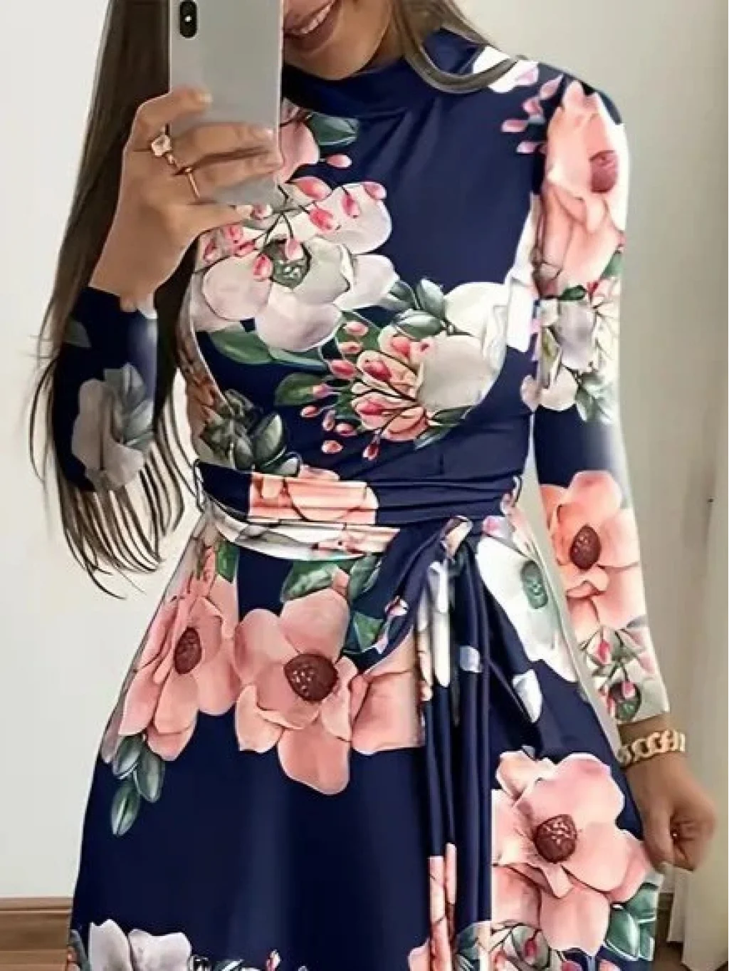 Kadın Uzun Kollu Yuvarlak Yakalı Beli Kuşaklı Desenli Süprem Uzun Elbise