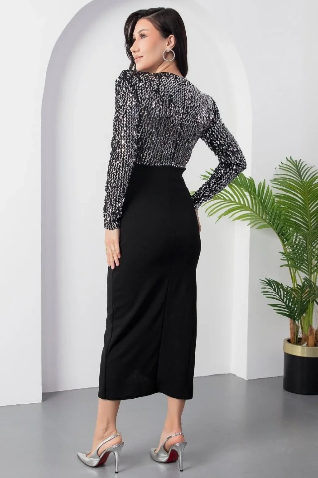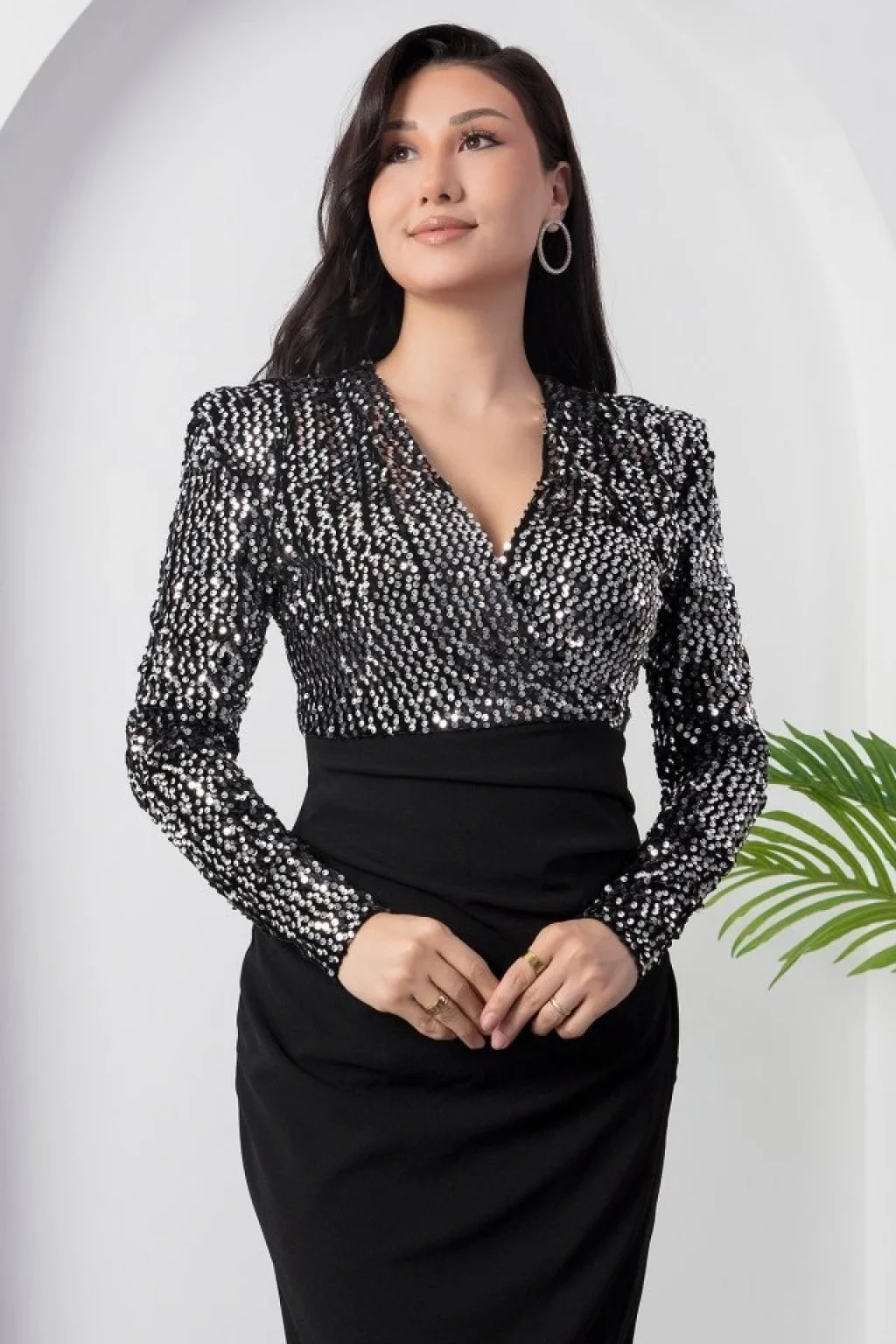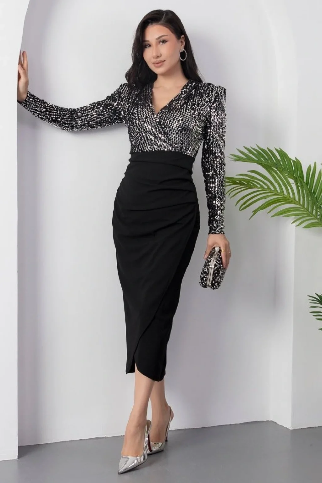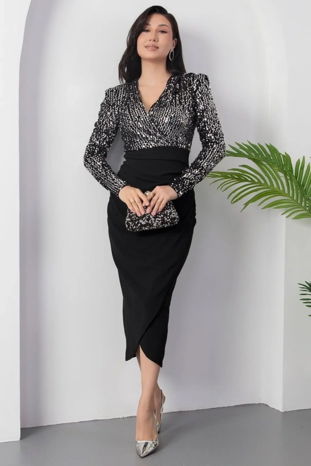 Kadın Uzun Kpllu Kruvaze Yaka Pul Pyaet Detay Midi Elbise