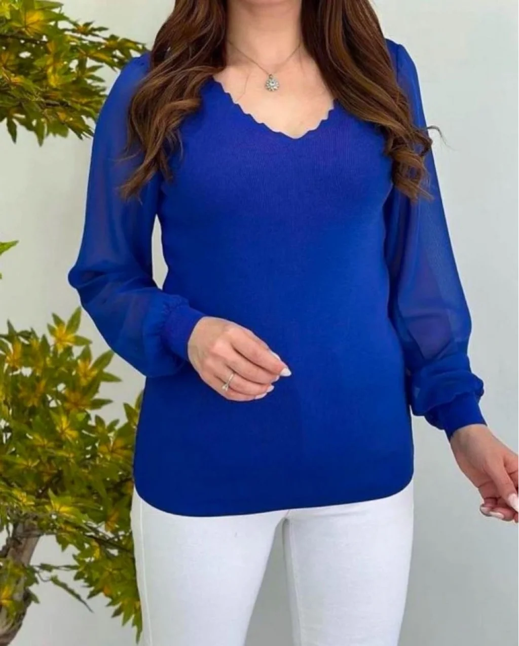 Kadın V Yaka Kolları Dökümlü Tül Detay Triko Bluz