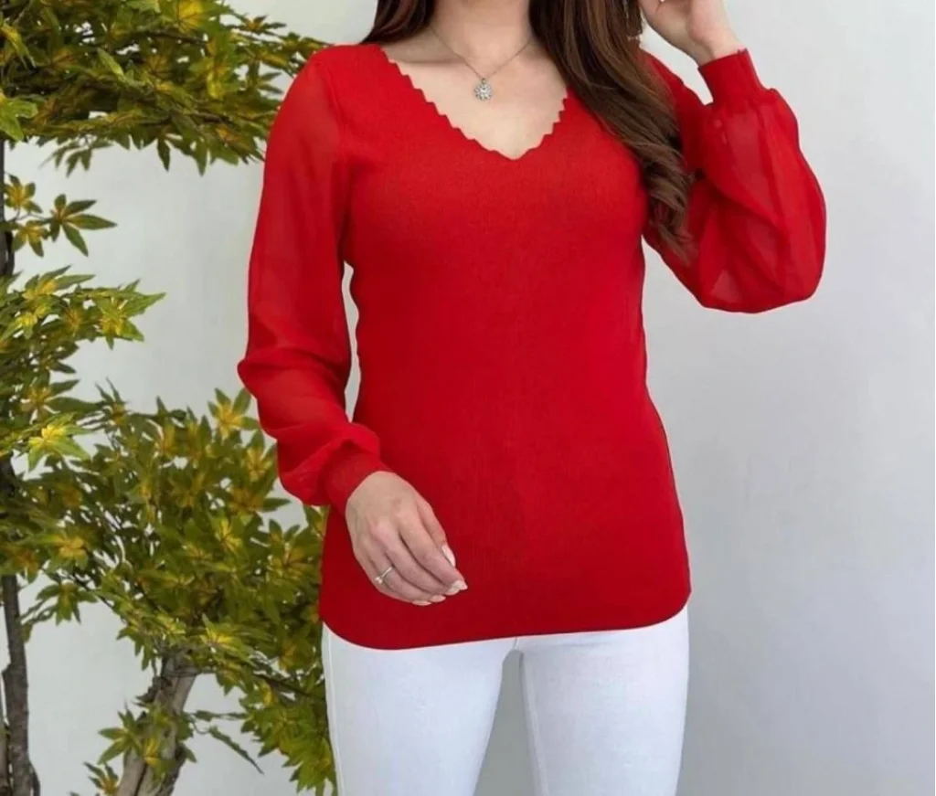 Kadın V Yaka Kolları Dökümlü Tül Detay Triko Bluz
