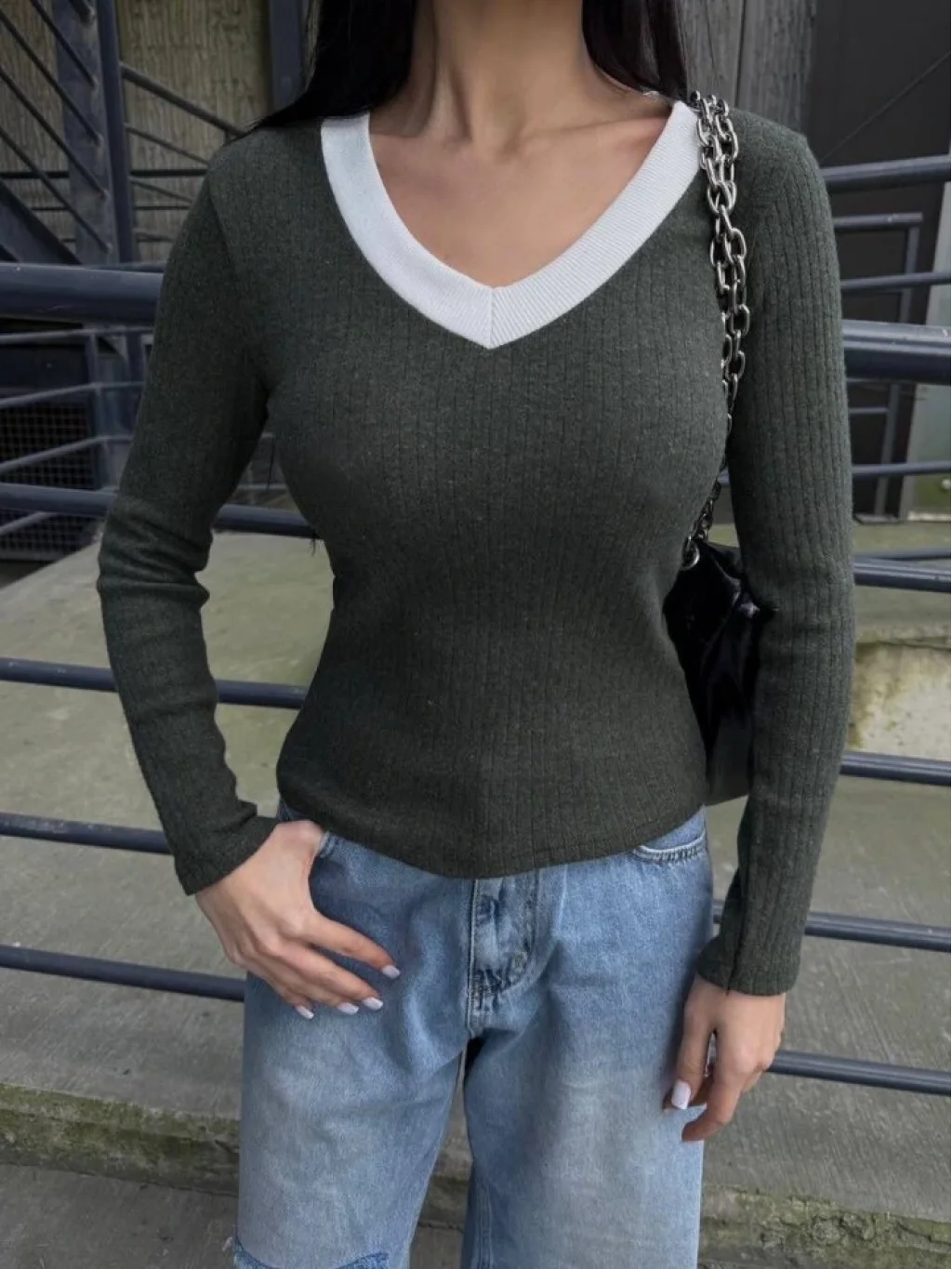 Kadın V Yaka Ribana Ve Garni Detay Sardonlu Kaşkorse Kumaş Bluz