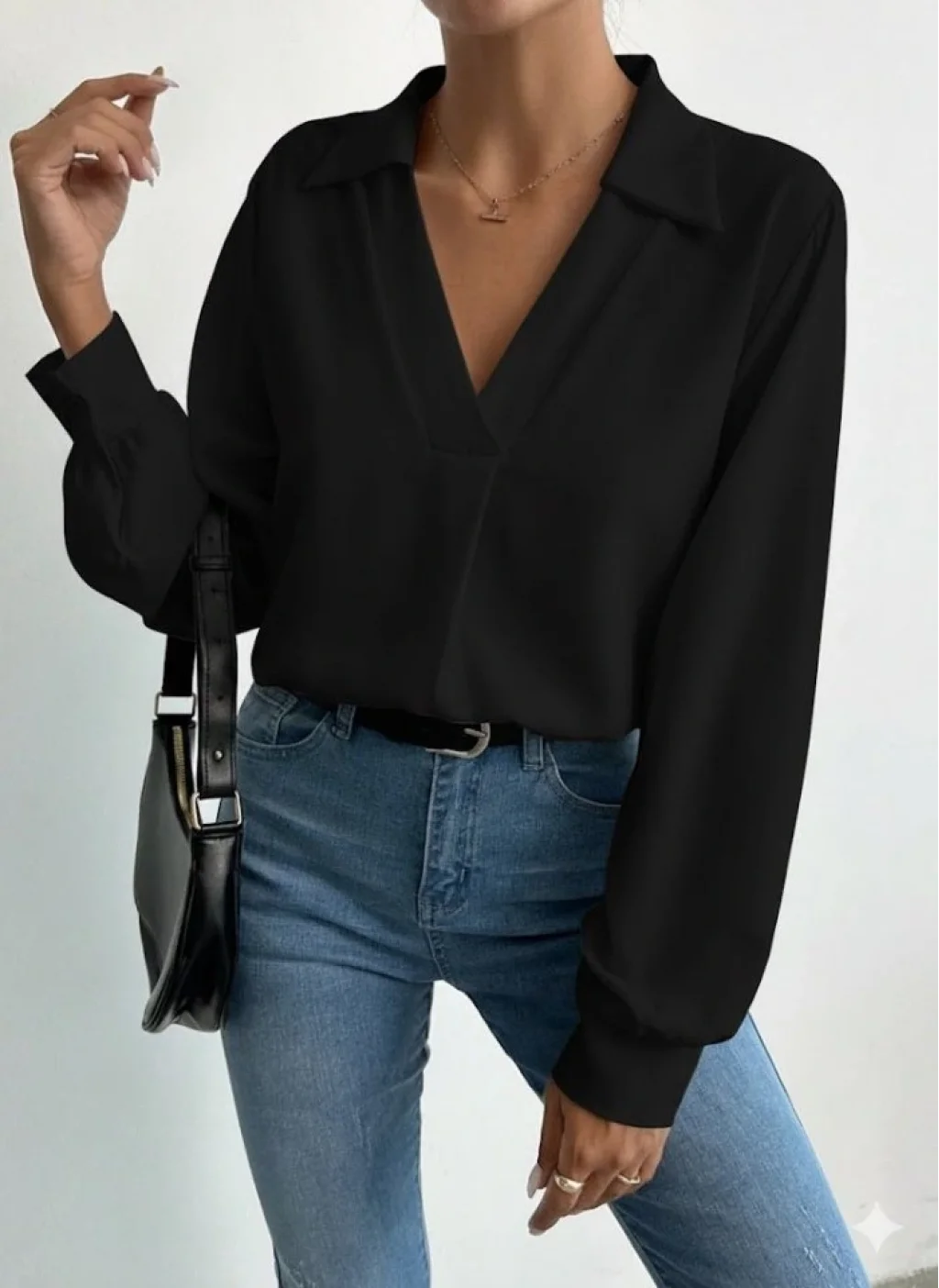 Kadın V Yaka Uzun Kollu Mosskrep Kumaş Bluz