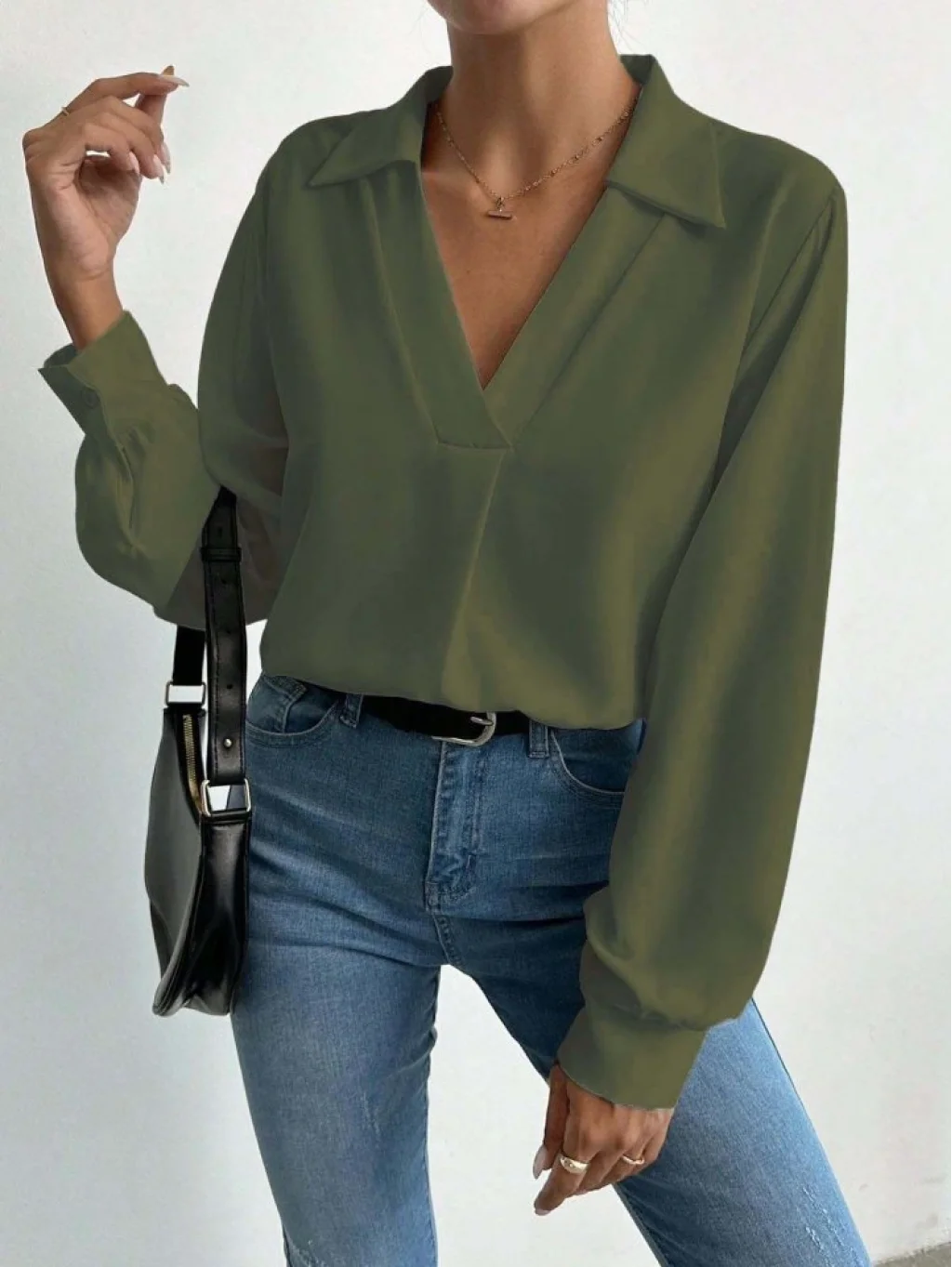 Kadın V Yaka Uzun Kollu Mosskrep Kumaş Bluz