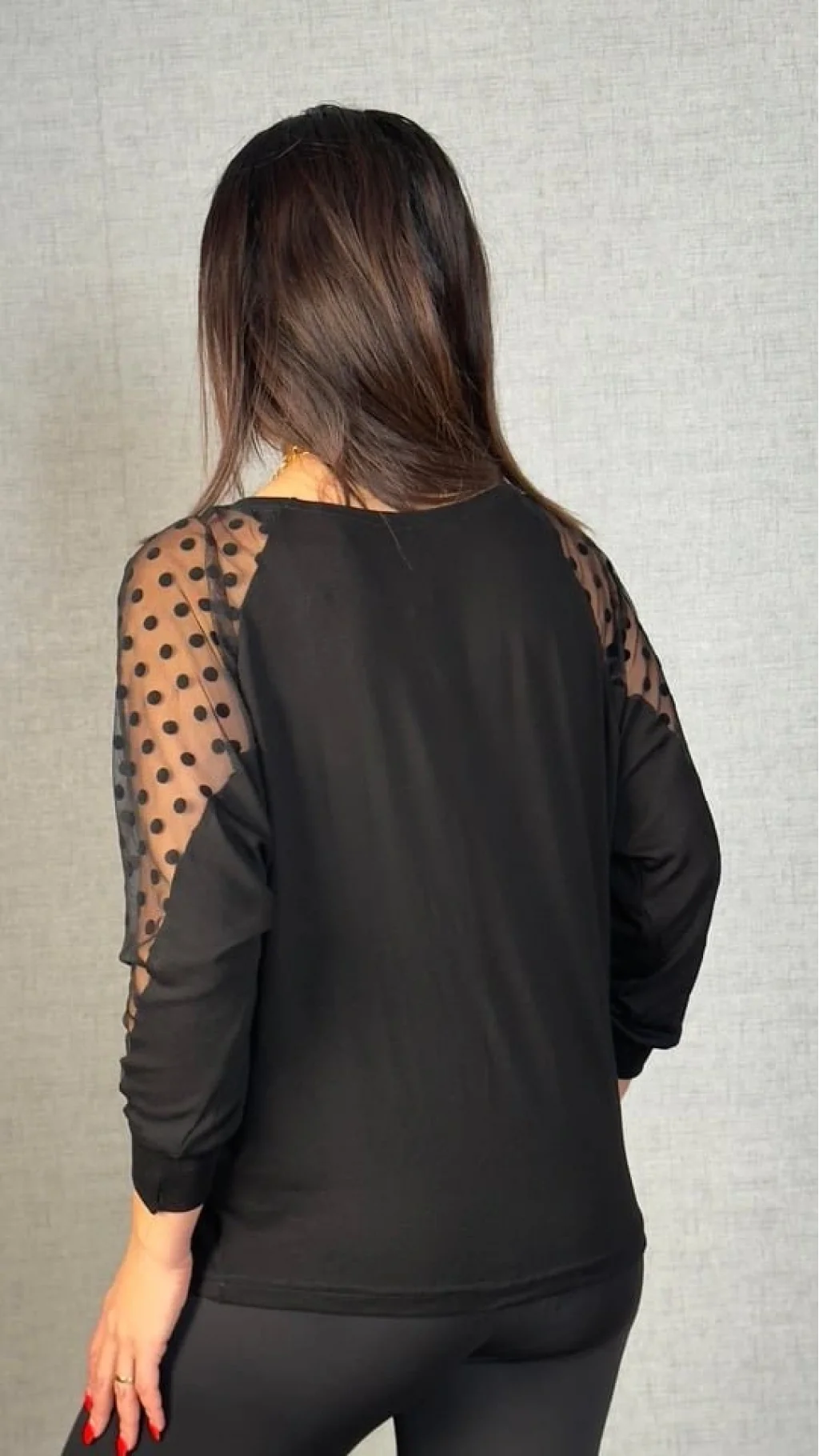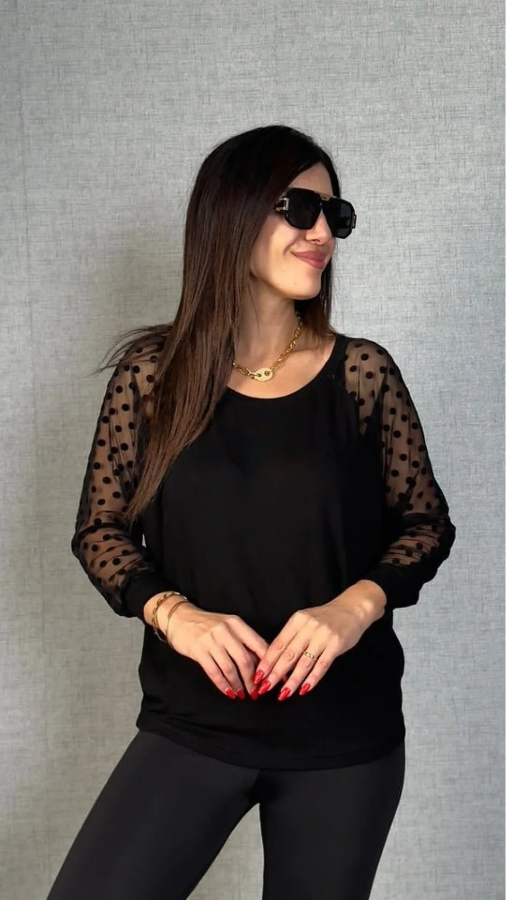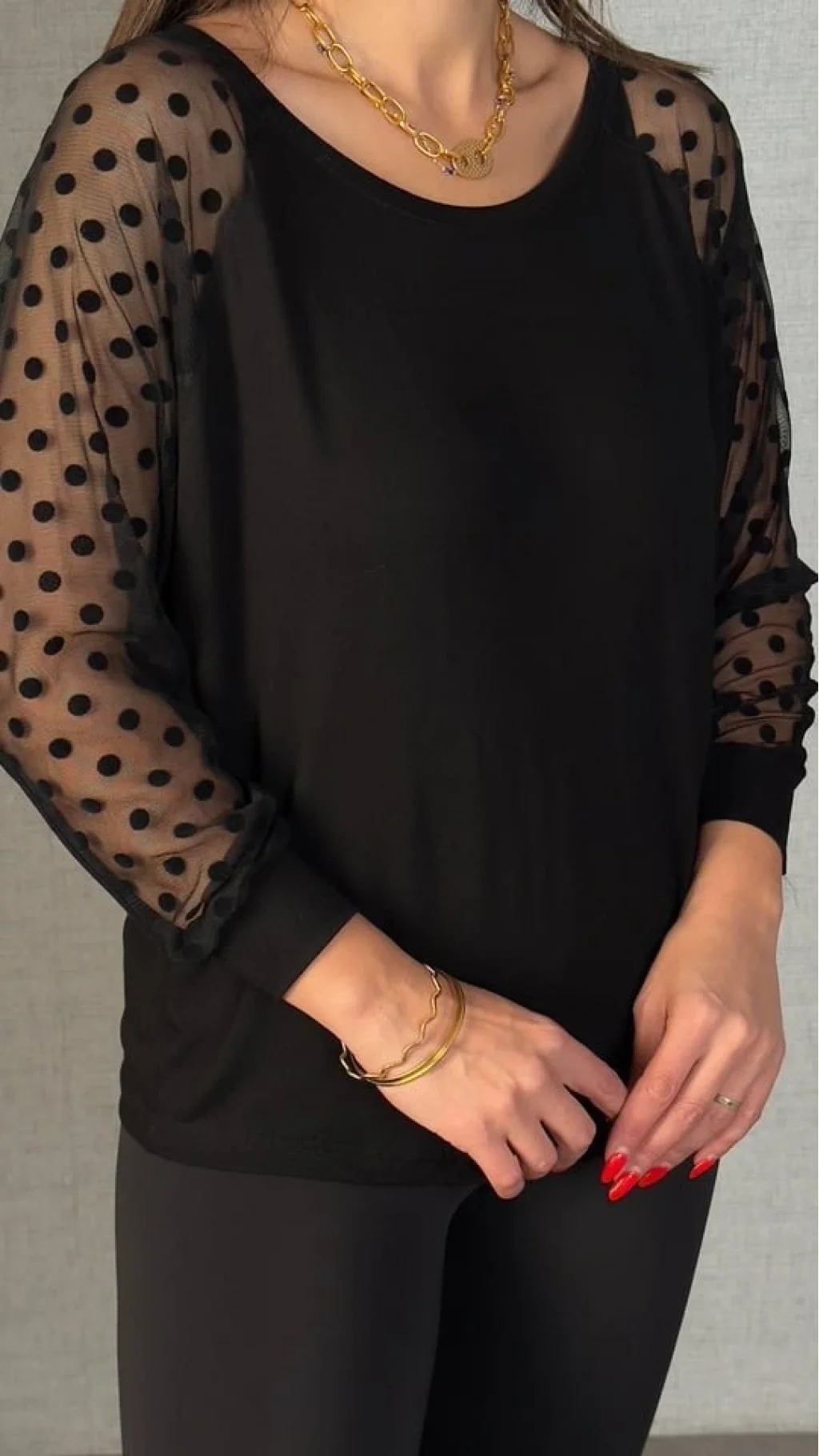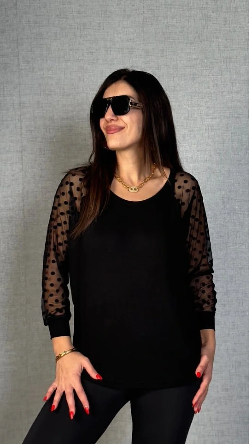 Kadın Yarasa Kol Puantiyeli Tül Detay Bluz