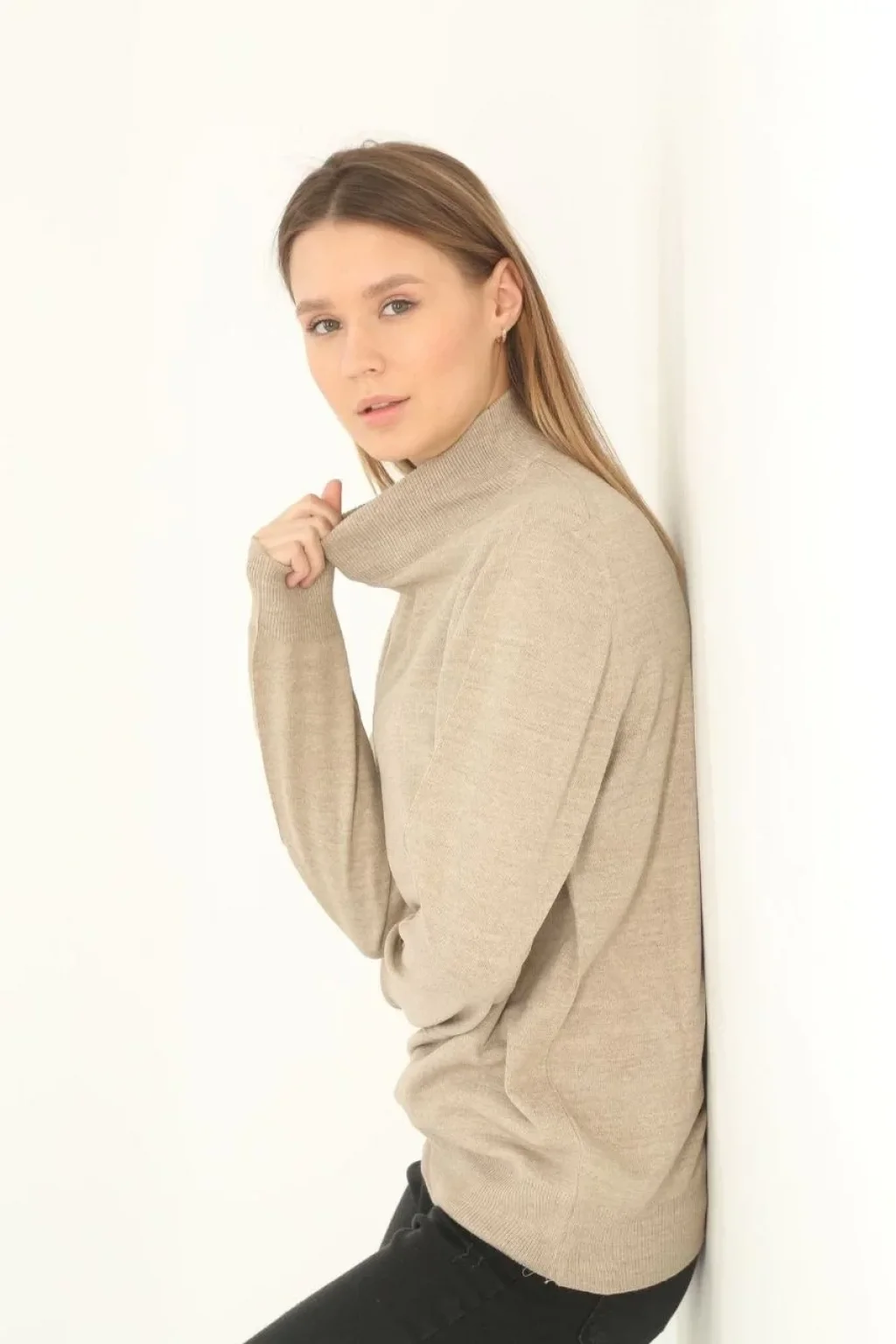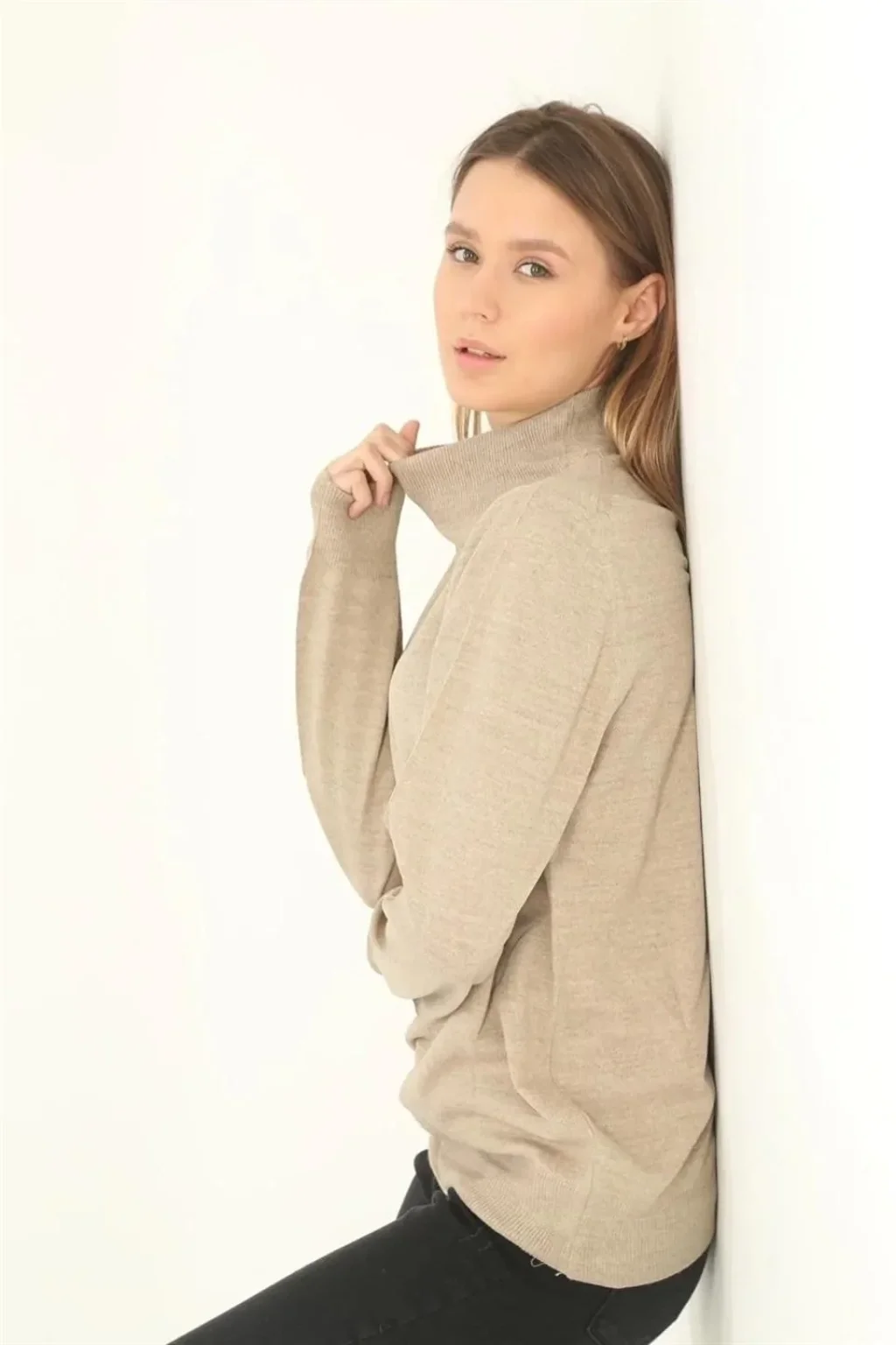 Kadın Yarım Balıkçı Yaka Triko Kazak - Bej