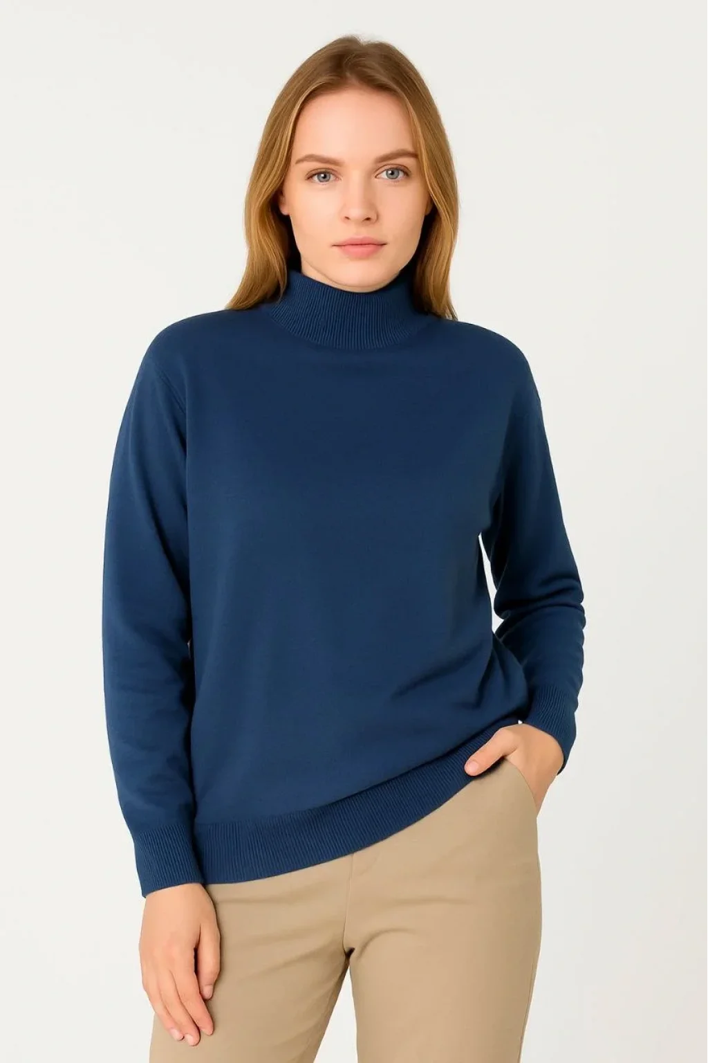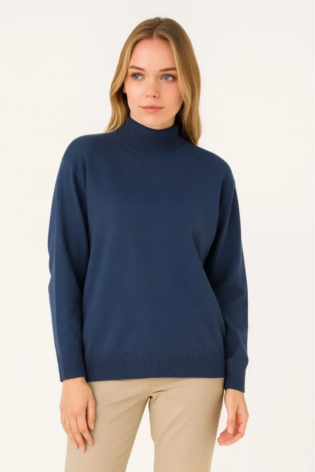 Kadın Yarım Boğaz Triko Kazak yumuşak dokulu Pamuklu ince Dokuma, uzun kollu Rahat Regular kalıp - İndigo
