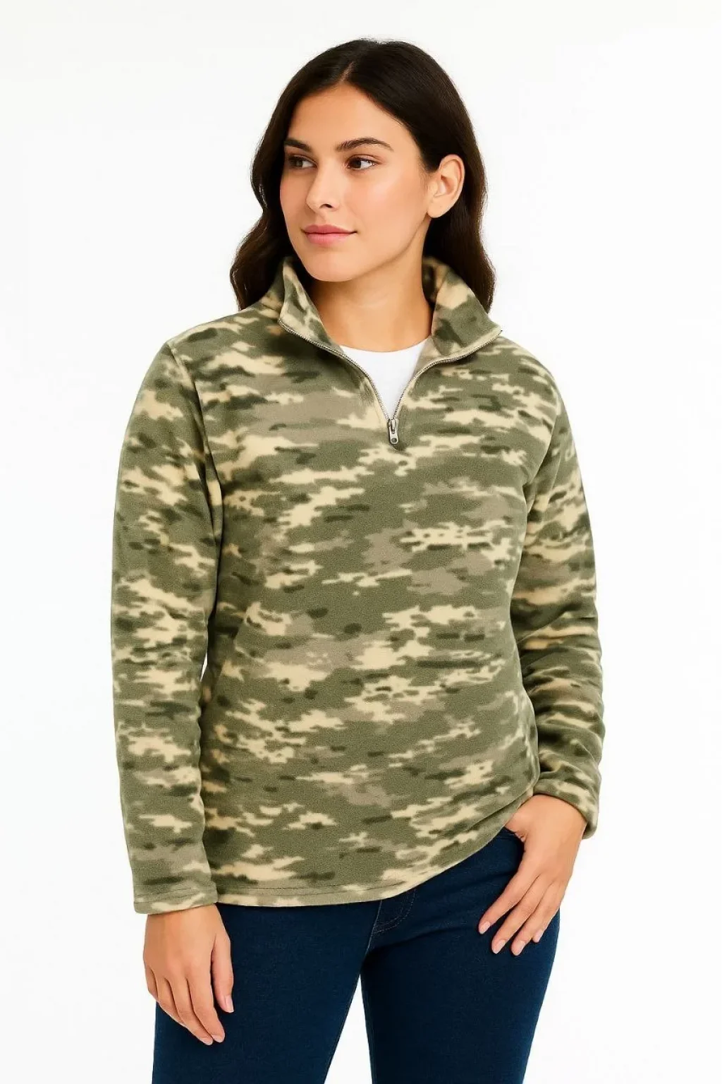 Kadın Yarım Fermuarlı Desenli Polar Sweat – Haki Kamuflaj Yakalı, Uzun Kollu, Oversize Rahat Kalıp - Haki