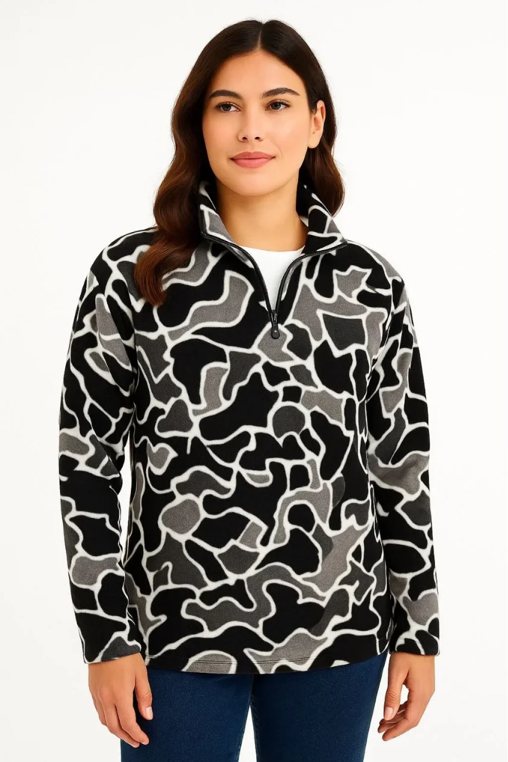 KADIN Yarım Fermuarlı Desenli Polar Sweat Yakalı, Uzun Kollu, Oversize Rahat Kalıp - Siyah