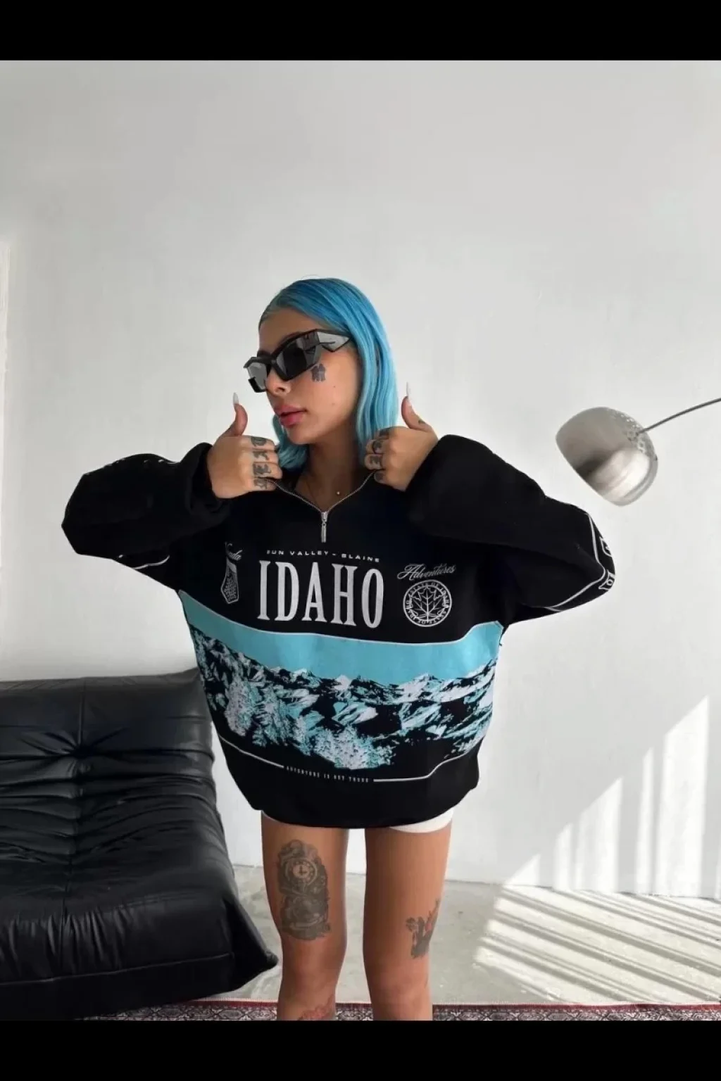 Kadın Yarım Fermuarlı Oversize Baskılı SweatShirt - Siyah