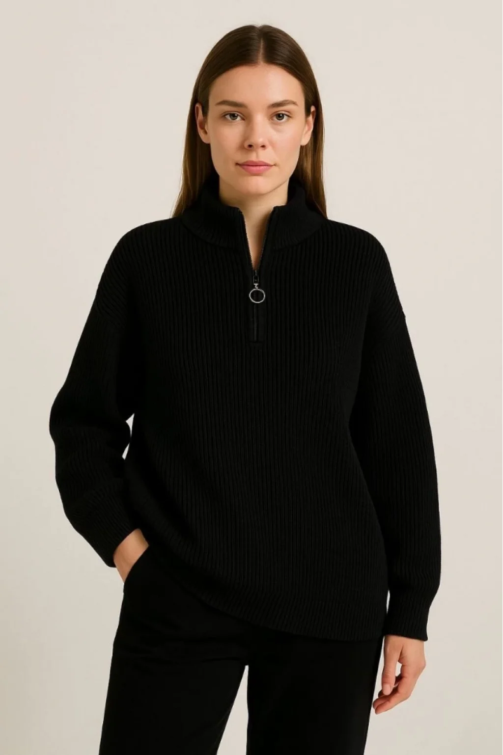 KADIN Yarım Fermuarlı Triko Kazak – Selanik Örgü, Dik Yaka, Pamuklu Dokuma, Oversize Uzun Kollu Kışlık Model - Siyah