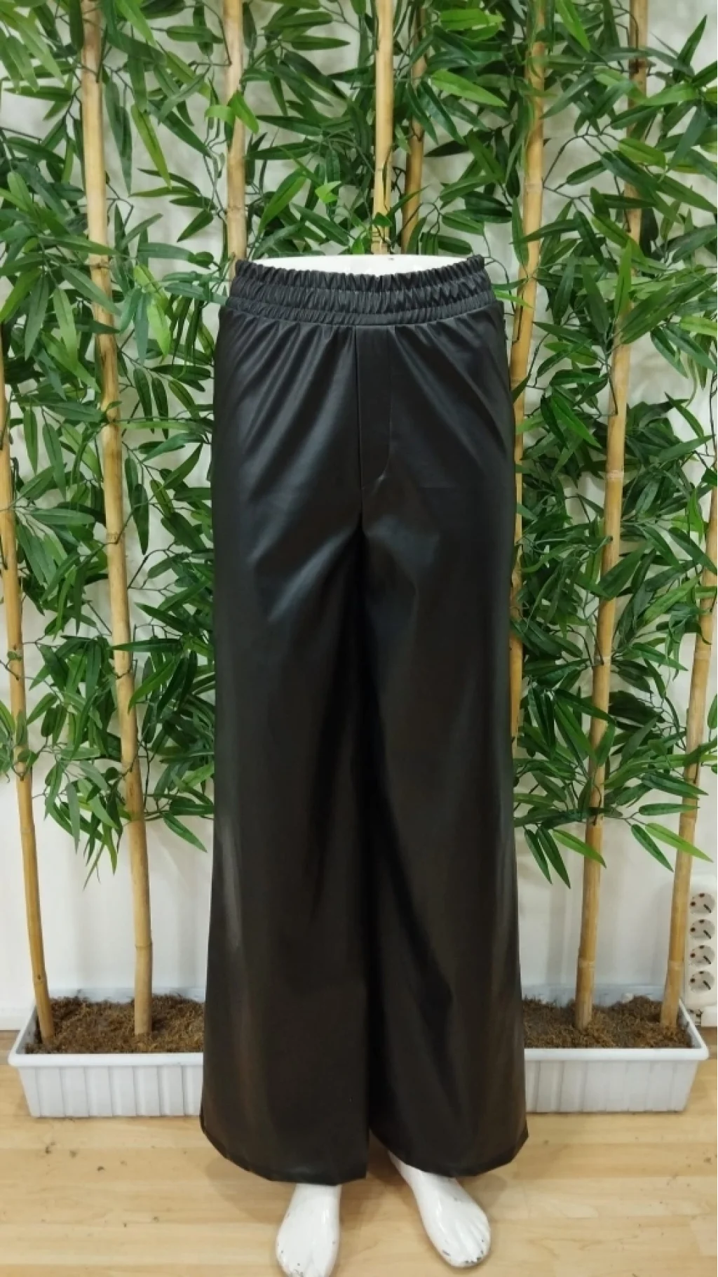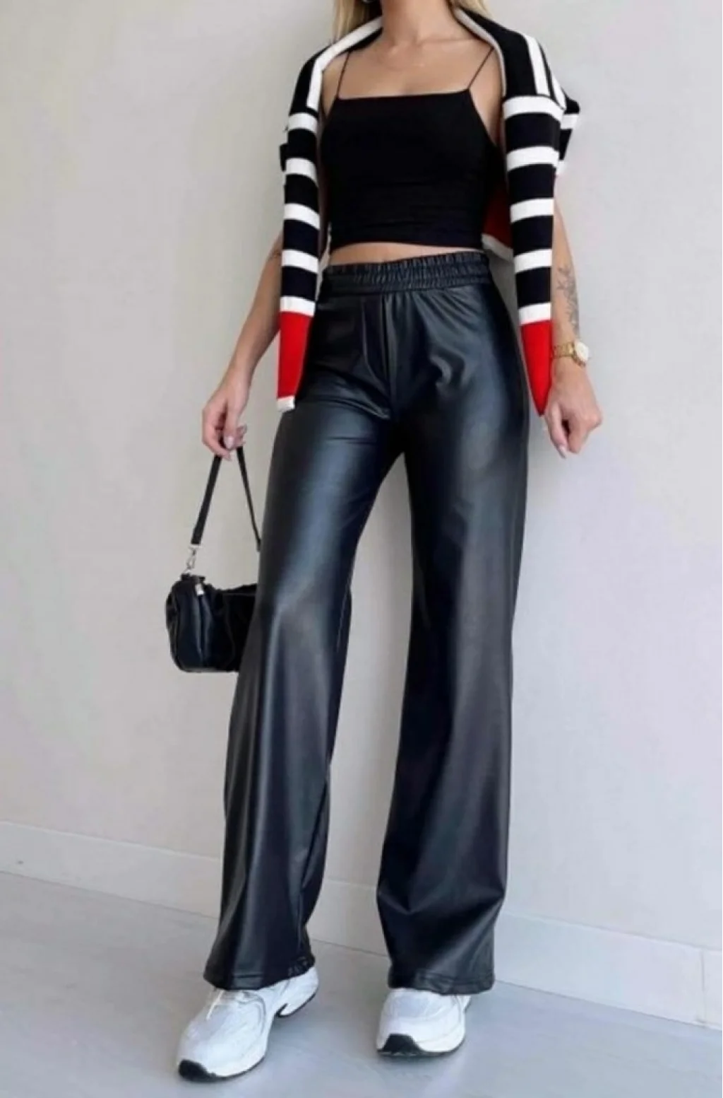 Kadın Yüksek Bel Beli Lastikli Geniş Paçalı Deri Pantolon