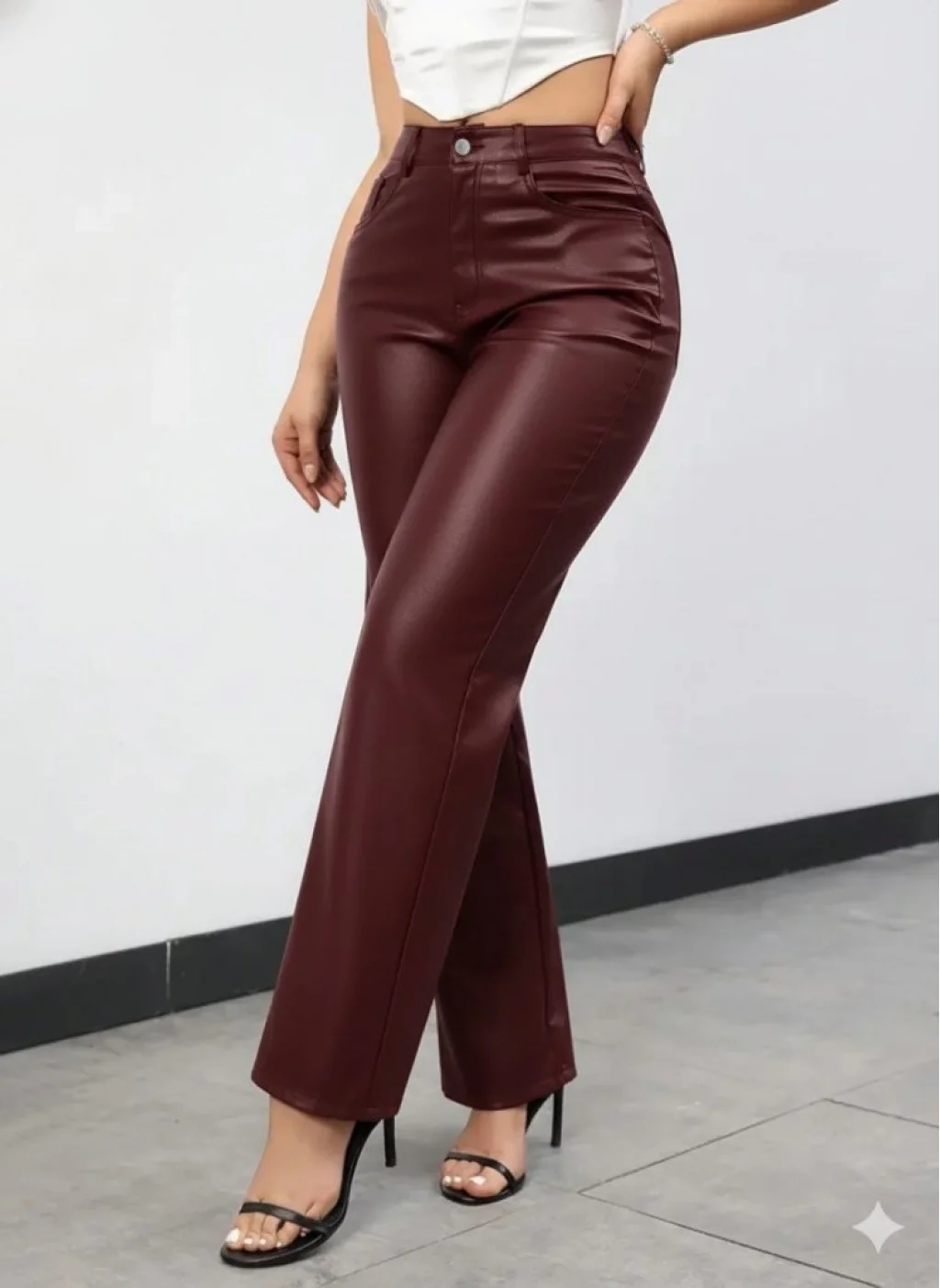 Kadın Yüksek Bel Cepli Deri Pantolon
