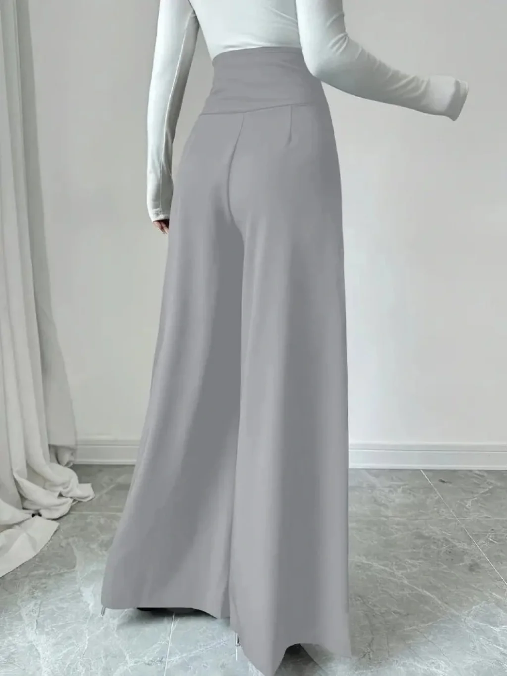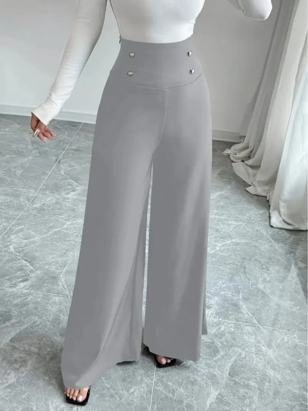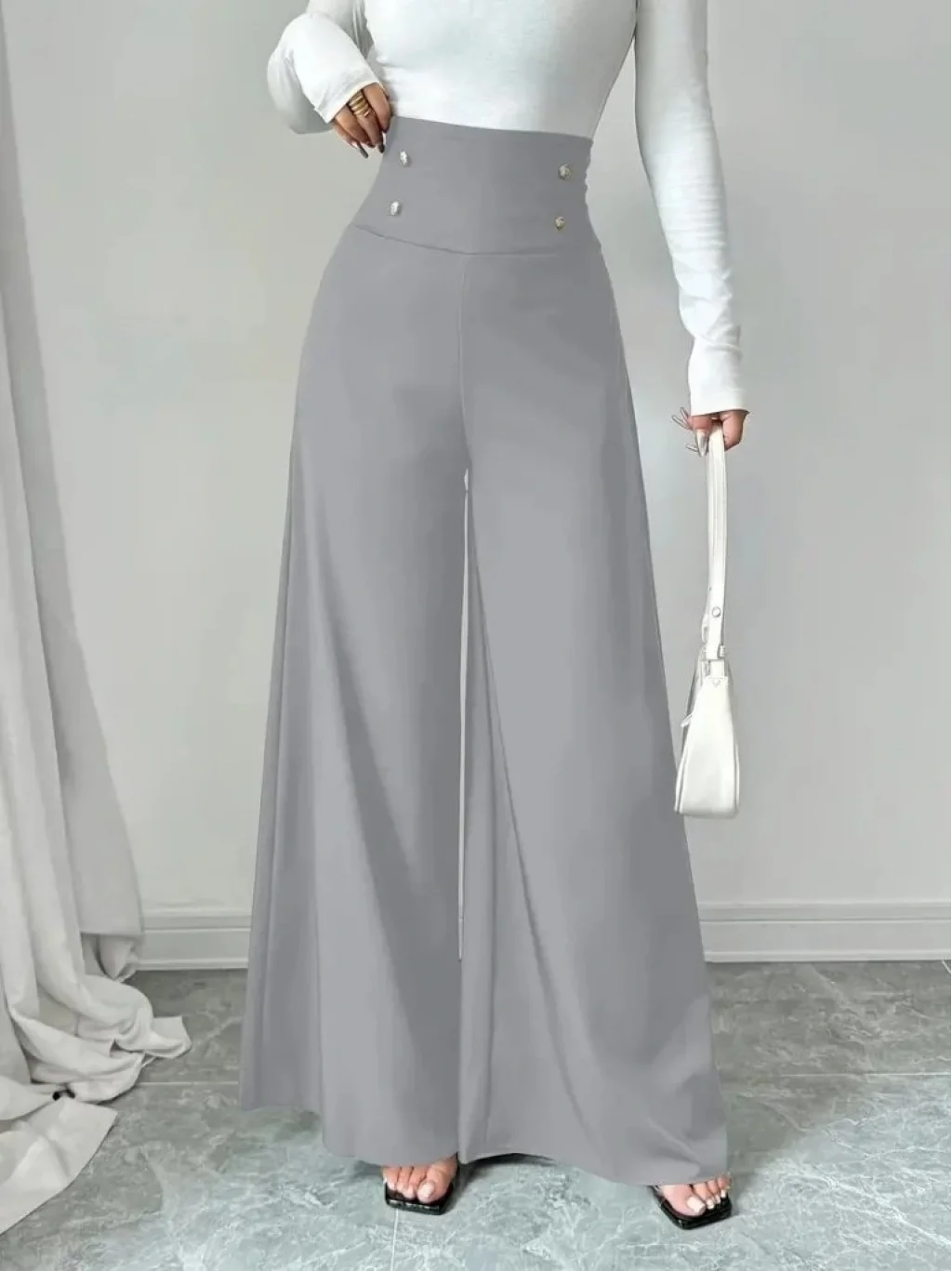 Kadın Yüksek Bel Düğmeli Geniş Paçalı Ithal Krep Pantolon
