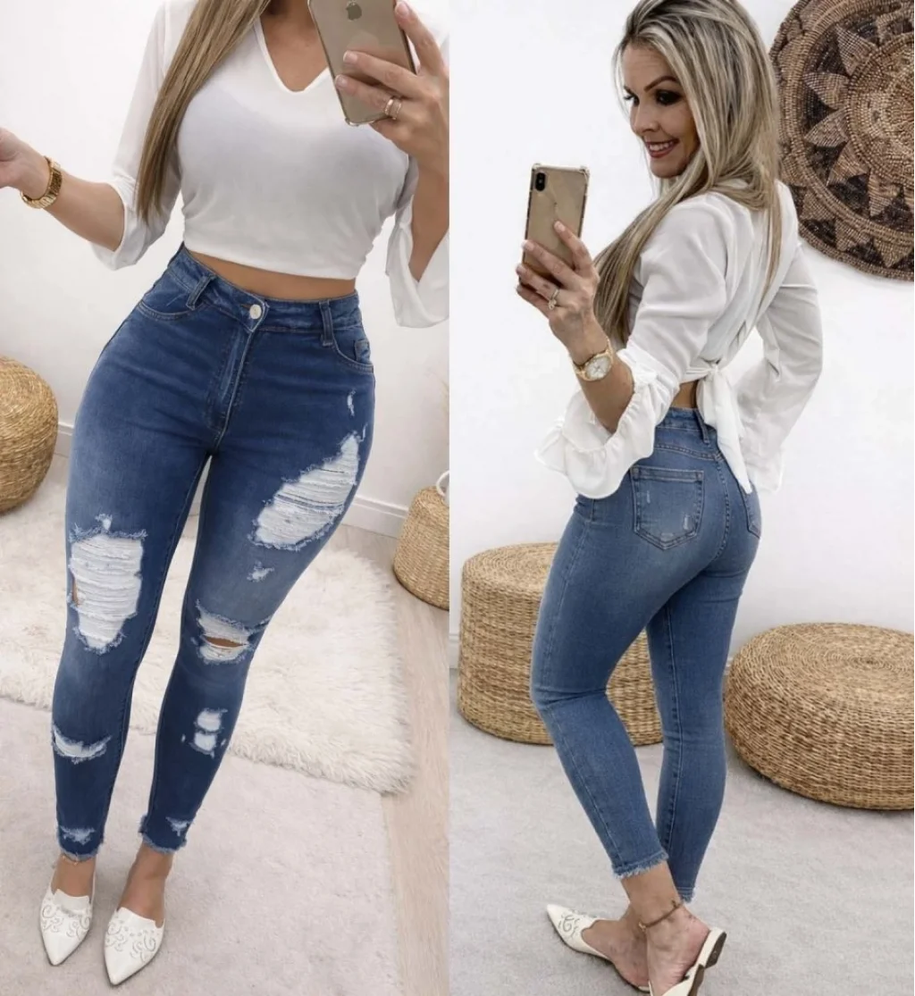 Kadın Yüksek Bel Düğmeli Yırtık Kot Pantolon