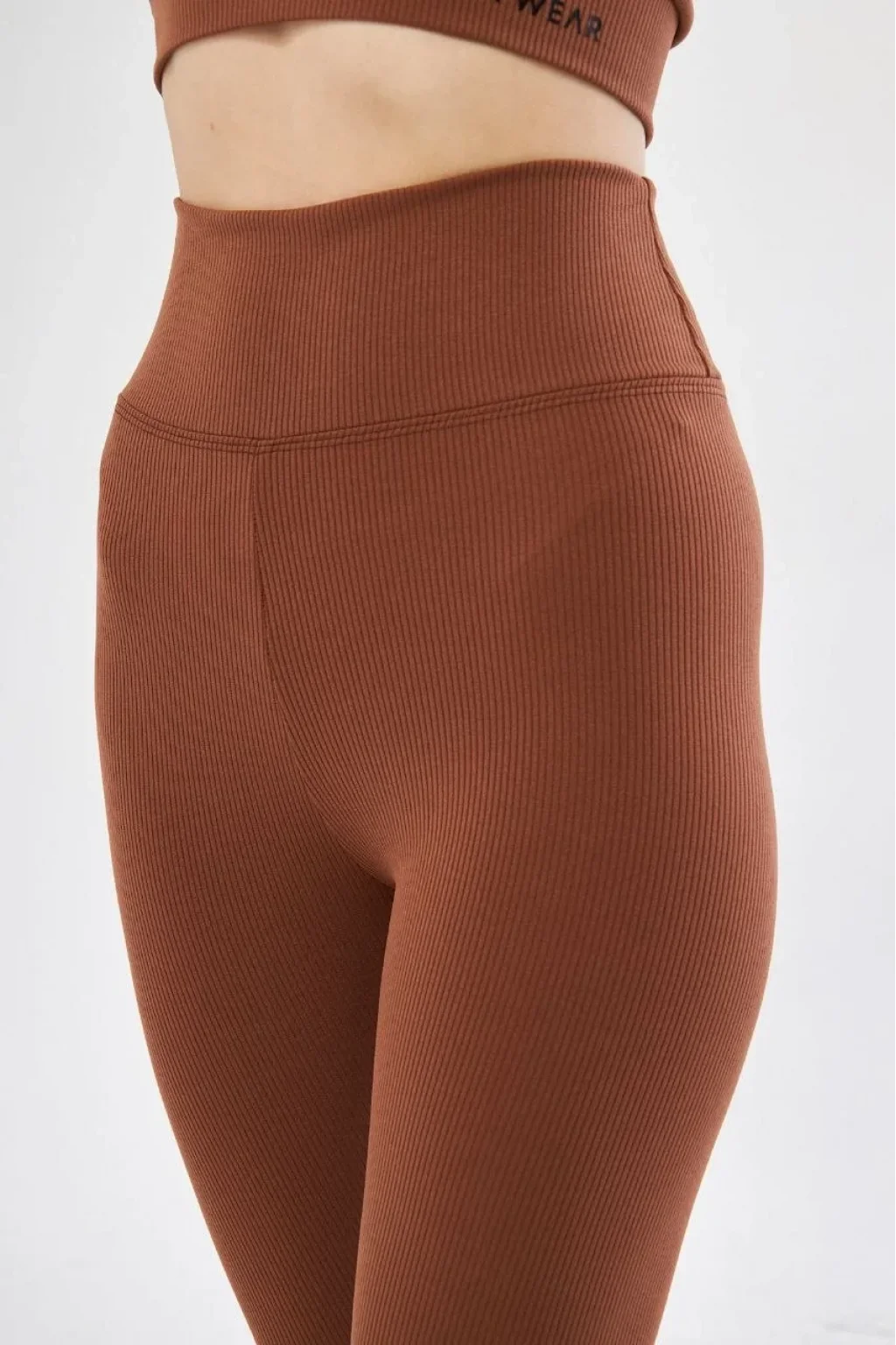 Kadın Yüksek Bel Fitilli Battal Tayt - Kahve