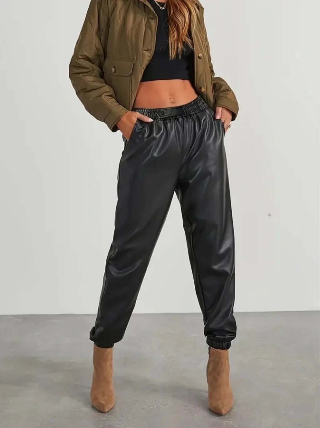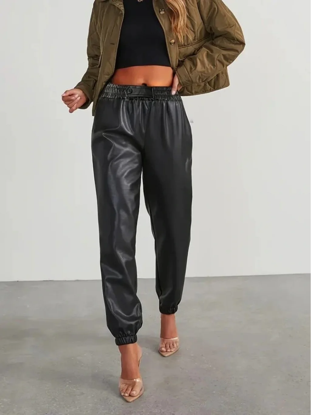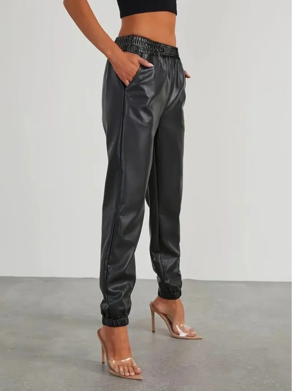 Kadın Yüksek Bel Lastikli önü Düğmeli Deri Pantolon