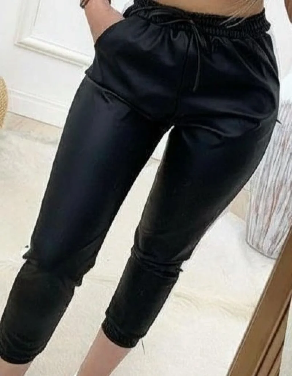 Kadın Yüksek Bel Lastikli Yan şerit Detaylı Deri Pantolon