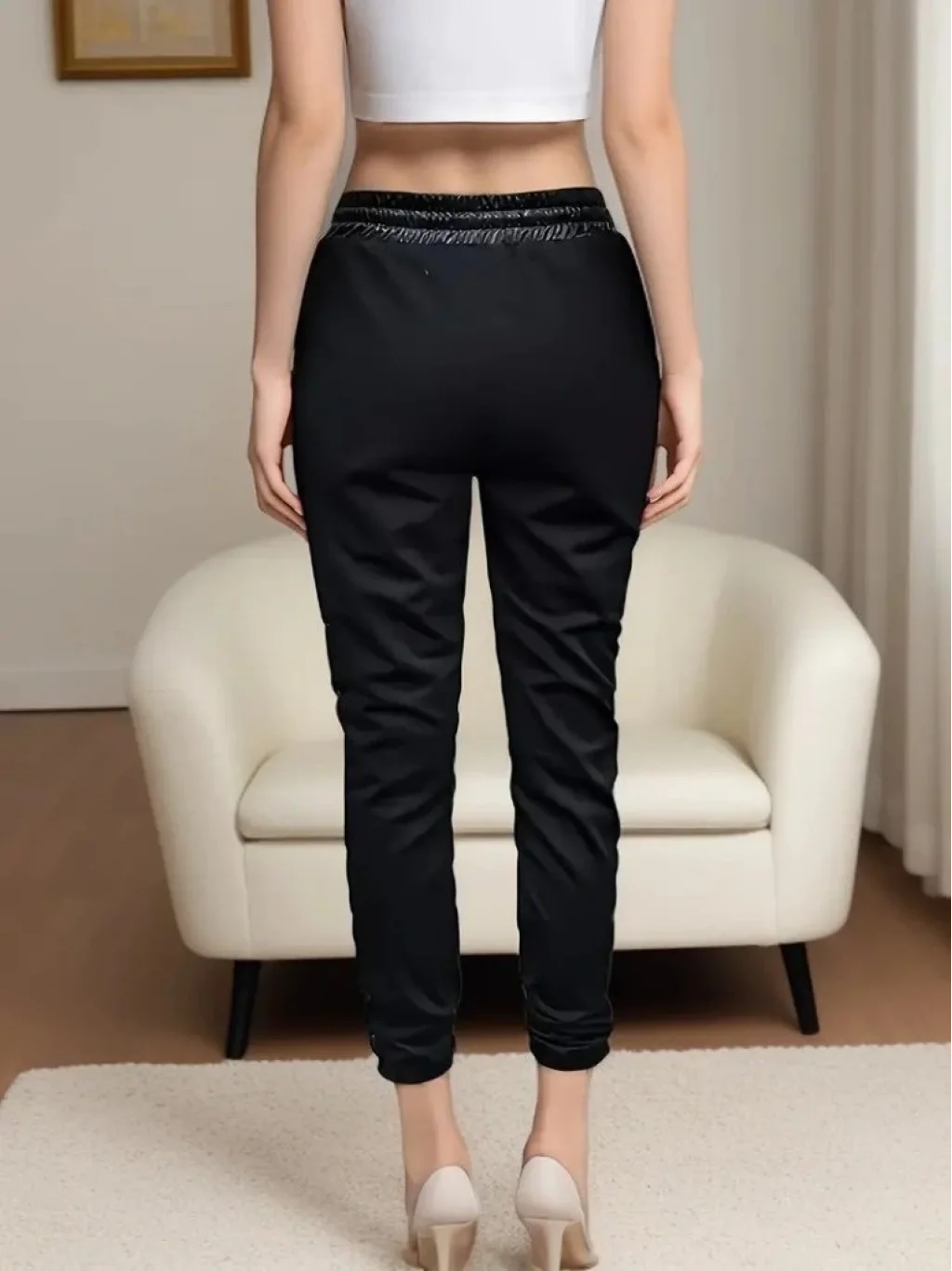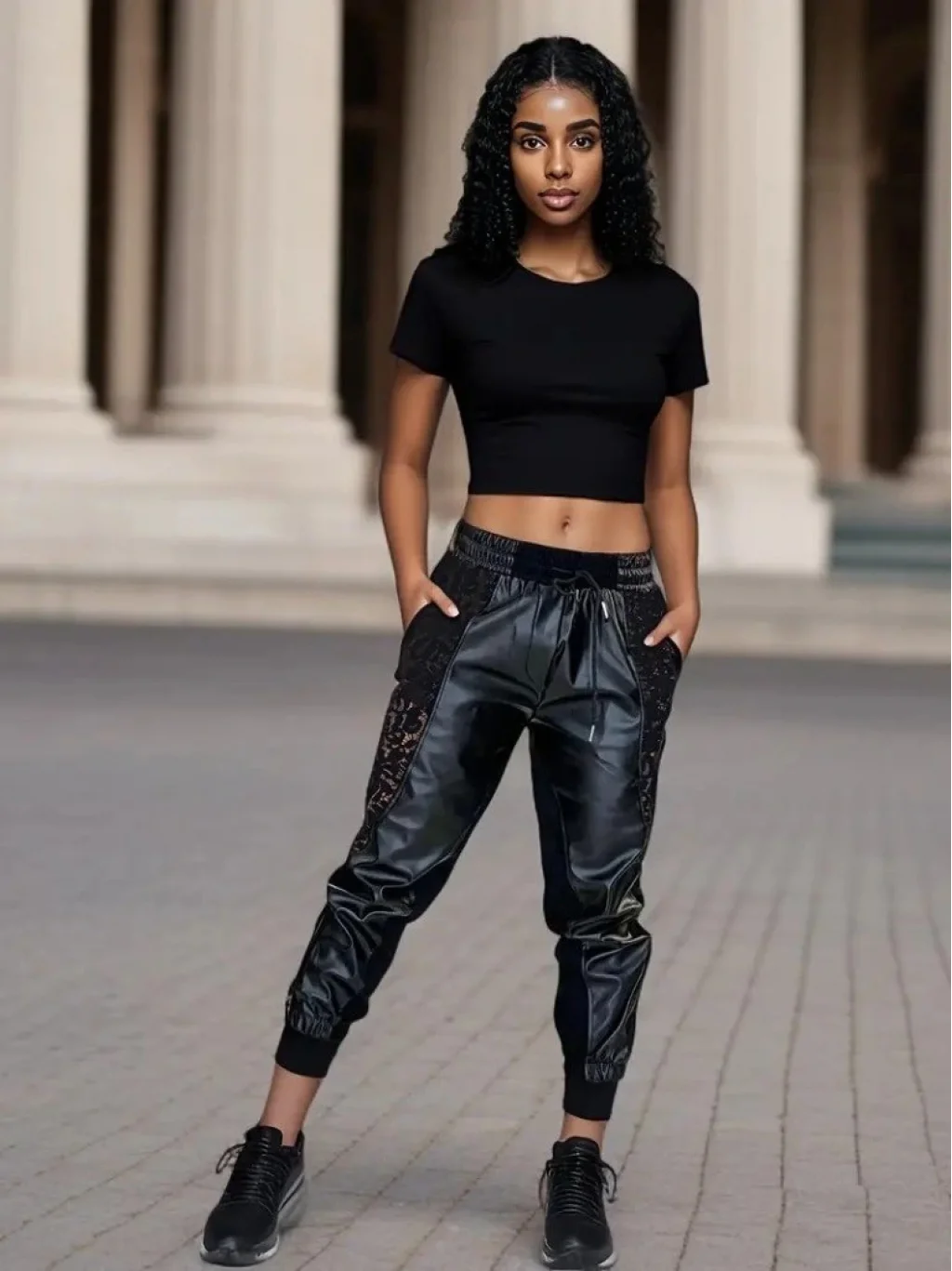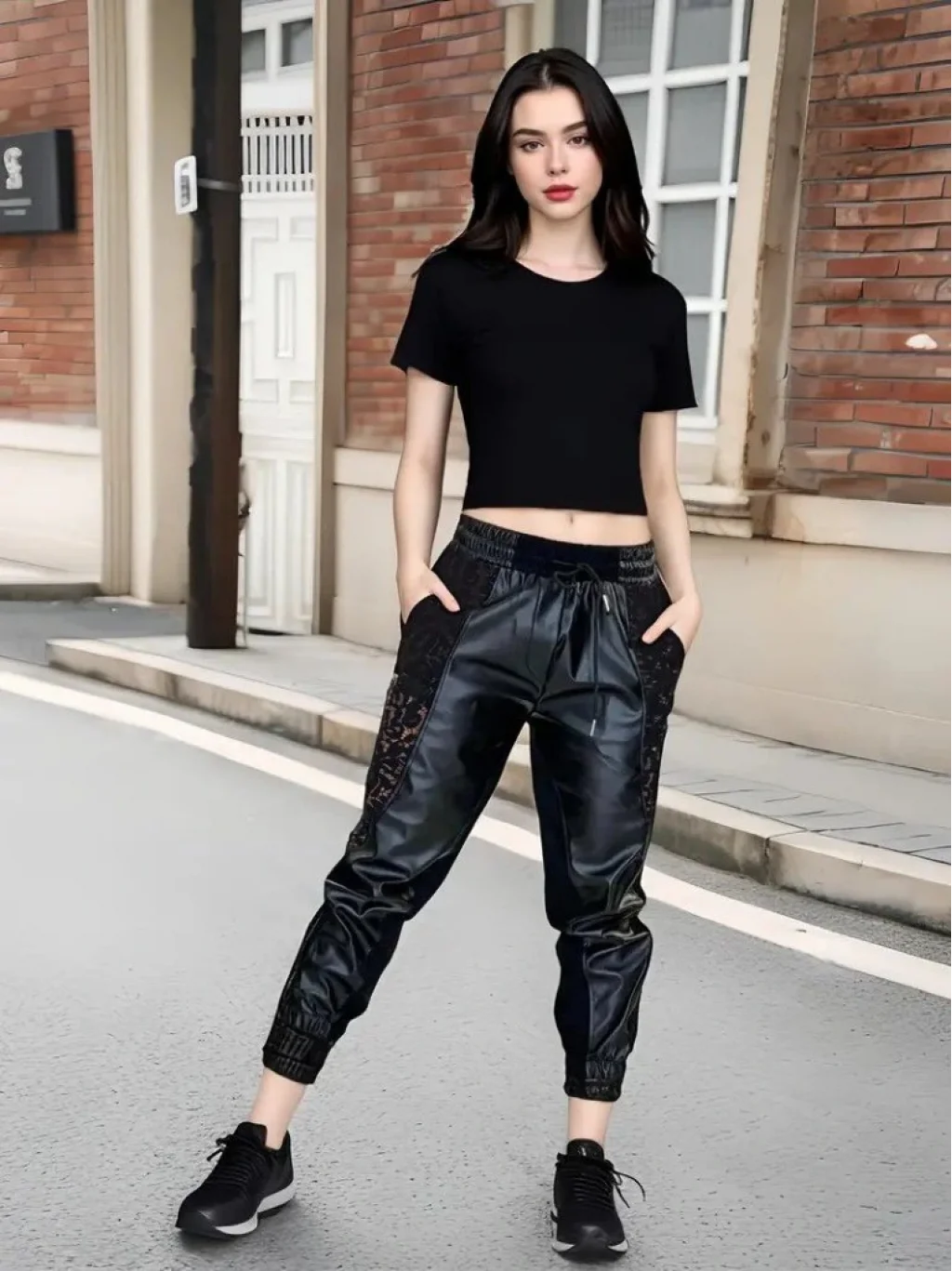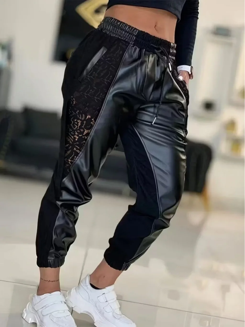 Kadın Yüksek Bel Lastikli Yanda Dantel Detaylı Bağcıklı Deri Pantolon