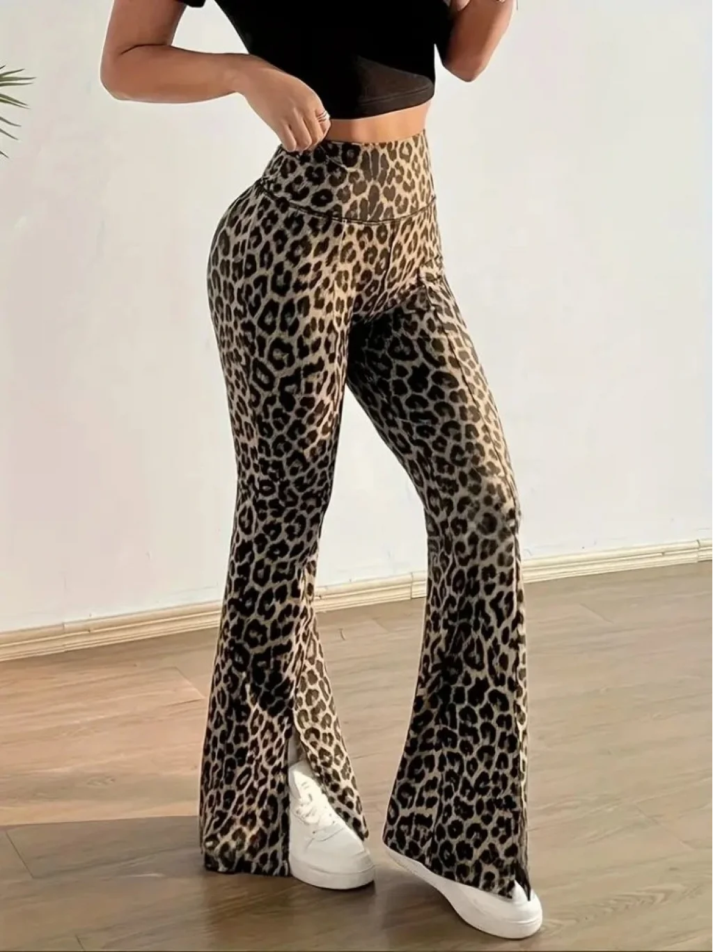 Kadın Yüksek Bel Leopar Desenli Yırtmaçlı Dalgıç Tayt