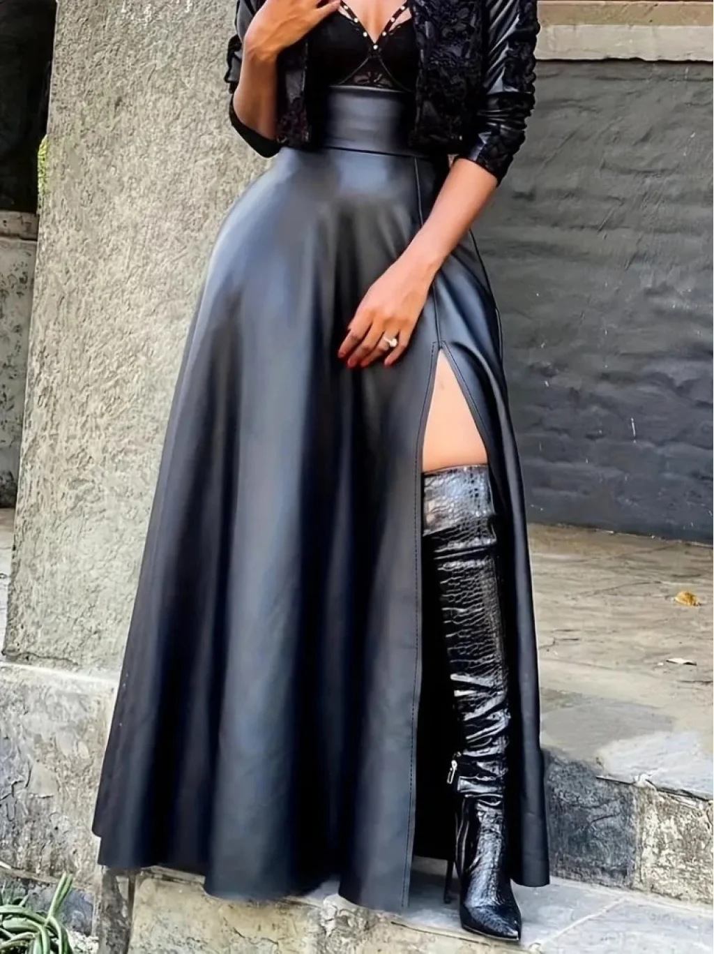 Kadın Yüksek Bel Uzun Yırtmaçlı Deri Etek