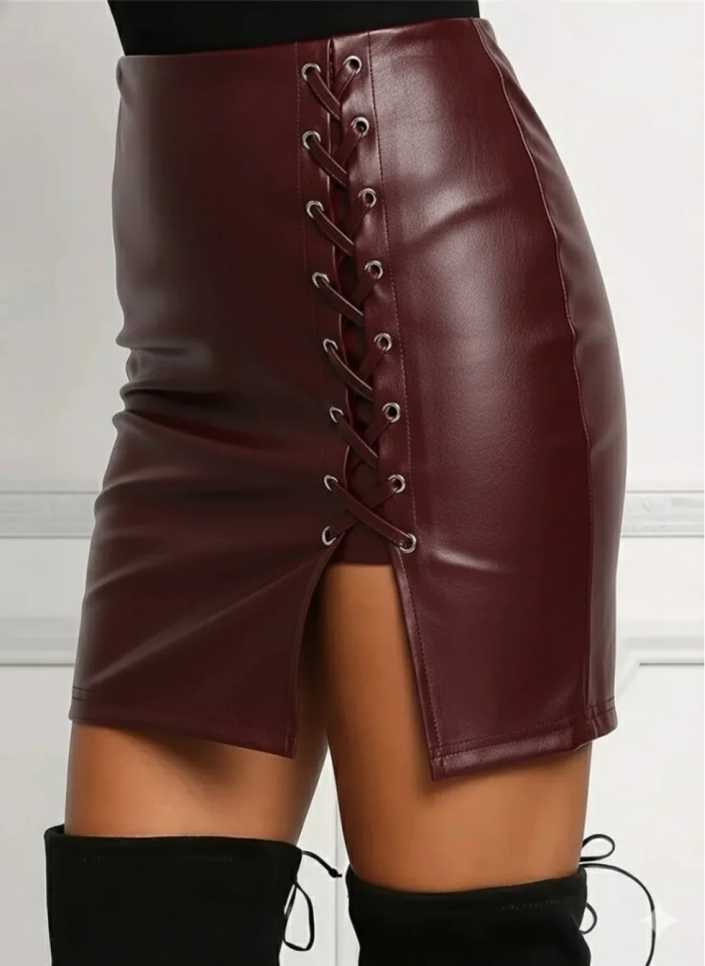 Kadın Yüksek Bel Yandan çapraz Bağcıklı Yırtmaçlı Mini Deri Etek